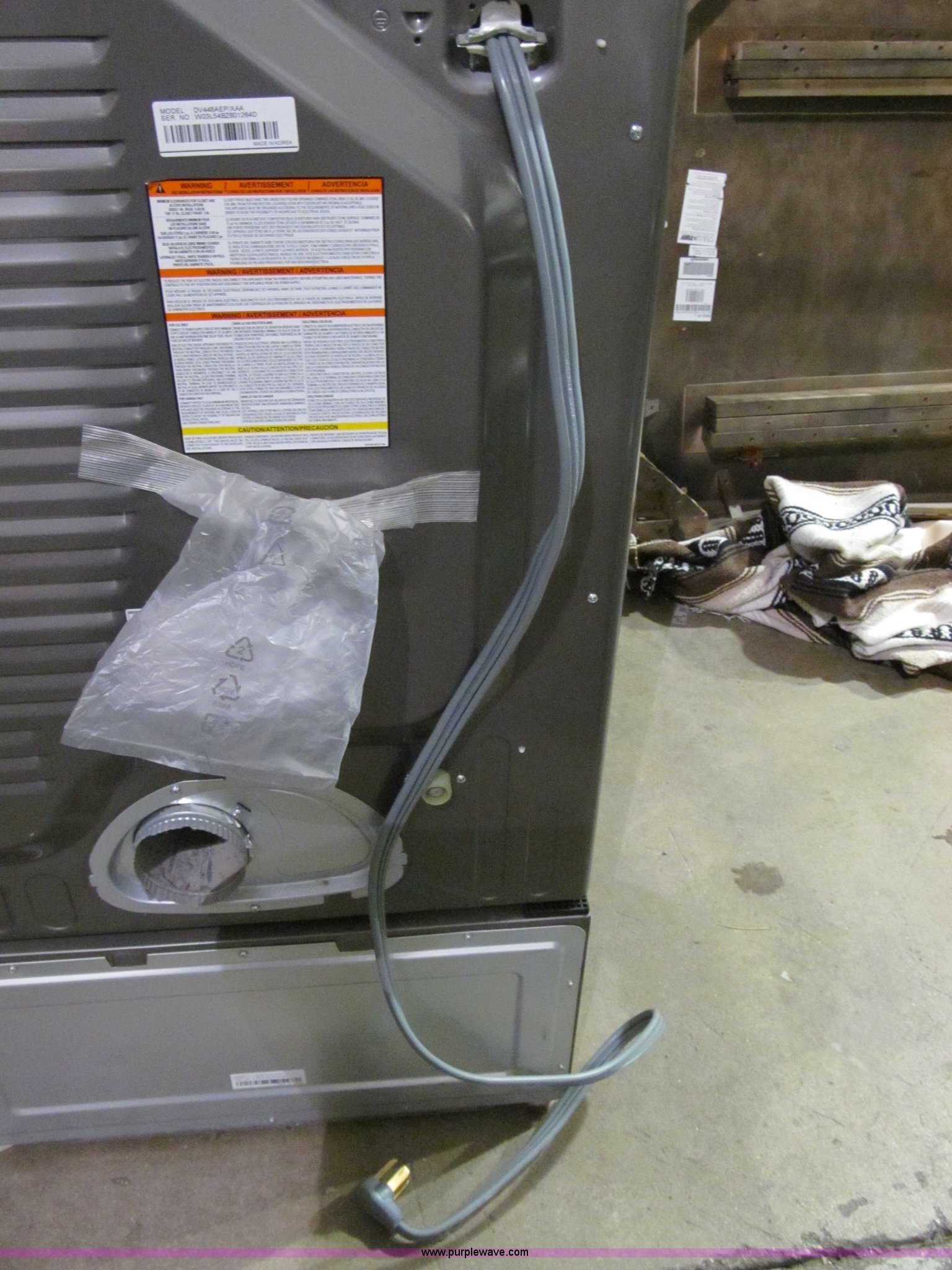 Purple Wave is selling a used Appliances in Kansas. This item is a Samsung stainless steel front load dryer with pedestal with the following: Power cord, Manual, Steam, Model DV448AEPXAA, Serial W03L54BZ601264D