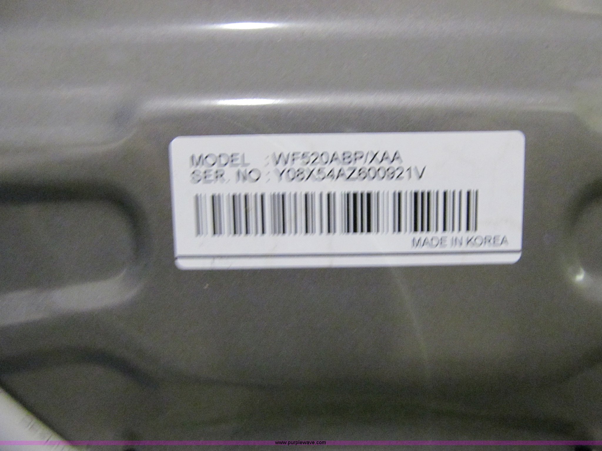 Purple Wave is selling a used Appliances in Kansas. This item is a Samsung stainless steel front load washer with pedestal with the following: Manual, Hot/cold water lines, Drain line, VRT plus steam, Model WF520ABPXAA, Serial Y08X54AZ600921V