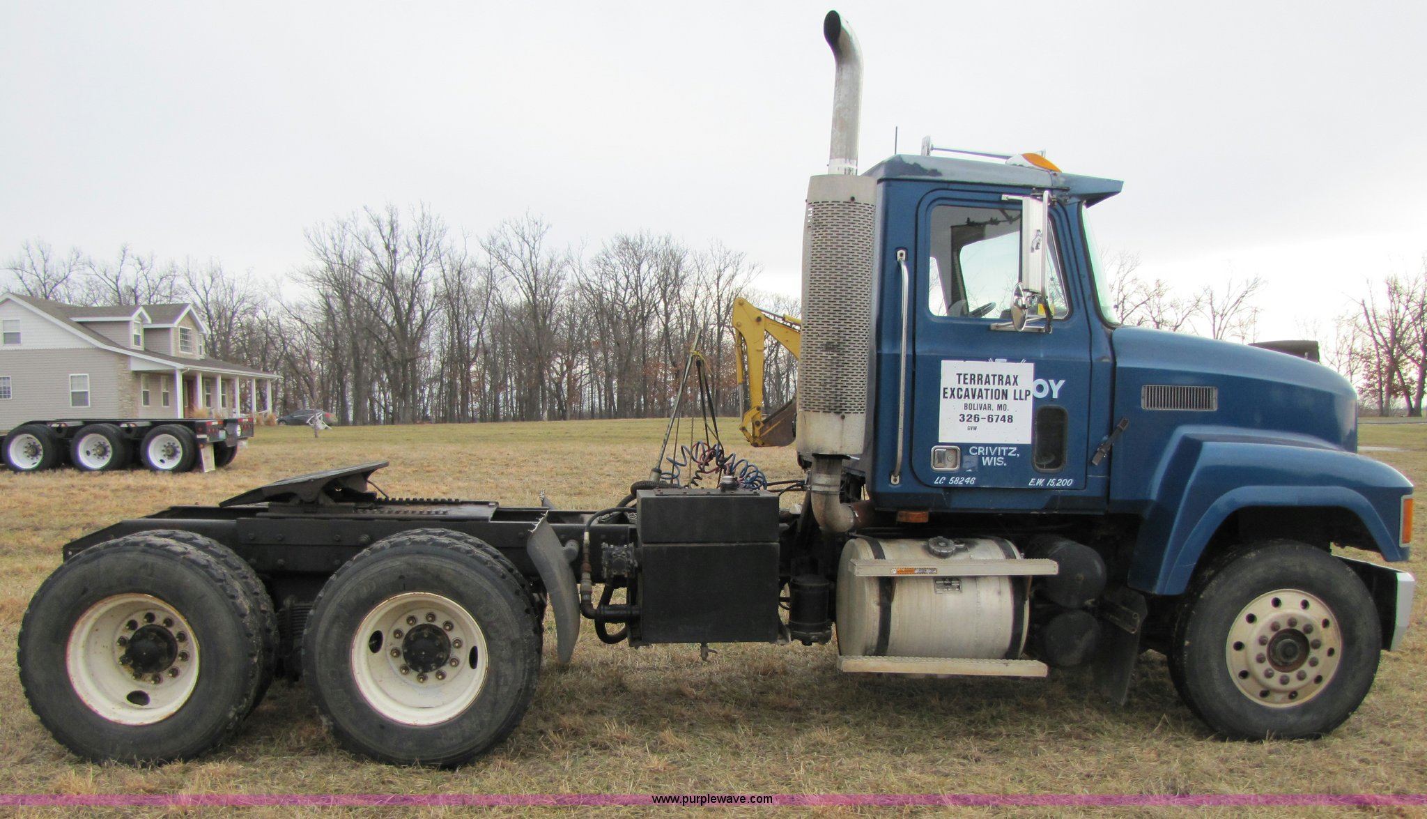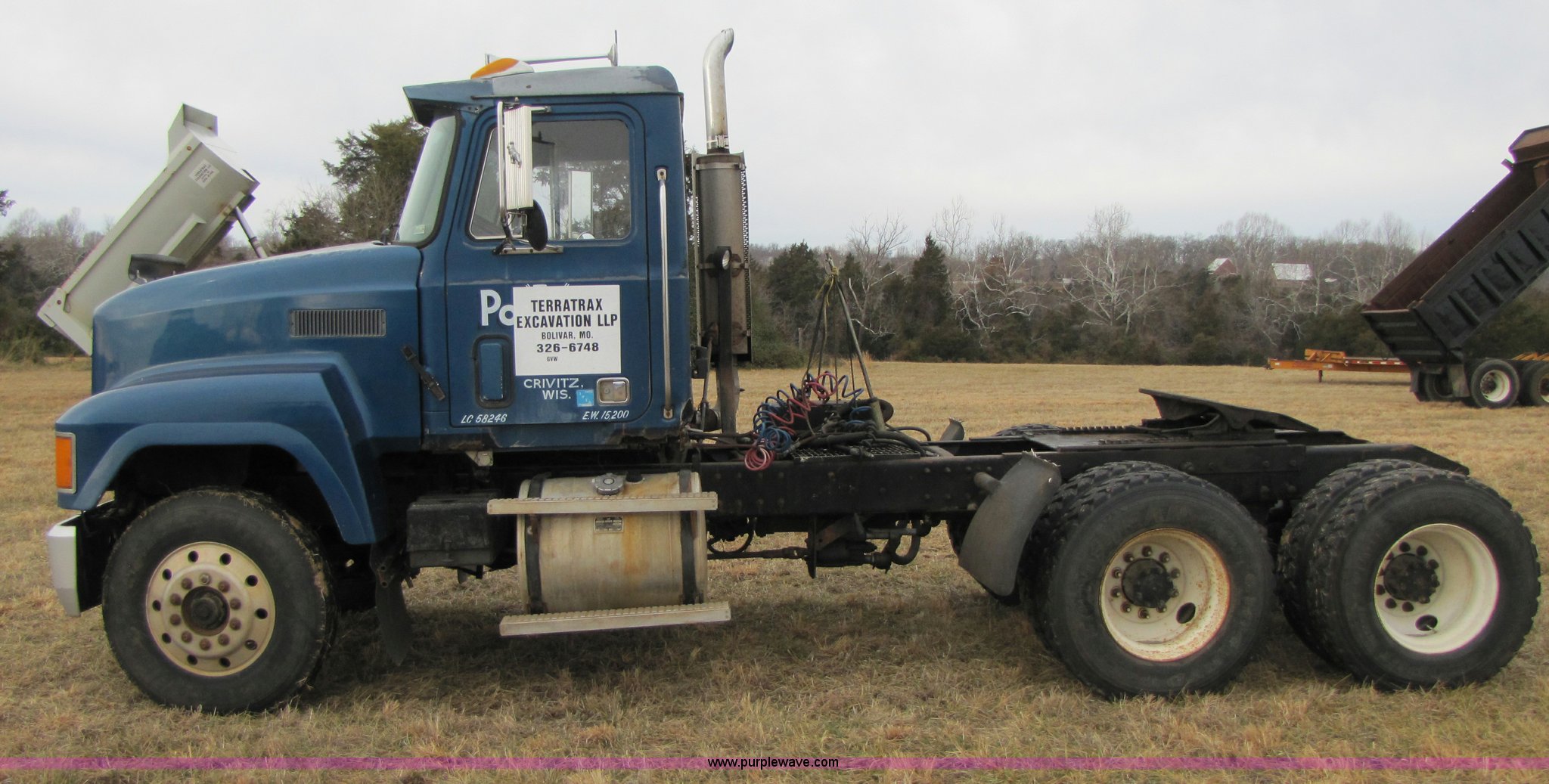 1990 Mack CH613 semi truck. 958,635 miles on odometer, Mack E6 six cylinder diesel engine, 18 speed manual transmission, Twin screw, AC and heat, AM/FM/Cassette, Heated mirrors, Air ride seat, Air ride cab, Exterior visor, Chrome bumper, Block heater, Sliding fifth wheel, Aluminum deck plate, Trailer wiring, Dual 68 gallon fuel tanks, Spring suspension, PTO, Air brakes, Wet kit, 11R22.5 tires, GVWR 54,000 lbs, FAWR 12,000 lbs, IAWR 21,000 lbs, RAWR 21,000 lbs, 192" wheelbase, Some rust. 1M2AA06Y2LW002201. Shipping quotes available. Terratrax Excavation LLC. 1361 E 454th Rd. Bolivar, MO 65613