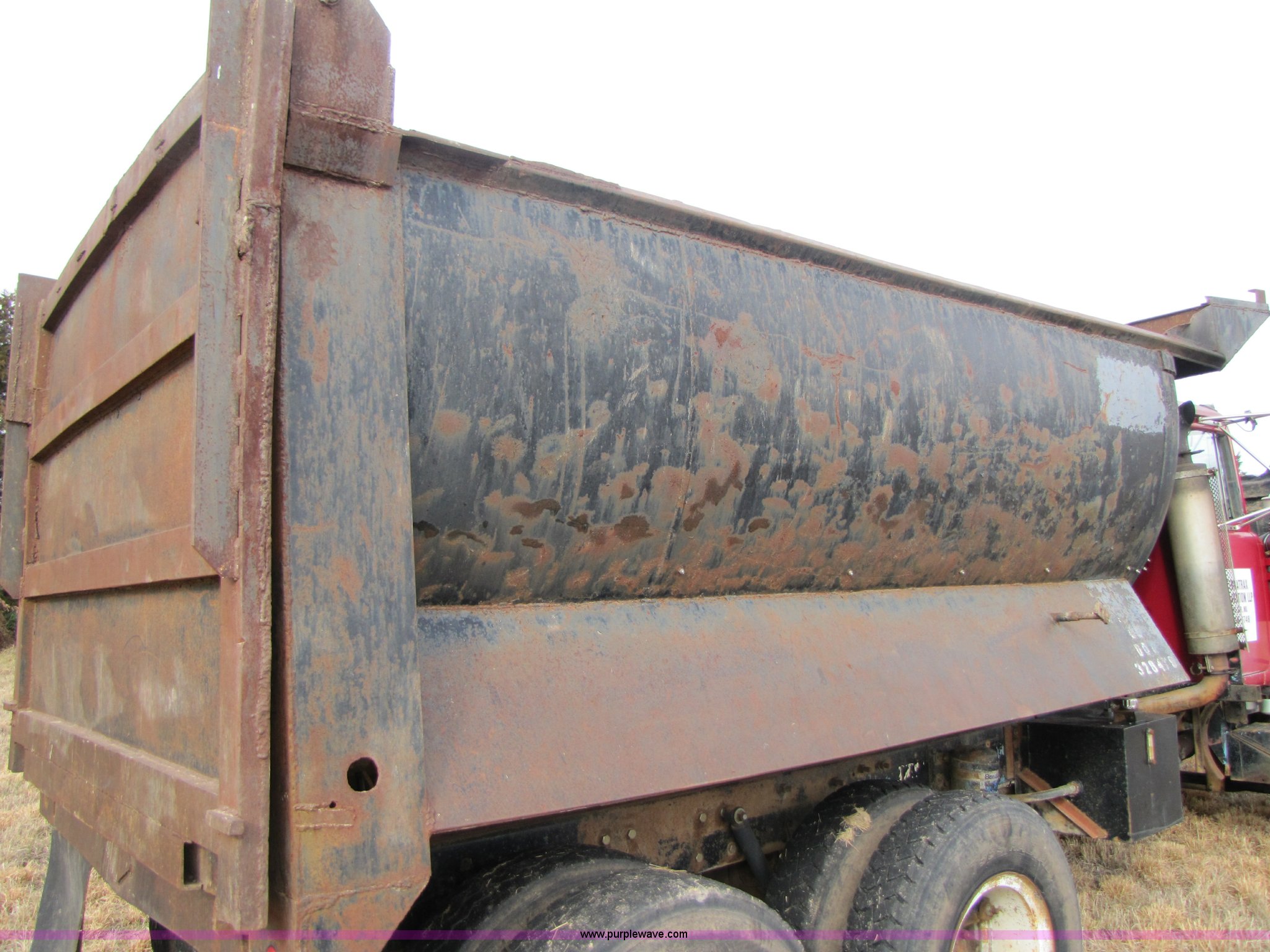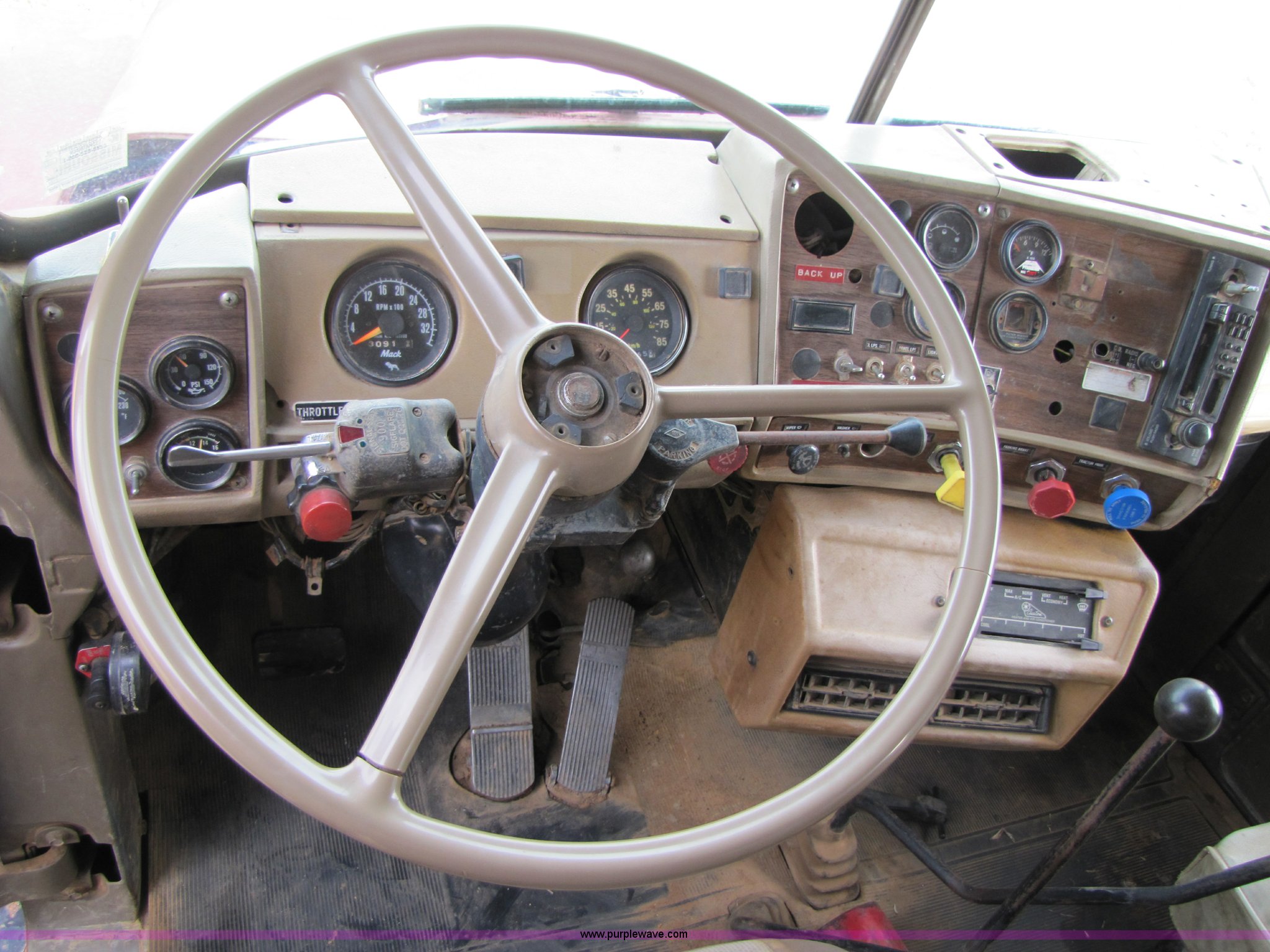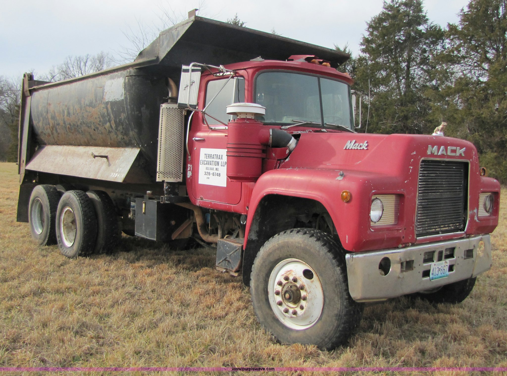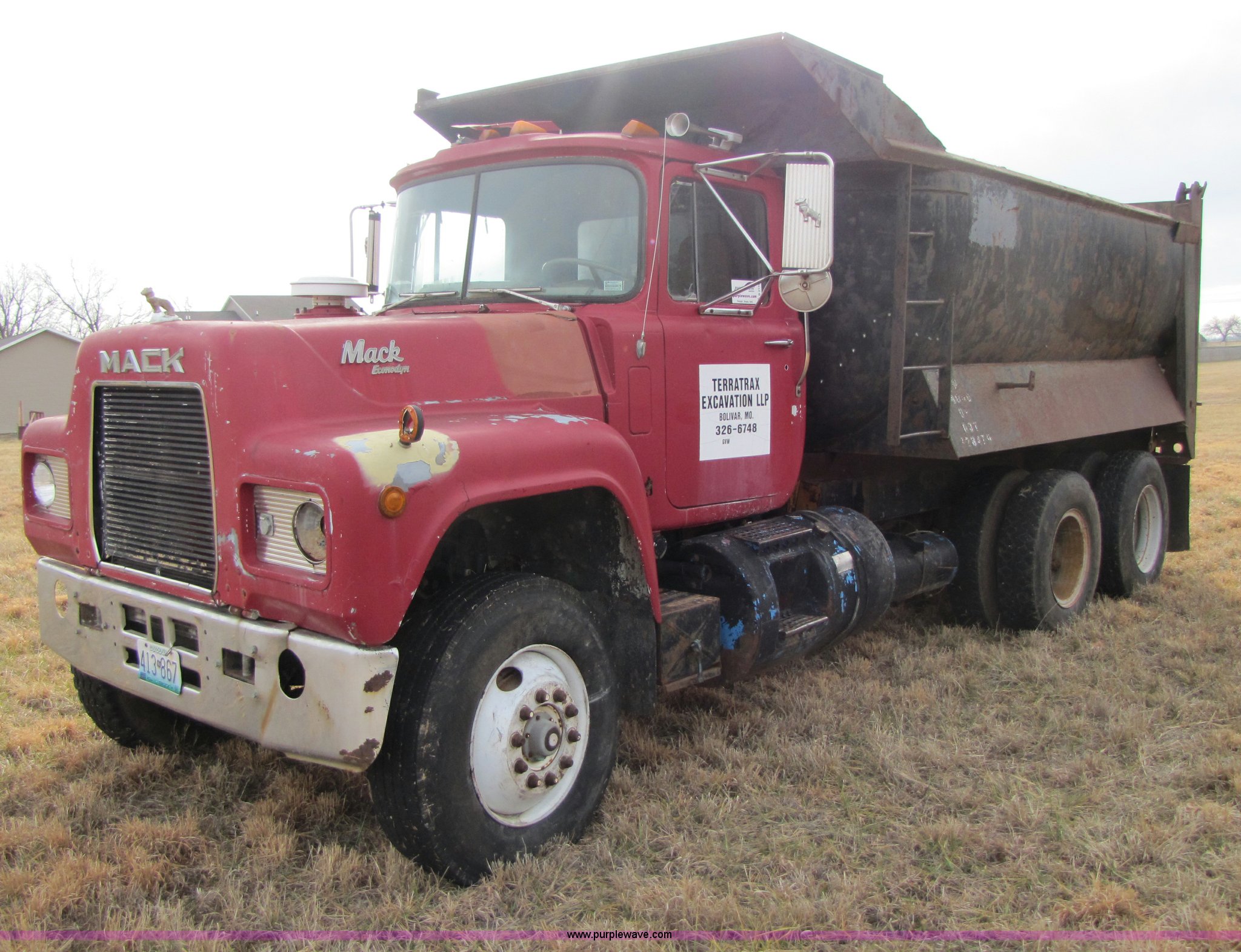 Purple Wave is selling a used Construction Dump Truck in Missouri. This item is a 1985 Mack RD686S dump truck with the following: 180,961 miles on odometer, 3,091 hours on meter, Mack E6 11.0L six cylinder diesel engine, Two-stick five speed manual transmission, Twin screw, Heater, Tilt, AM/FM/Cassette, Telescoping steering wheel, Air ride seat, Air ride cab, 14.5' barrel bed, Air operated end gate, 75 gallon fuel tank, Chrome bumper, Spring suspension, PTO, Air brakes, Jake brake, 11R22.5 tires, GVWR 52,000 lbs, FAWR 12,000 lbs, IAWR 20,000 lbs, RAWR 20,000 lbs, 202" wheelbase, Speedometer does not work