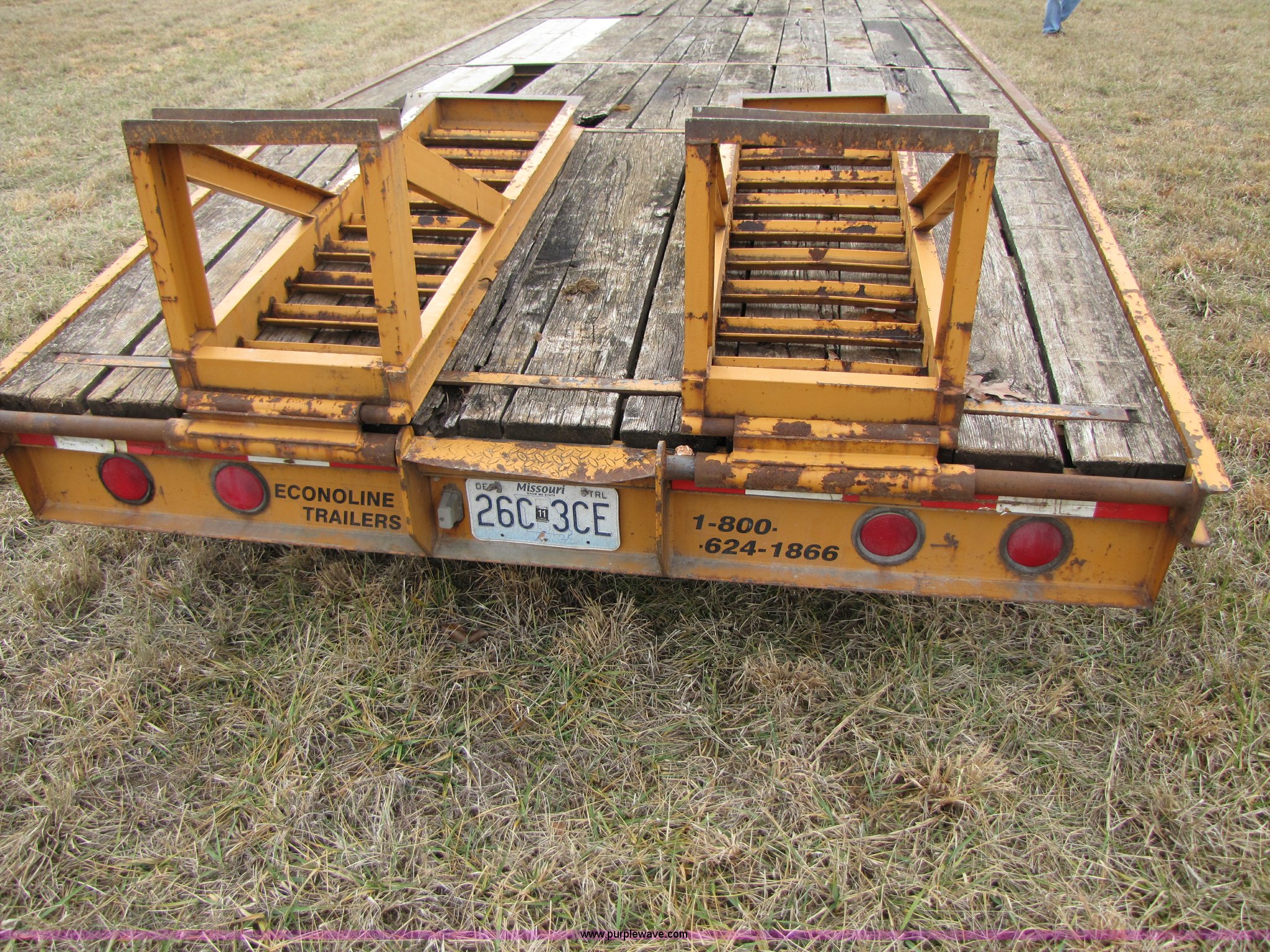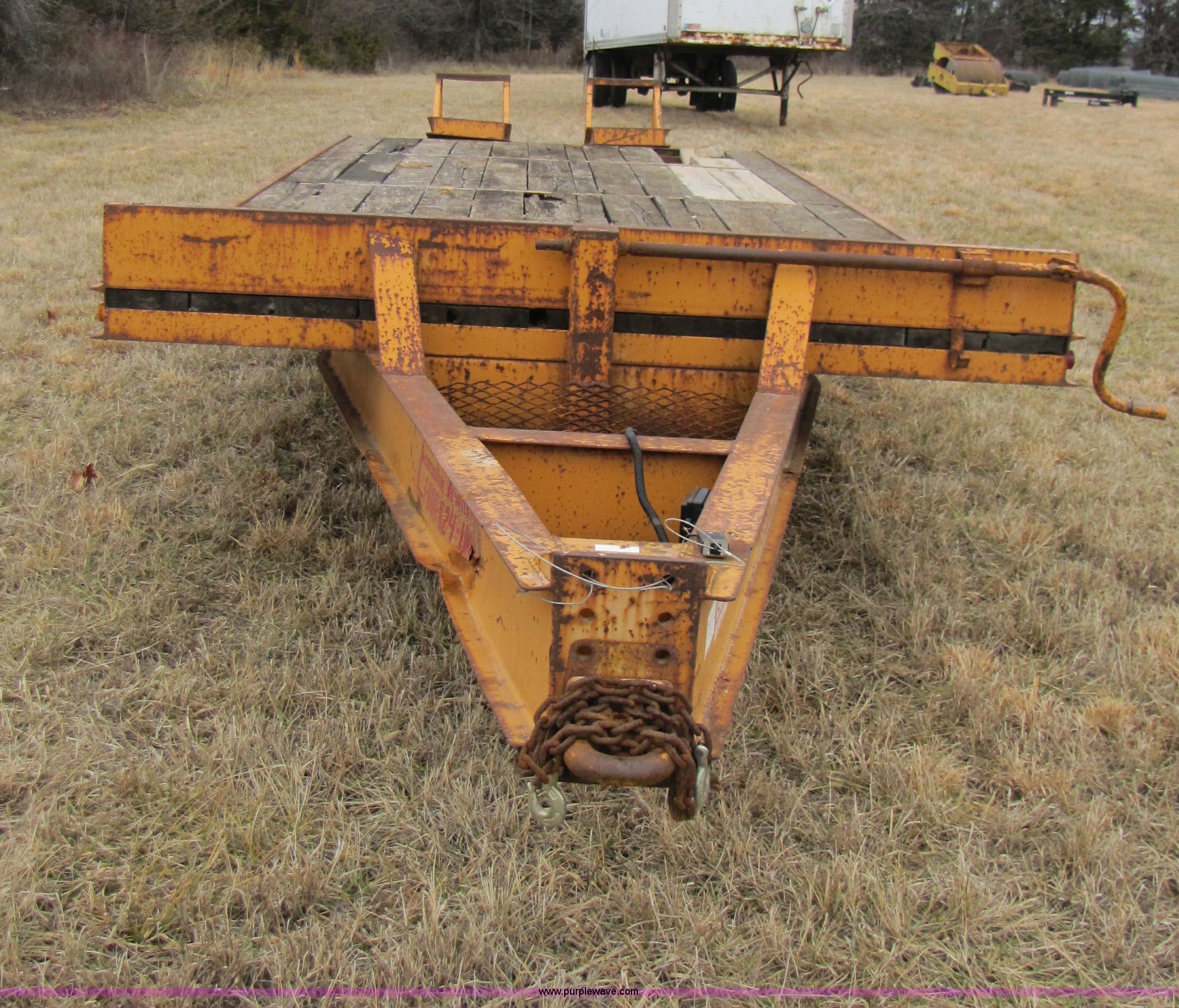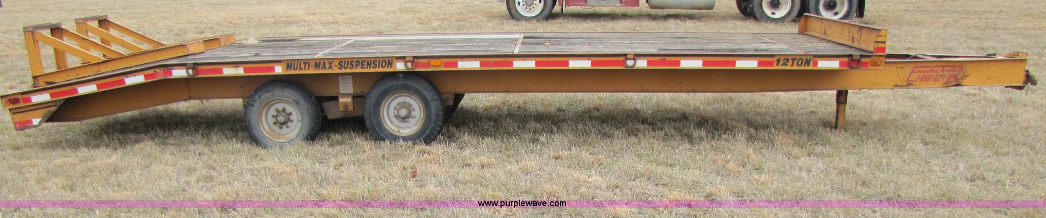 Purple Wave is selling a used Equip. Trailer in Missouri. This item is a 1998 12 ton tandem axle trailer with the following: Model MP425-DE, Multi-Max suspension, 20' x 96" deck, 5' dove tail, 5' fold down ramps, Wood deck, Electric brakes with safety break-away system, Chain storage in tongue, Pintle hitch, GVWR 24,000 lbs, 8-14.5 tires(8) tires
