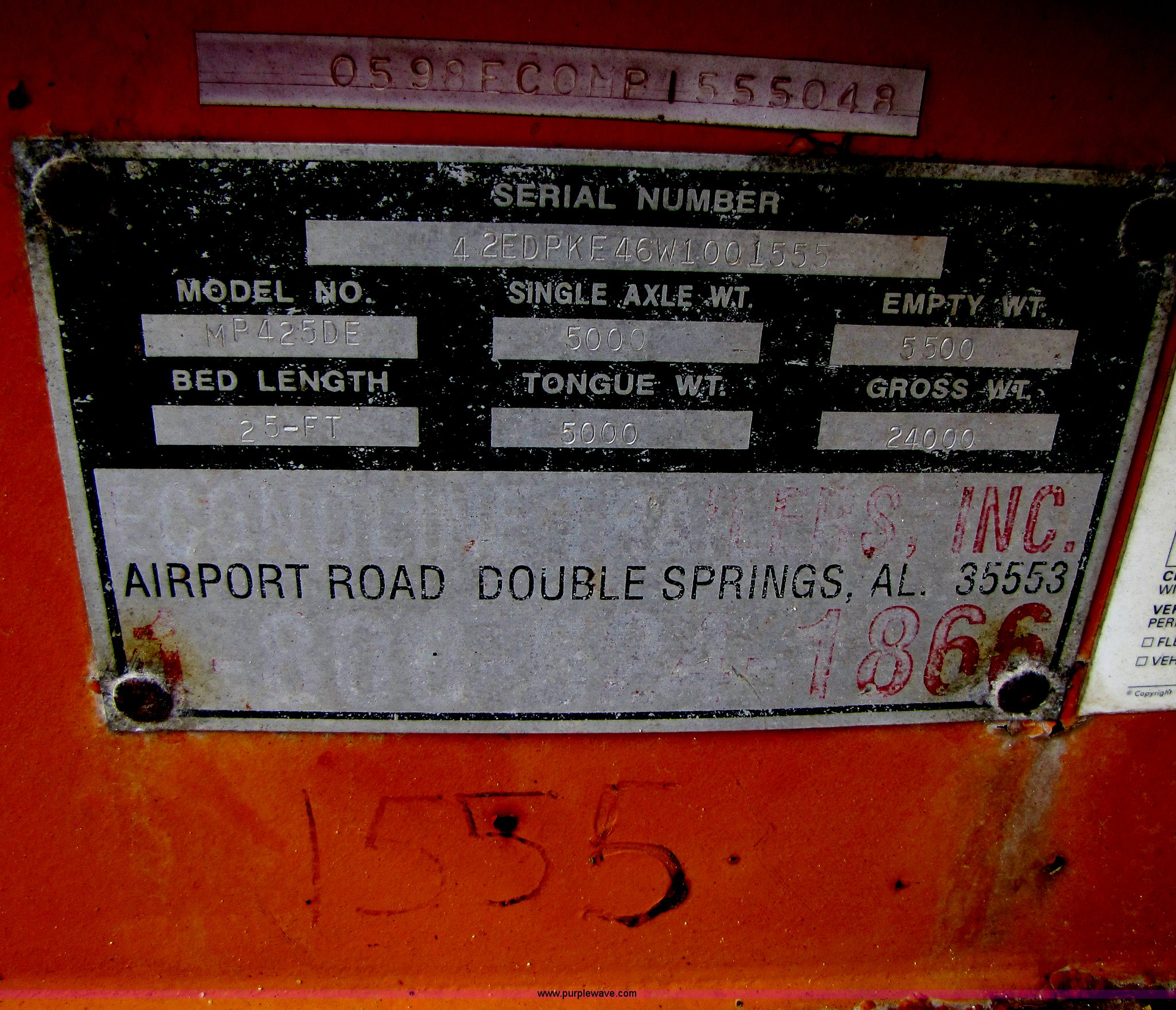 1998 12 ton tandem axle trailer. Model MP425-DE, Multi-Max suspension, 20' x 96" deck, 5' dove tail, 5' fold down ramps, Wood deck, Electric brakes with safety break-away system, Chain storage in tongue, Pintle hitch, GVWR 24,000 lbs, 8-14.5 tires(8) tires. 42EDPKE46W1001555. Shipping quotes available. Terratrax Excavation LLC. 1361 E 454th Rd. Bolivar, MO 65613