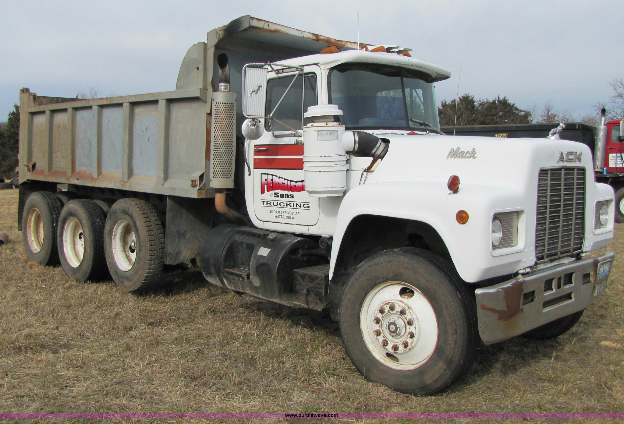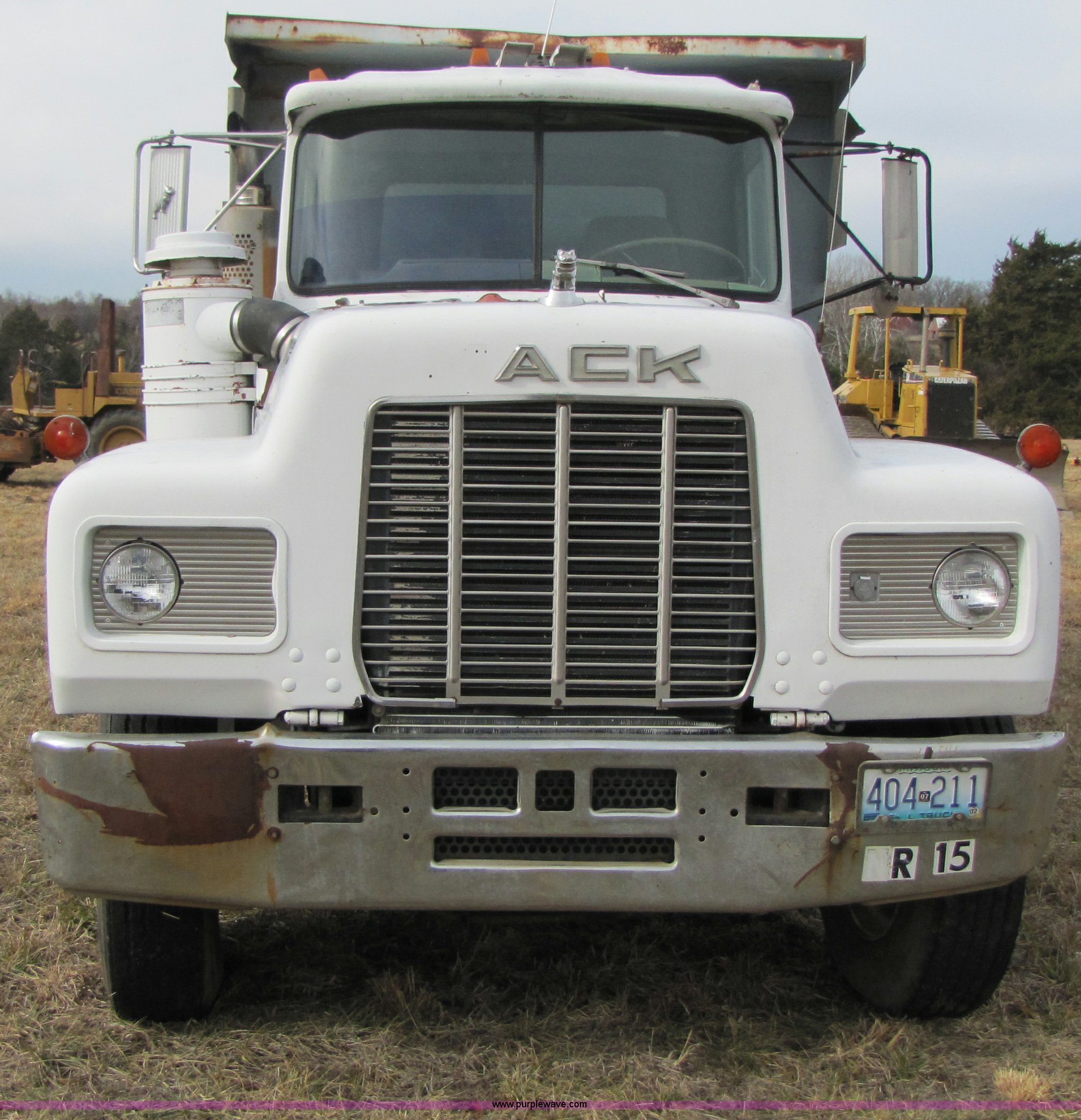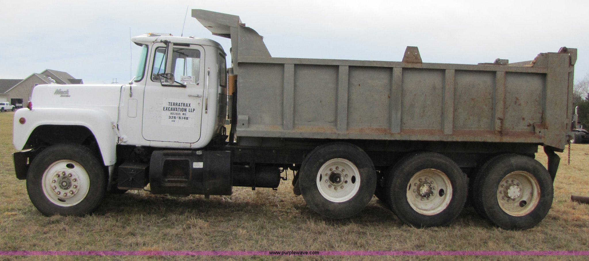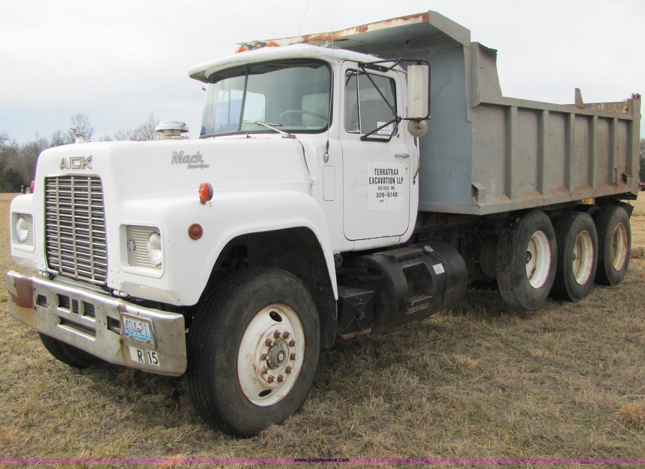 Purple Wave is selling a used Construction Dump Truck in Missouri. This item is a 1985 Mack R686ST dump truck with the following: 191,050 miles on odometer, 4,693 hours on meter, Mack E6 11.0L diesel engine, 300 HP, Serial 53827P1, Two-stick five speed manual transmission, Maxi-torque, Twin screw, Heater, AM/FM/Cassette, Telescoping wheel, Air ride seat, Air ride cab, 15' dump bed, Single ram hoist, Exterior visor, Chrome bumper, Pintle hitch, Dual 75 gallon fuel tanks, Spring suspension, PTO, Air brakes, Tag axle, 11R24.5 tires, GVWR 62,000 lbs, FAWR 12,000 lbs, IAWR 20,000 lbs, RAWR 20,000 lbs, 223" wheelbase