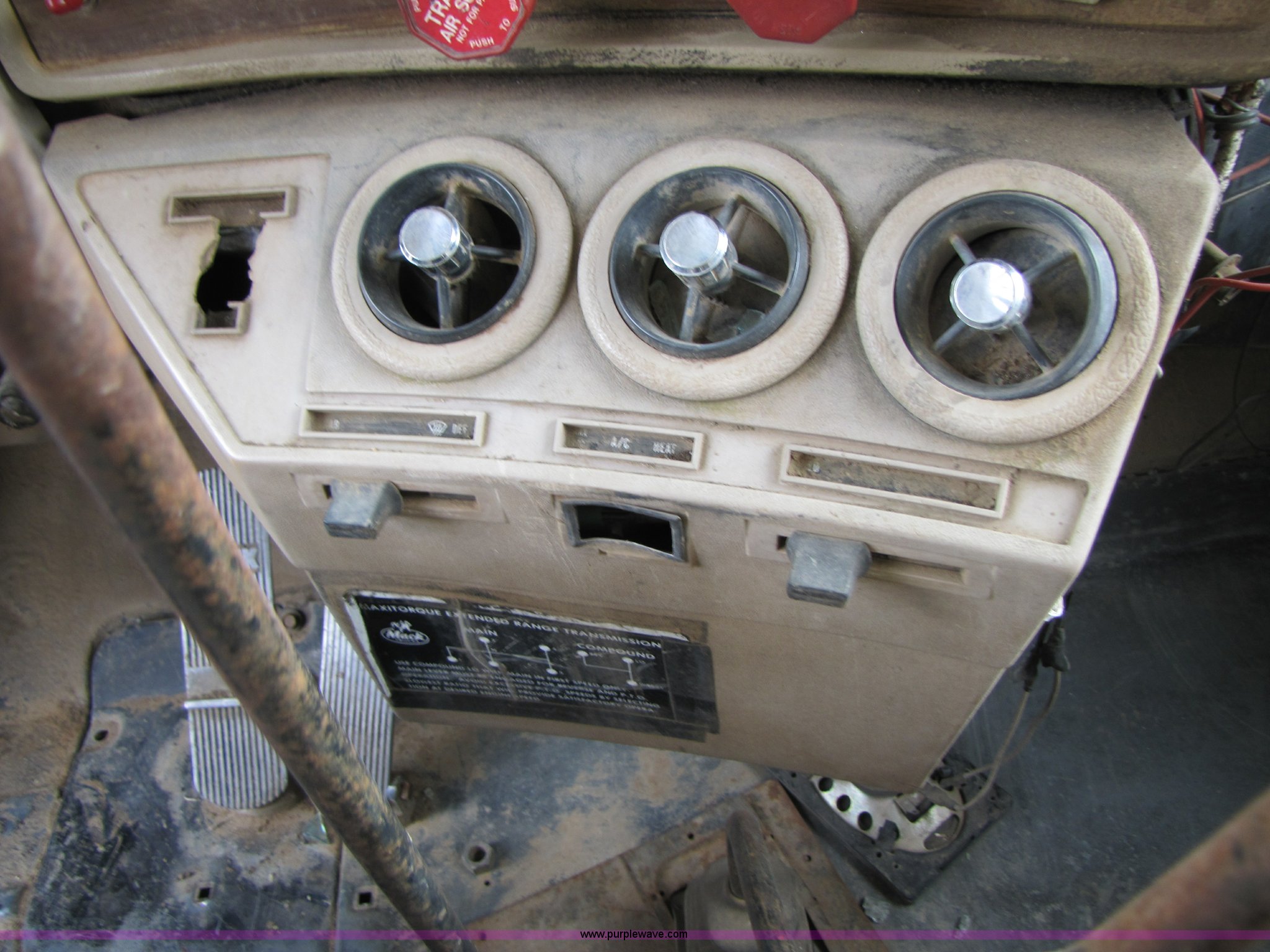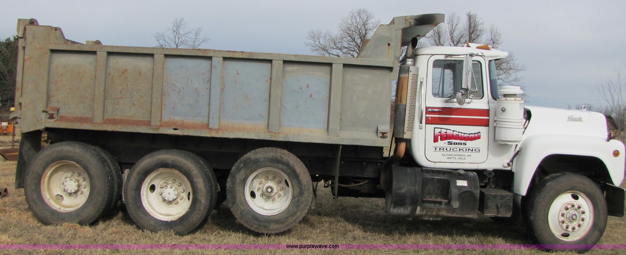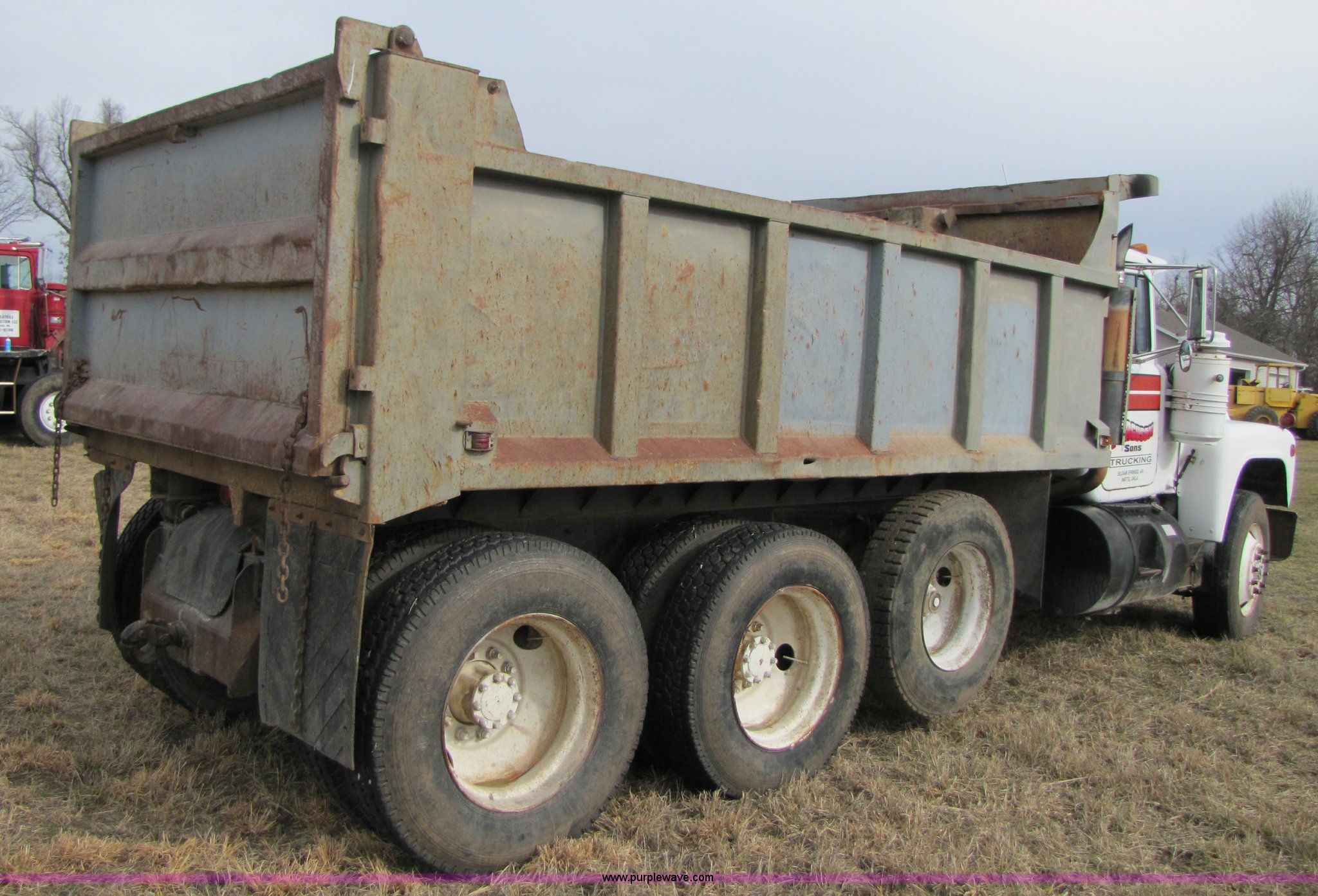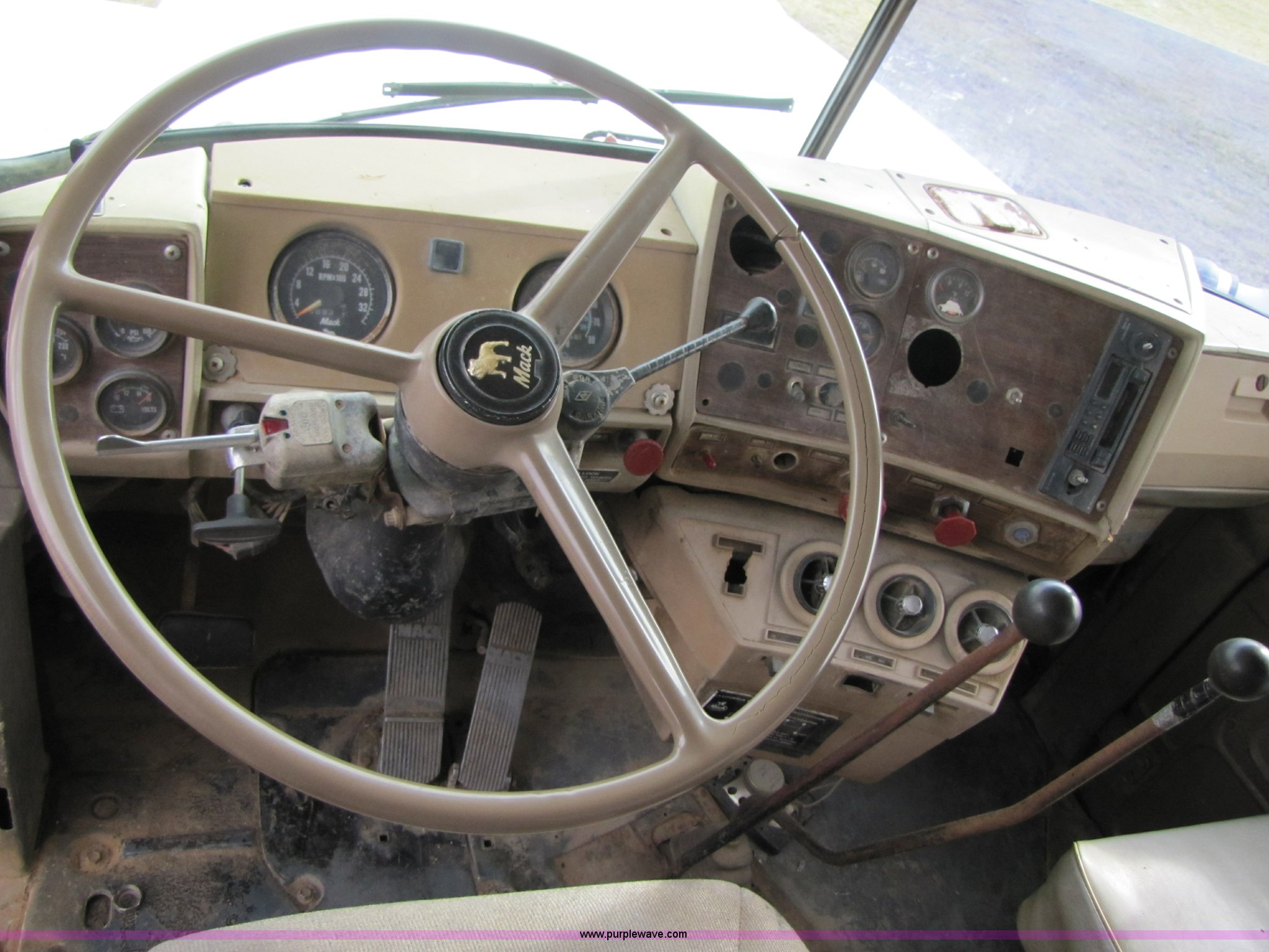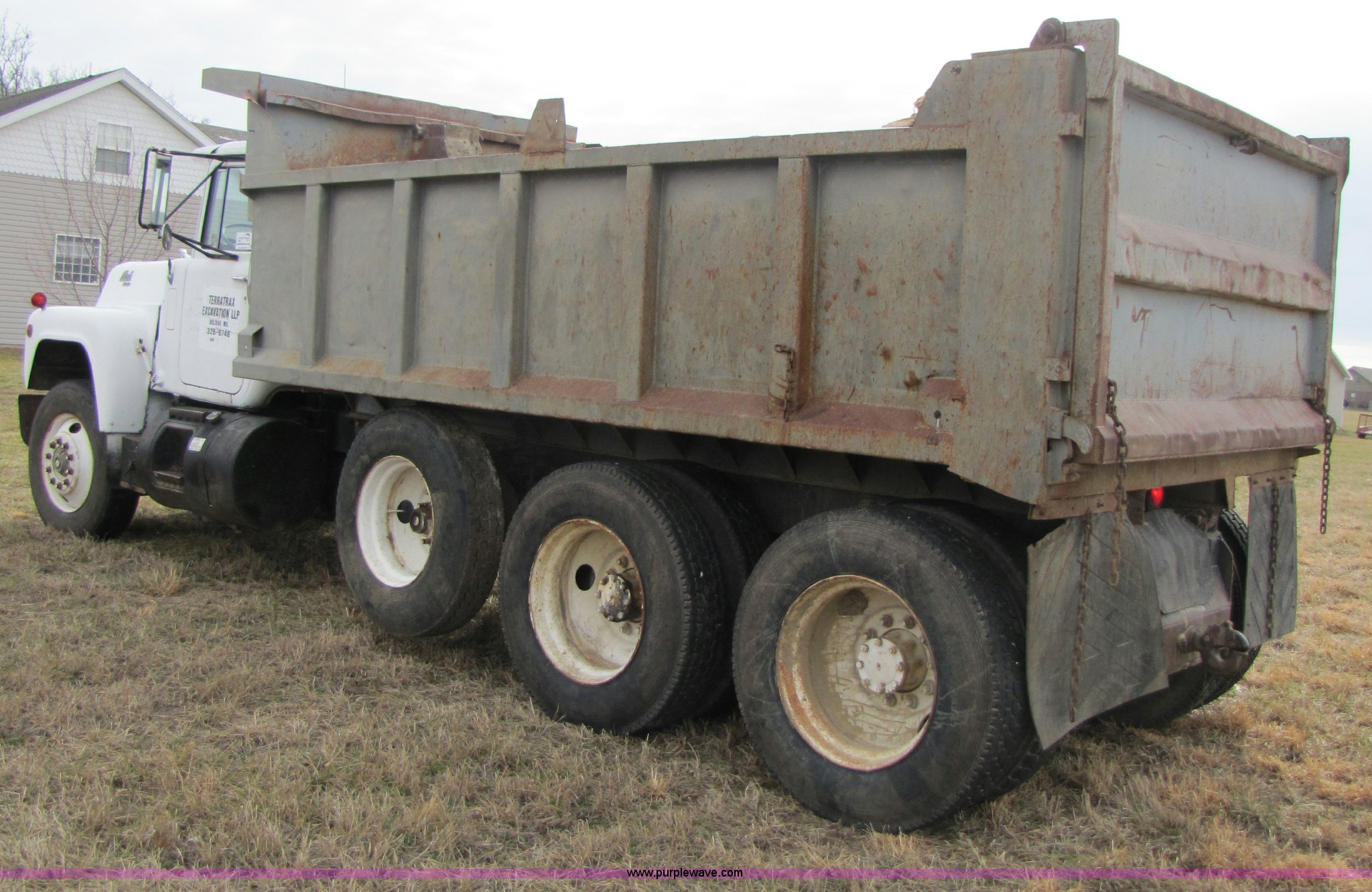 Purple Wave is selling a used Construction Dump Truck in Missouri. This item is a 1985 Mack R686ST dump truck with the following: 191,050 miles on odometer, 4,693 hours on meter, Mack E6 11.0L diesel engine, 300 HP, Serial 53827P1, Two-stick five speed manual transmission, Maxi-torque, Twin screw, Heater, AM/FM/Cassette, Telescoping wheel, Air ride seat, Air ride cab, 15' dump bed, Single ram hoist, Exterior visor, Chrome bumper, Pintle hitch, Dual 75 gallon fuel tanks, Spring suspension, PTO, Air brakes, Tag axle, 11R24.5 tires, GVWR 62,000 lbs, FAWR 12,000 lbs, IAWR 20,000 lbs, RAWR 20,000 lbs, 223" wheelbase