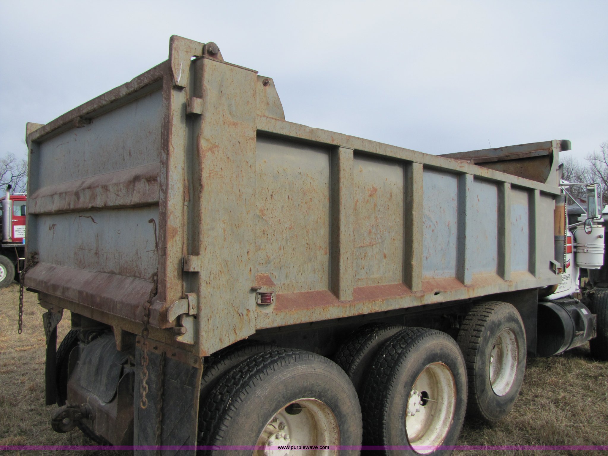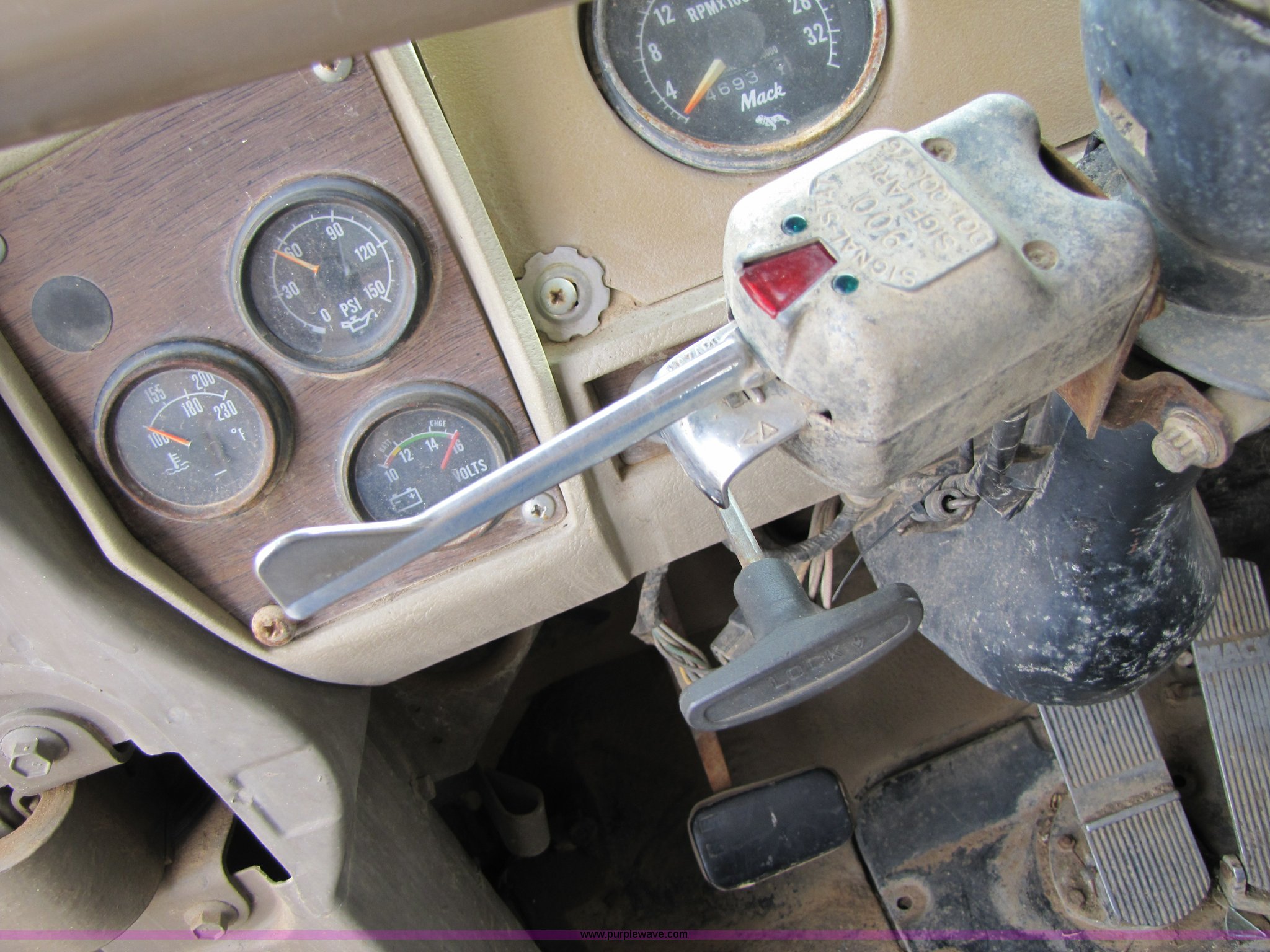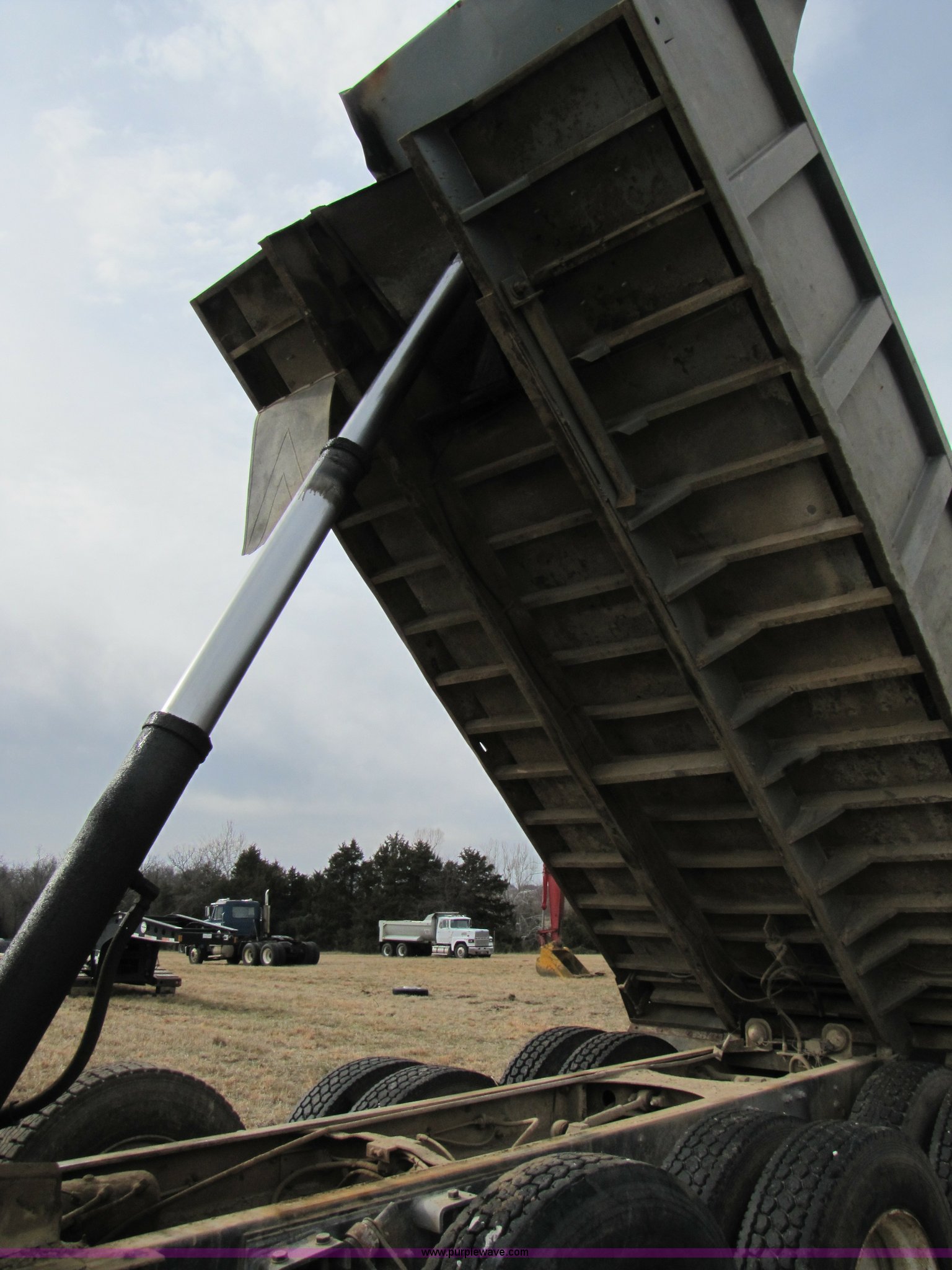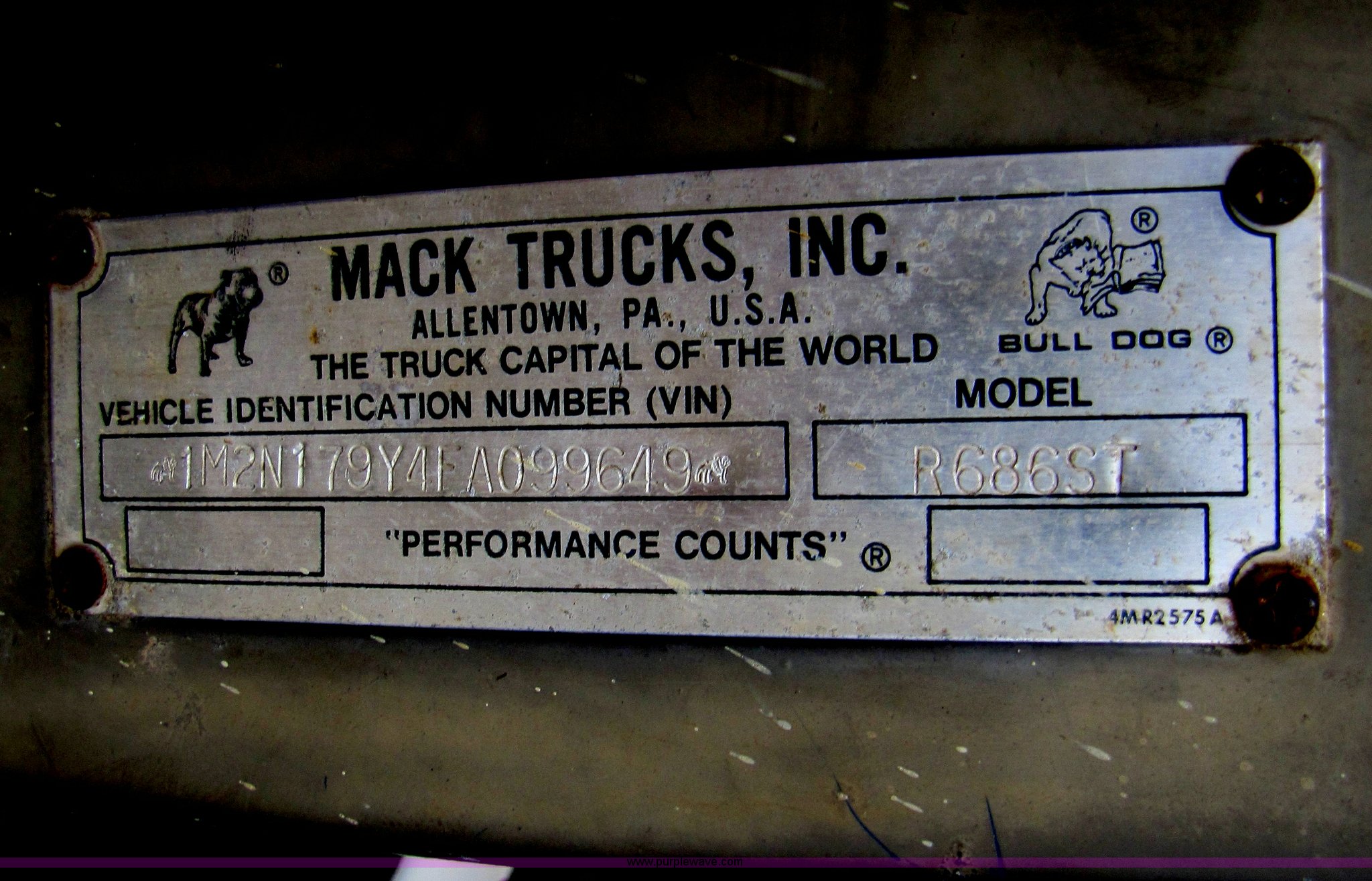 Purple Wave is selling a used Construction Dump Truck in Missouri. This item is a 1985 Mack R686ST dump truck with the following: 191,050 miles on odometer, 4,693 hours on meter, Mack E6 11.0L diesel engine, 300 HP, Serial 53827P1, Two-stick five speed manual transmission, Maxi-torque, Twin screw, Heater, AM/FM/Cassette, Telescoping wheel, Air ride seat, Air ride cab, 15' dump bed, Single ram hoist, Exterior visor, Chrome bumper, Pintle hitch, Dual 75 gallon fuel tanks, Spring suspension, PTO, Air brakes, Tag axle, 11R24.5 tires, GVWR 62,000 lbs, FAWR 12,000 lbs, IAWR 20,000 lbs, RAWR 20,000 lbs, 223" wheelbase