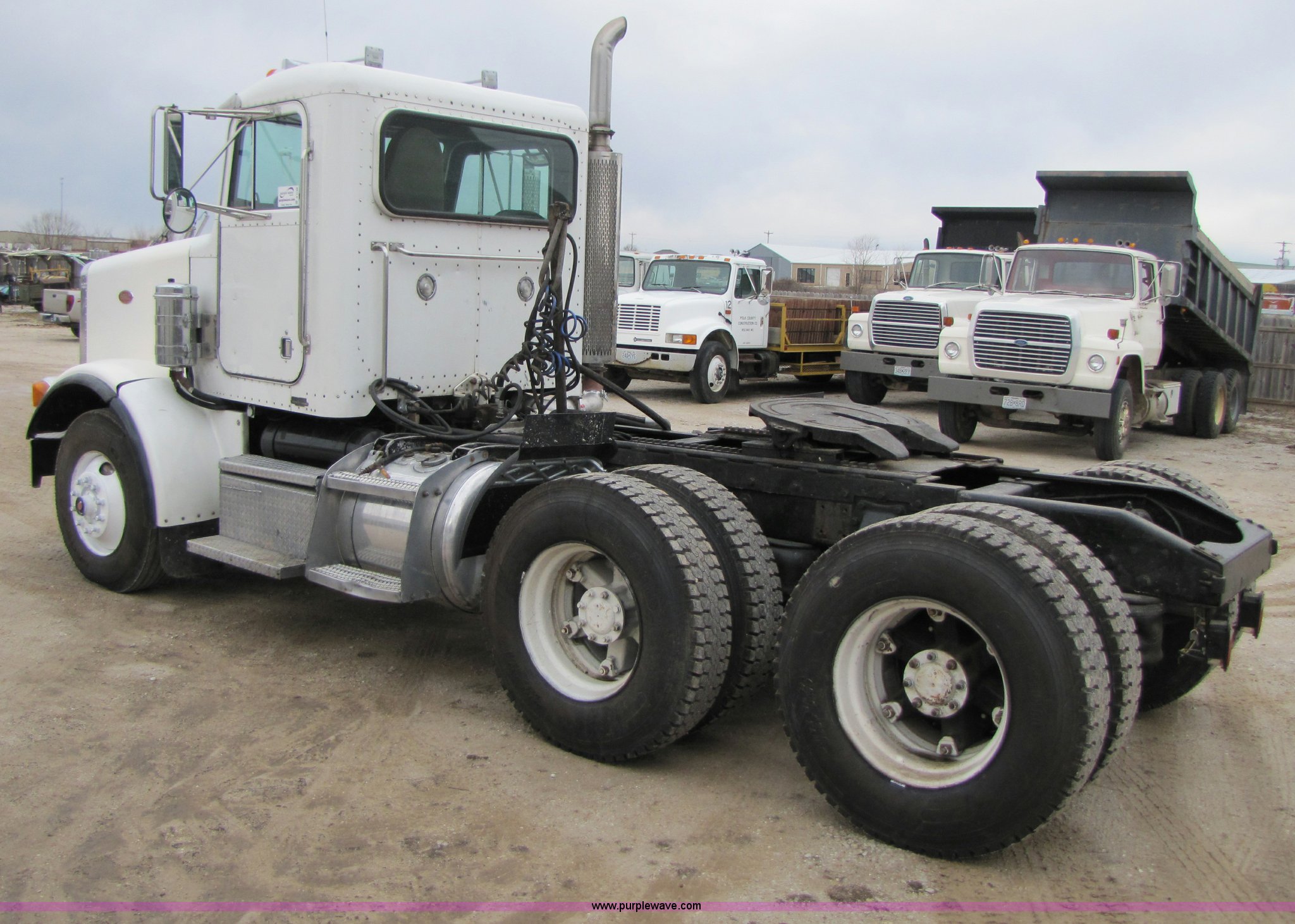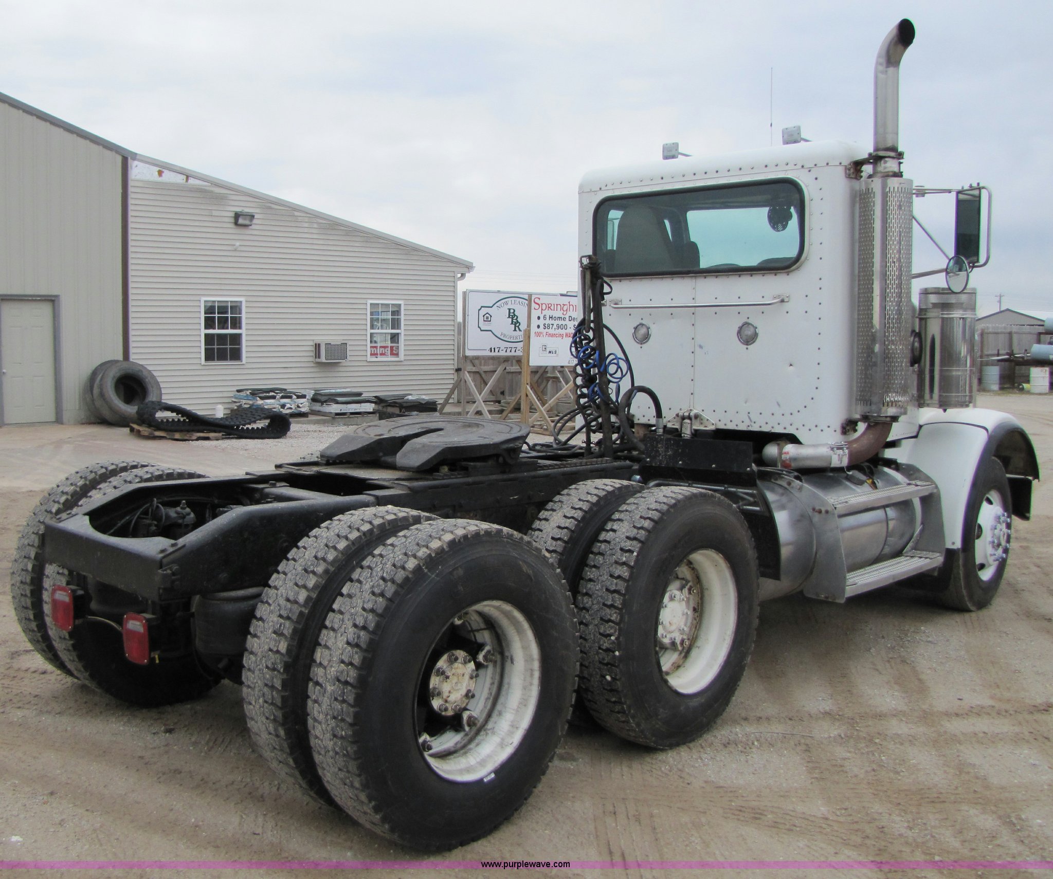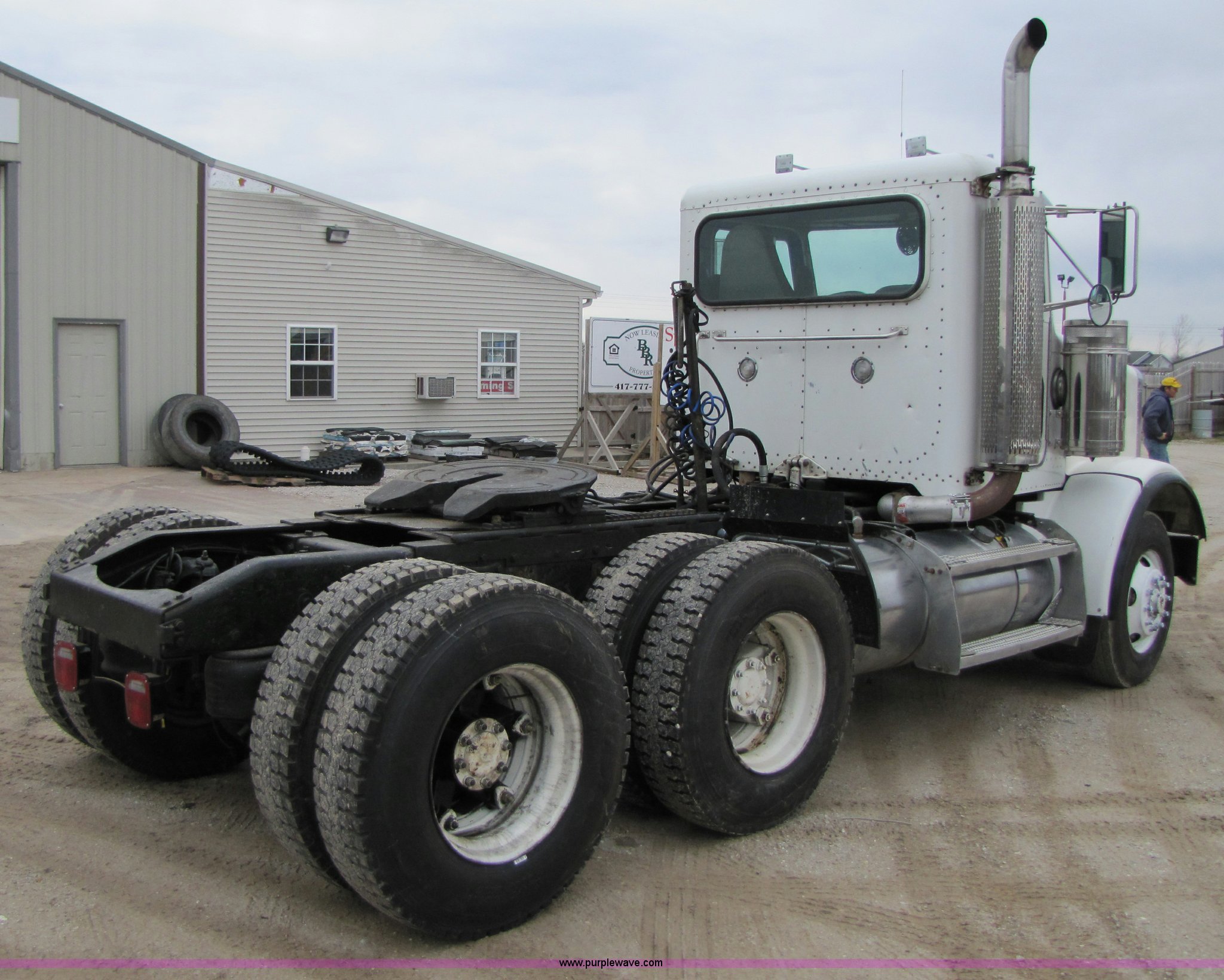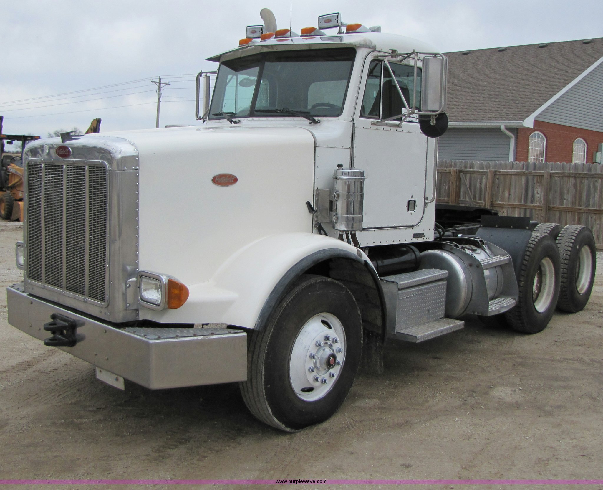 Purple Wave is selling a used Truck Tractor in Missouri. This item is a 1997 Peterbilt 357 semi truck with the following: 424,252 miles on odometer, Caterpillar 3406 14.6L diesel engine, Eaton Fuller 13 speed manual transmission, Twin screw, AC and heat, AM/FM/CD, Passenger daylight door, Heated mirrors, Air ride seat, Air ride cab, Exterior visor, Chrome bumper, Block heater, 50 and 70 gallon aluminum fuel tanks, PTO, Wet kit, Dump valves, Air suspension, Air brakes, Front pin hitch, (8) new drive tires, 11R22.5 tires, GVWR 58,000 lbs, FAWR 16,000 lbs, IAWR 21,000 lbs, RAWR 21,000 lbs, 168" wheelbase