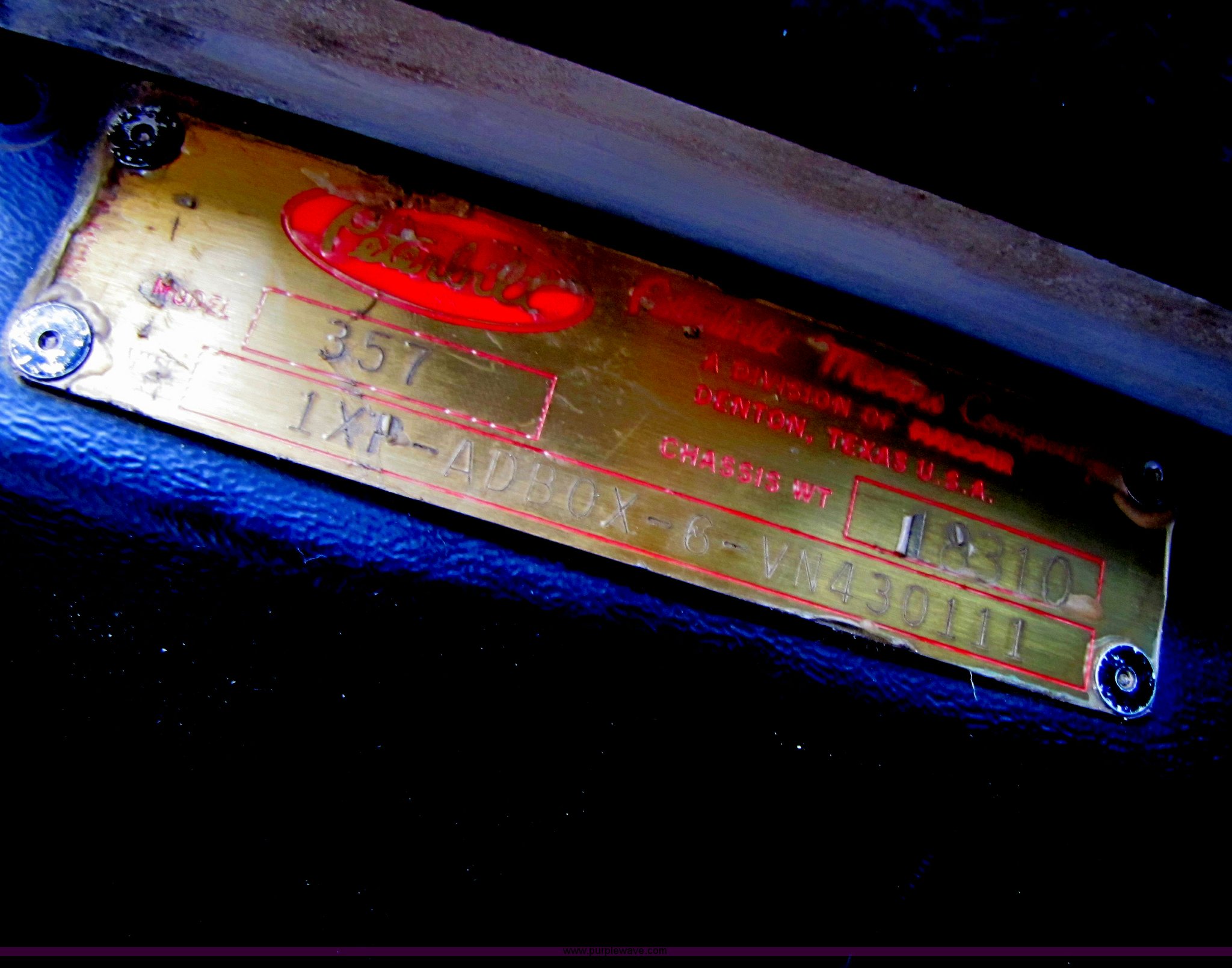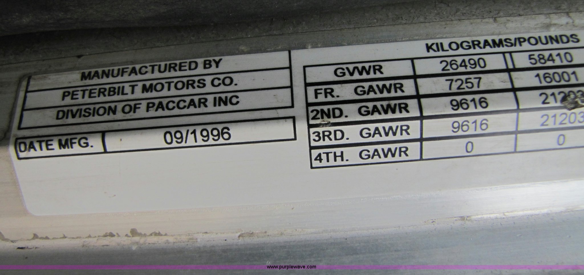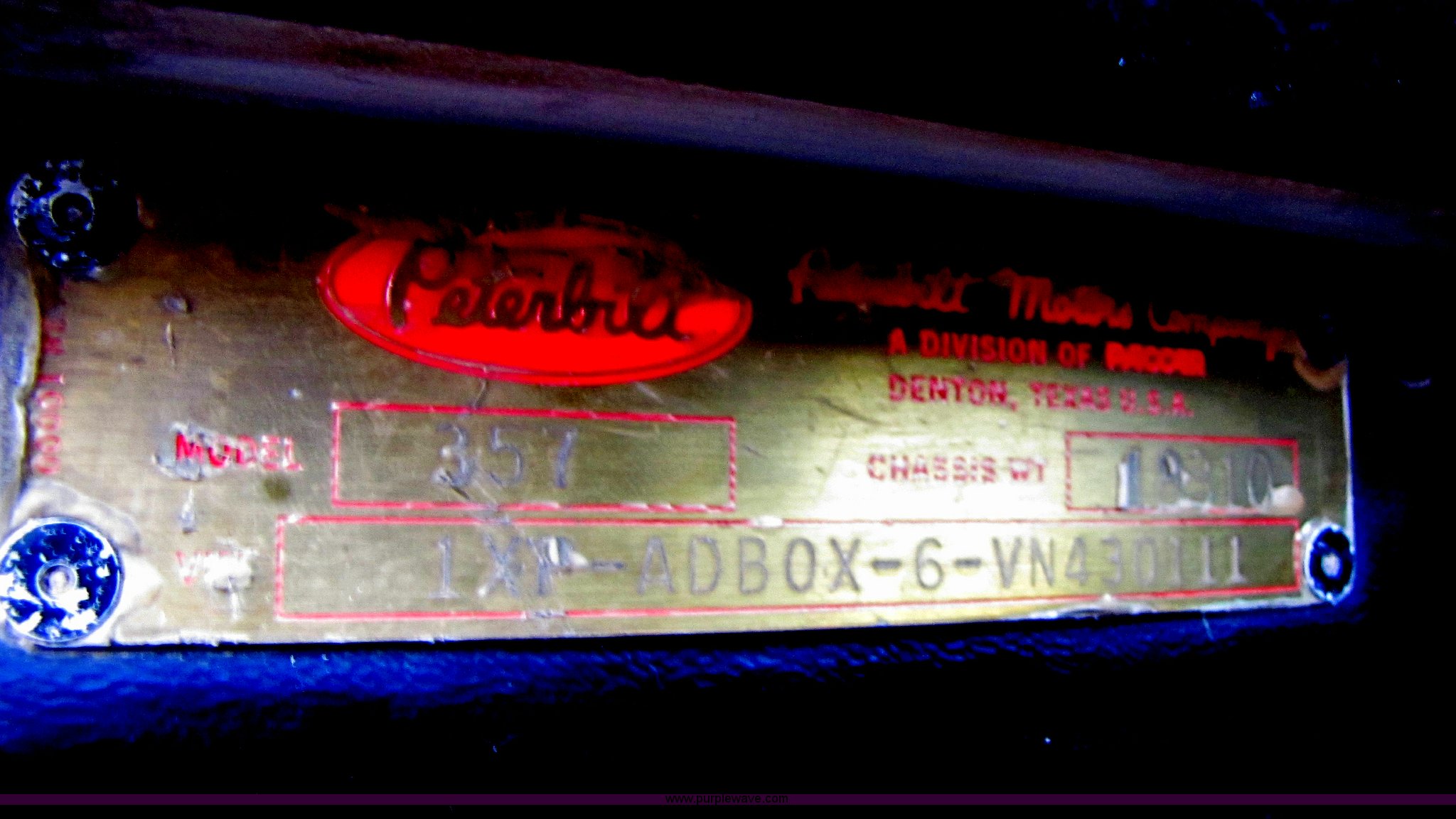 Purple Wave is selling a used Truck Tractor in Missouri. This item is a 1997 Peterbilt 357 semi truck with the following: 424,252 miles on odometer, Caterpillar 3406 14.6L diesel engine, Eaton Fuller 13 speed manual transmission, Twin screw, AC and heat, AM/FM/CD, Passenger daylight door, Heated mirrors, Air ride seat, Air ride cab, Exterior visor, Chrome bumper, Block heater, 50 and 70 gallon aluminum fuel tanks, PTO, Wet kit, Dump valves, Air suspension, Air brakes, Front pin hitch, (8) new drive tires, 11R22.5 tires, GVWR 58,000 lbs, FAWR 16,000 lbs, IAWR 21,000 lbs, RAWR 21,000 lbs, 168" wheelbase