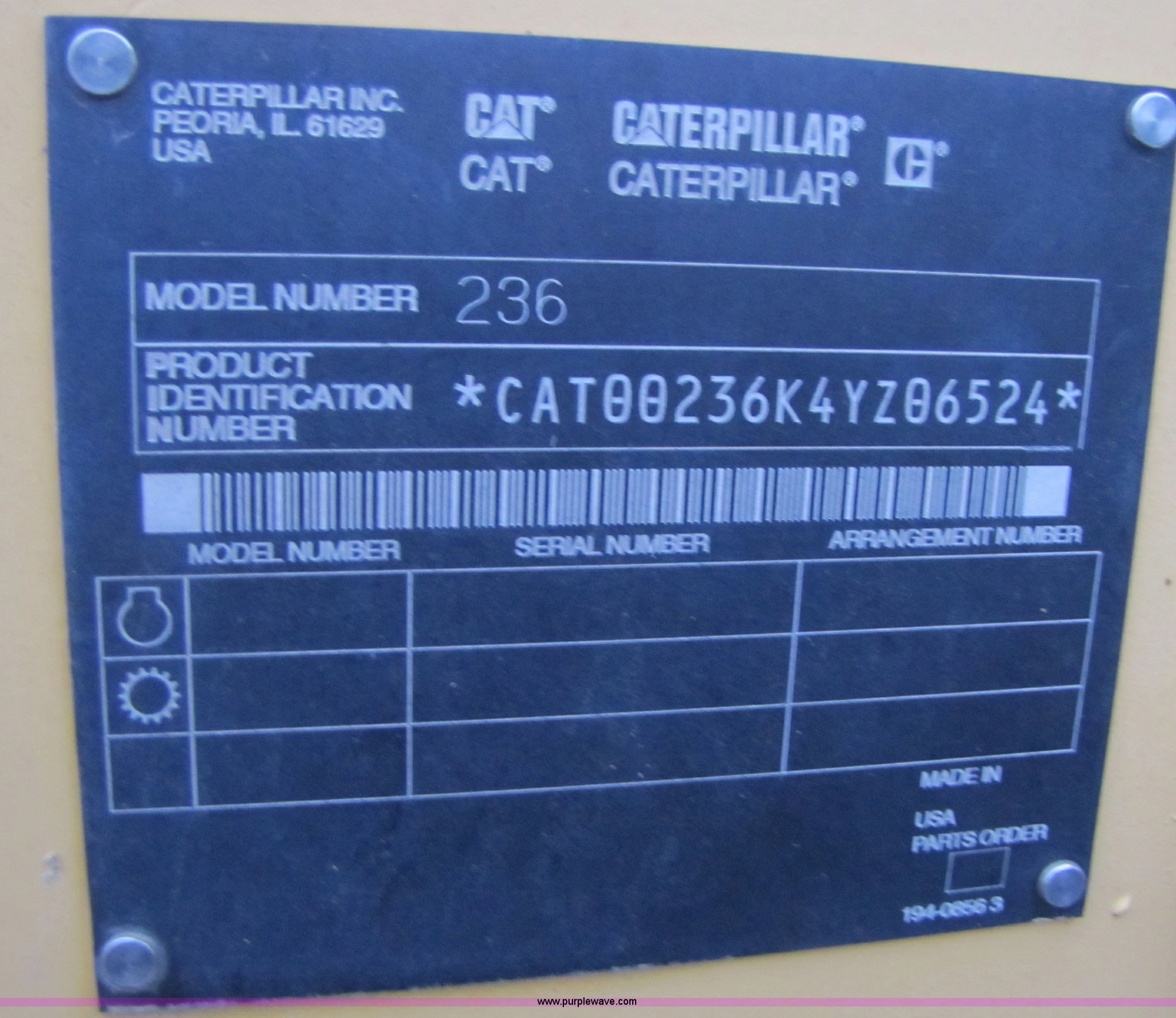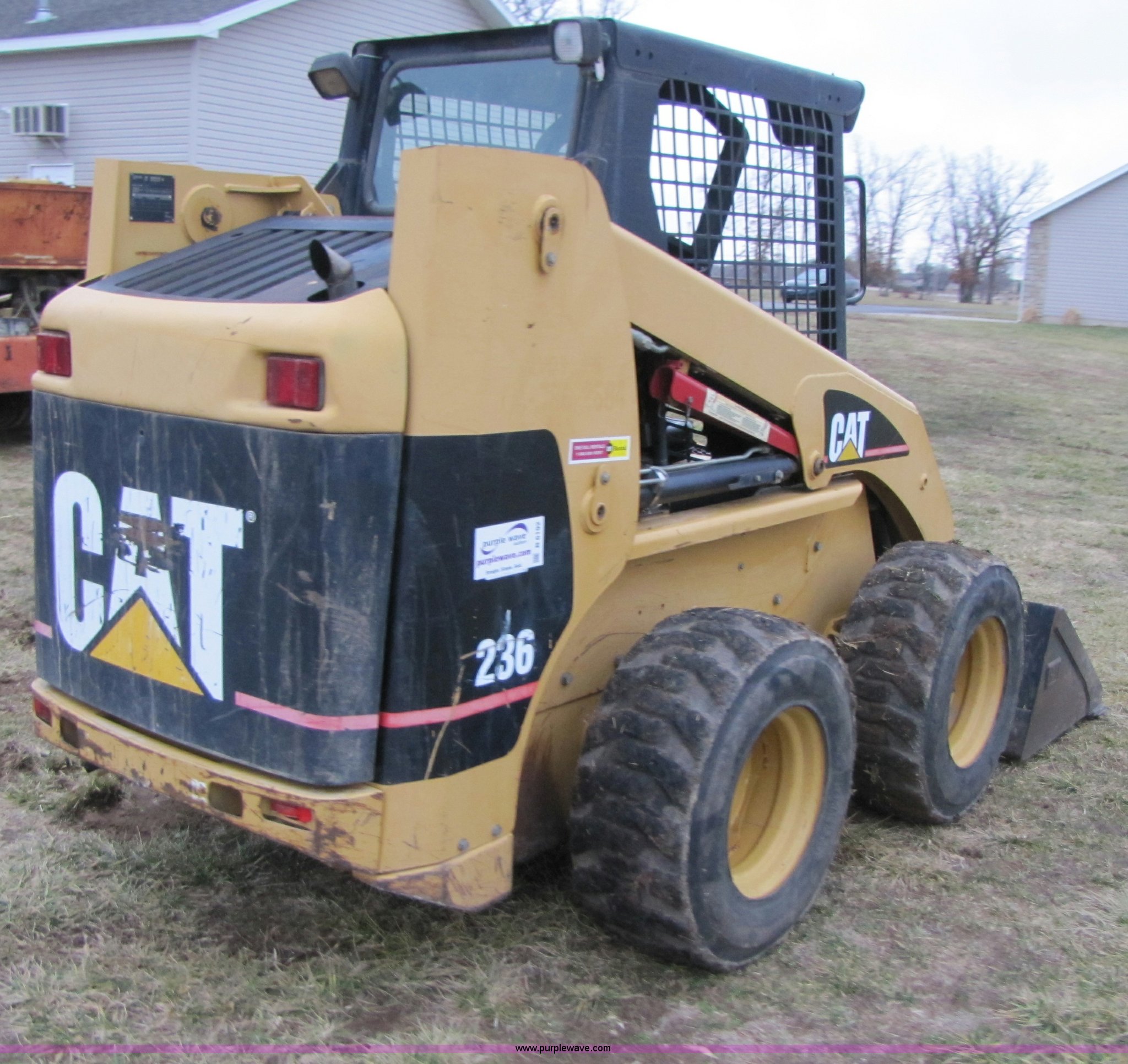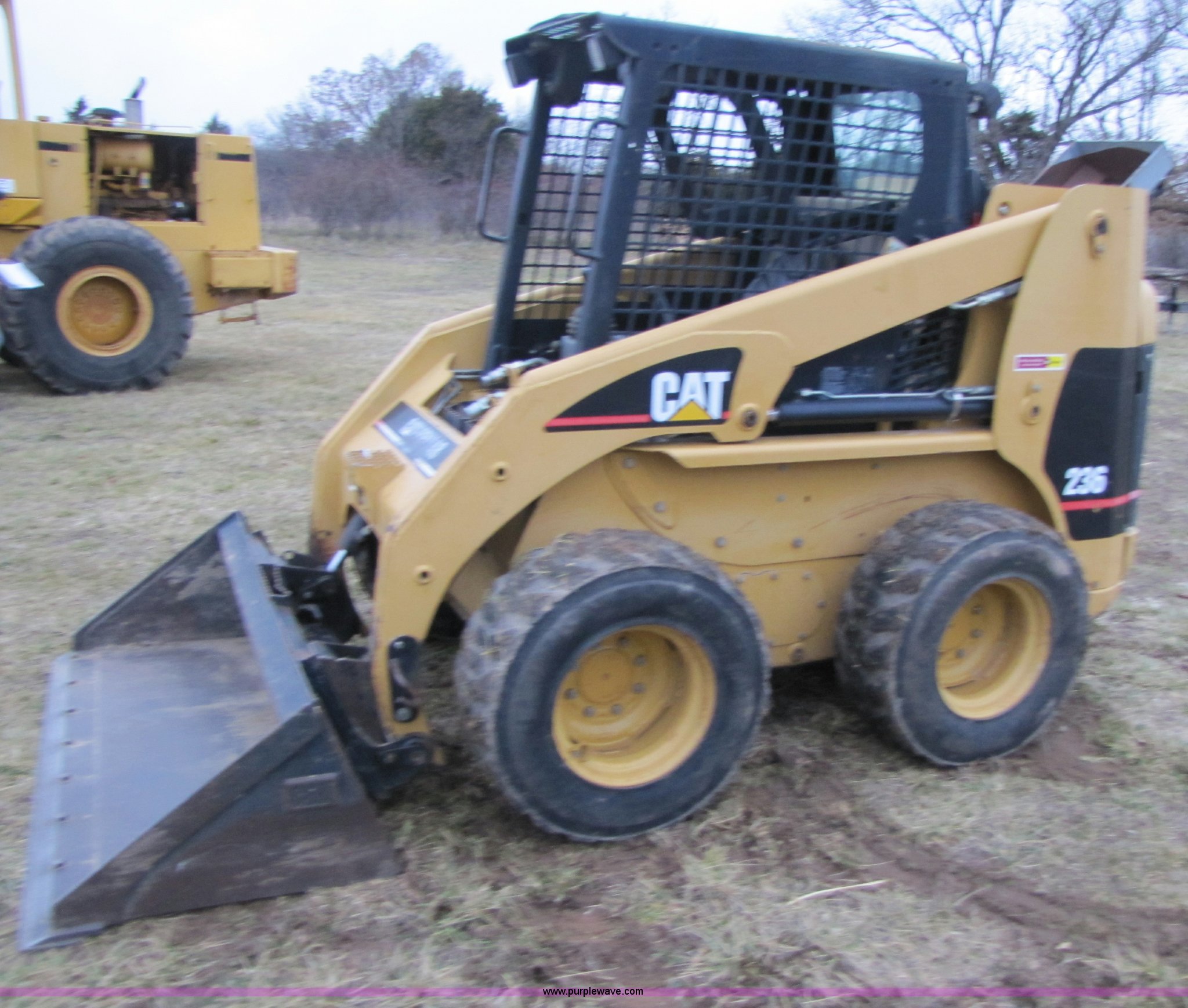 Purple Wave is selling a used Skid Steer Loader in Missouri. This item is a 2003 Caterpillar 236 skid steer with the following: 990 hours on meter, Perkins 2.95L four cylinder diesel engine, 64 HP, Hand controls, 67" smooth bucket, Bolt-on cutting edge, Auxiliary hydraulics, 1,750 lift capacity, 6,860 lbs. base operating weight, 12-16.5 tires, Serial CAT00236K4YZ06524