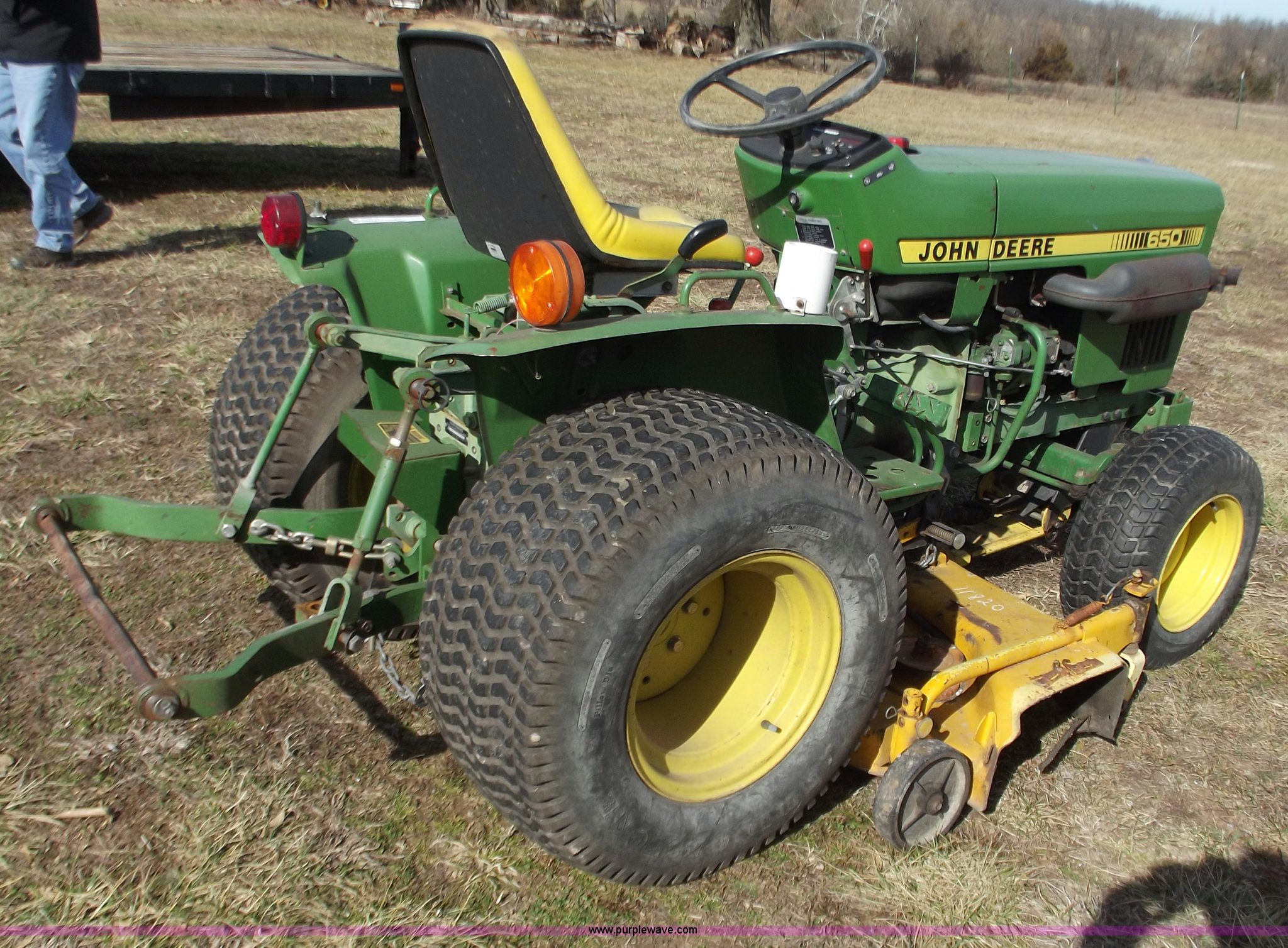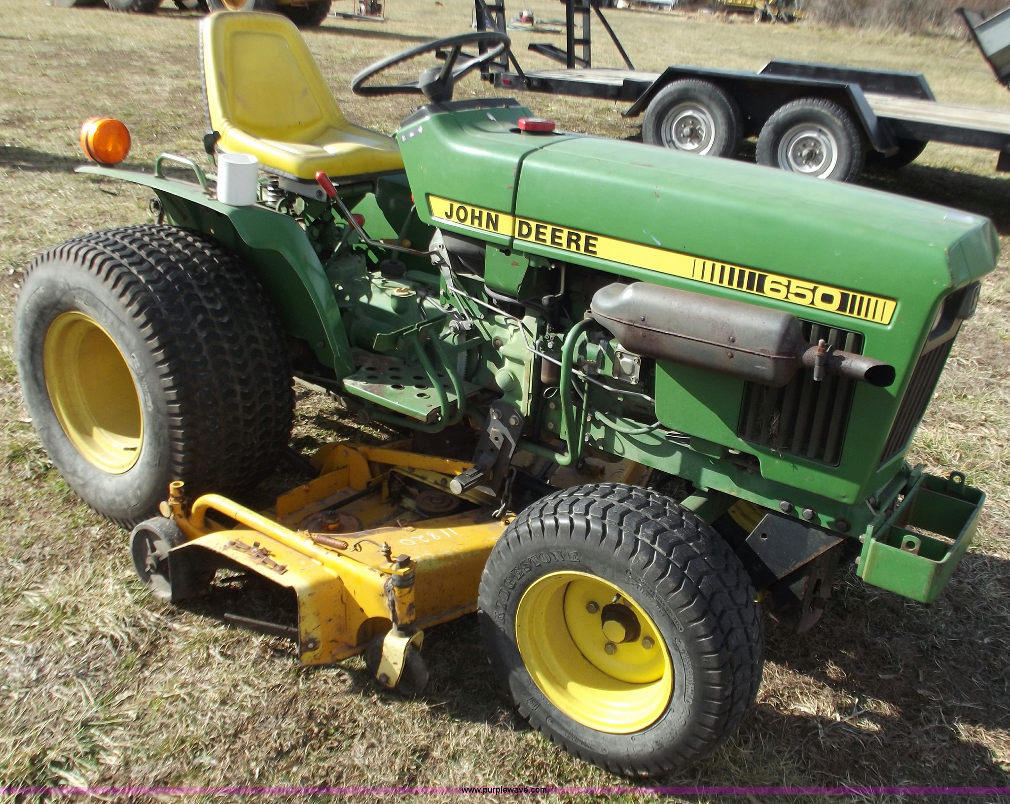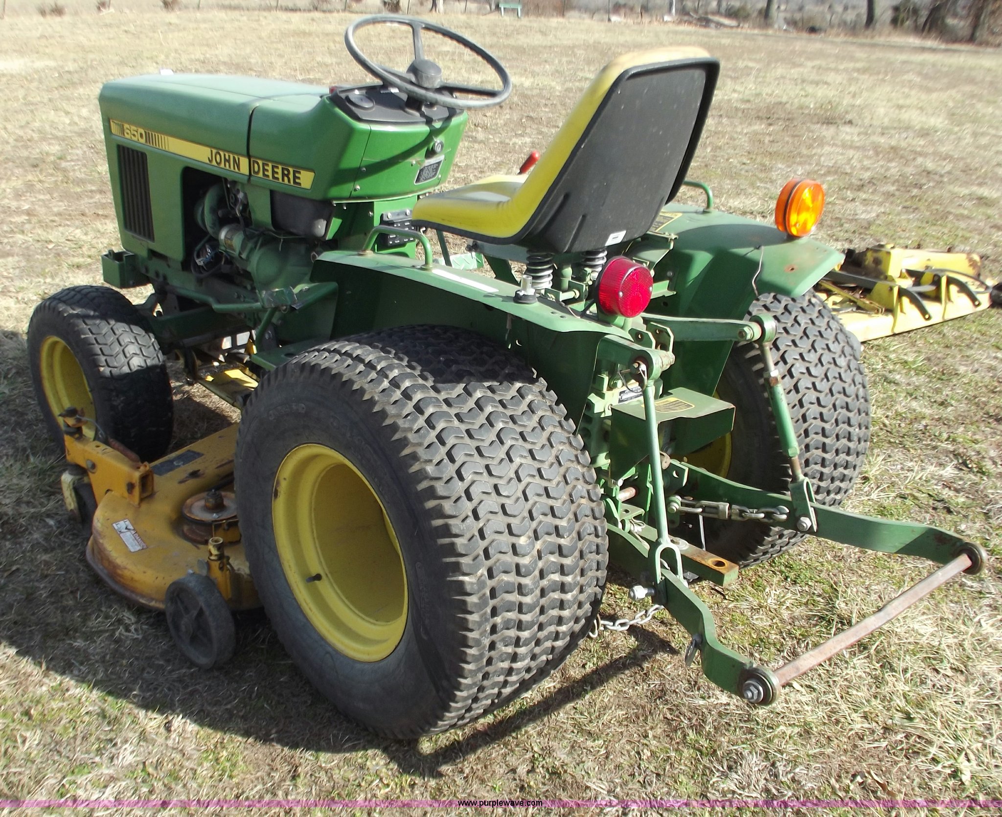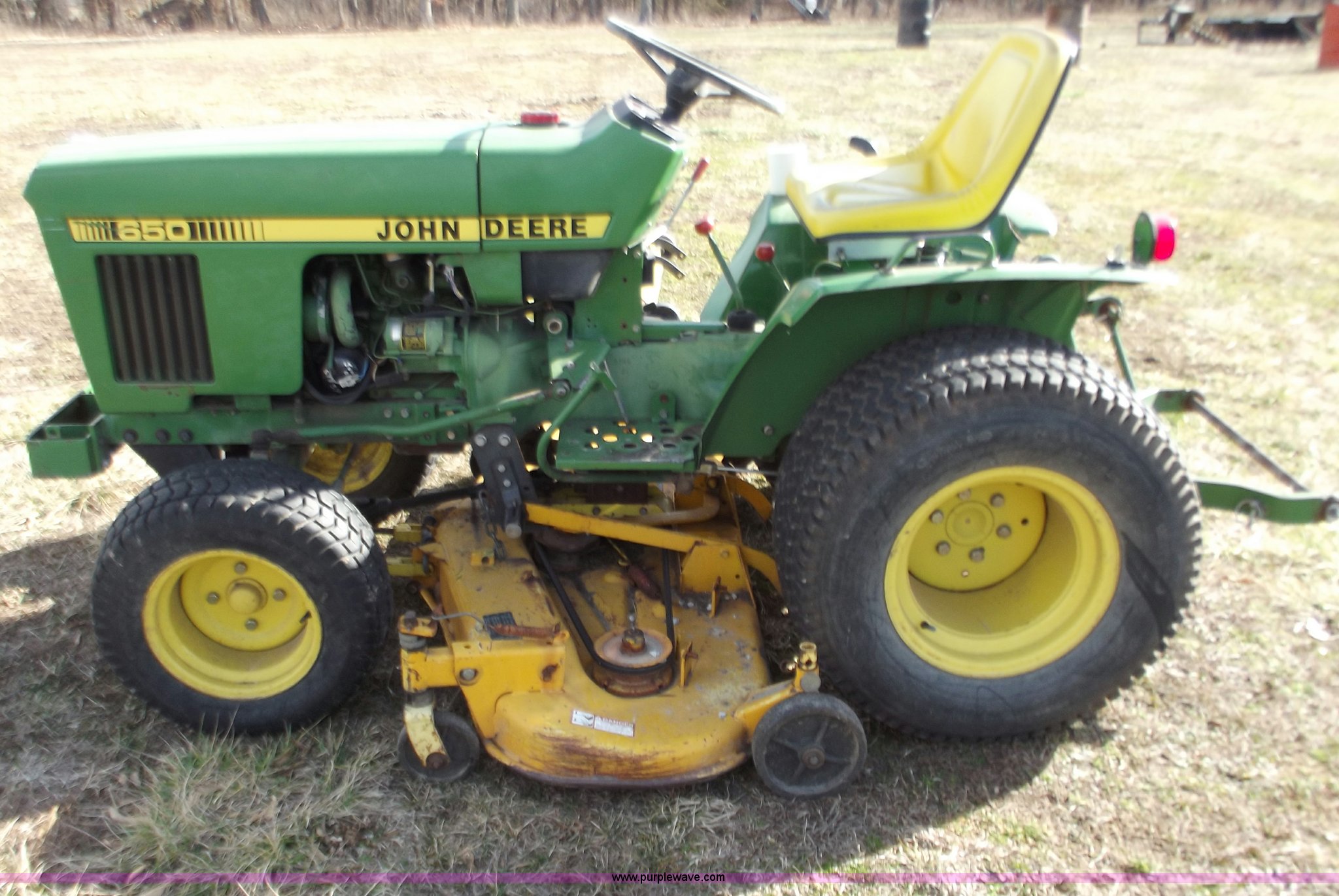 Purple Wave is selling a used Lawn Mower in Missouri. This item is a John Deere 650 lawn and garden tractor with the following: 1,310 hours on meter, Two cylinder diesel engine, Eight speed transmission, 60" mower deck, Front PTO shaft, mid and rear, Three point, Spring ride seat, 23x8.50-12 front tires, 31x15.5-15 rear tires, Serial CH0650S009866