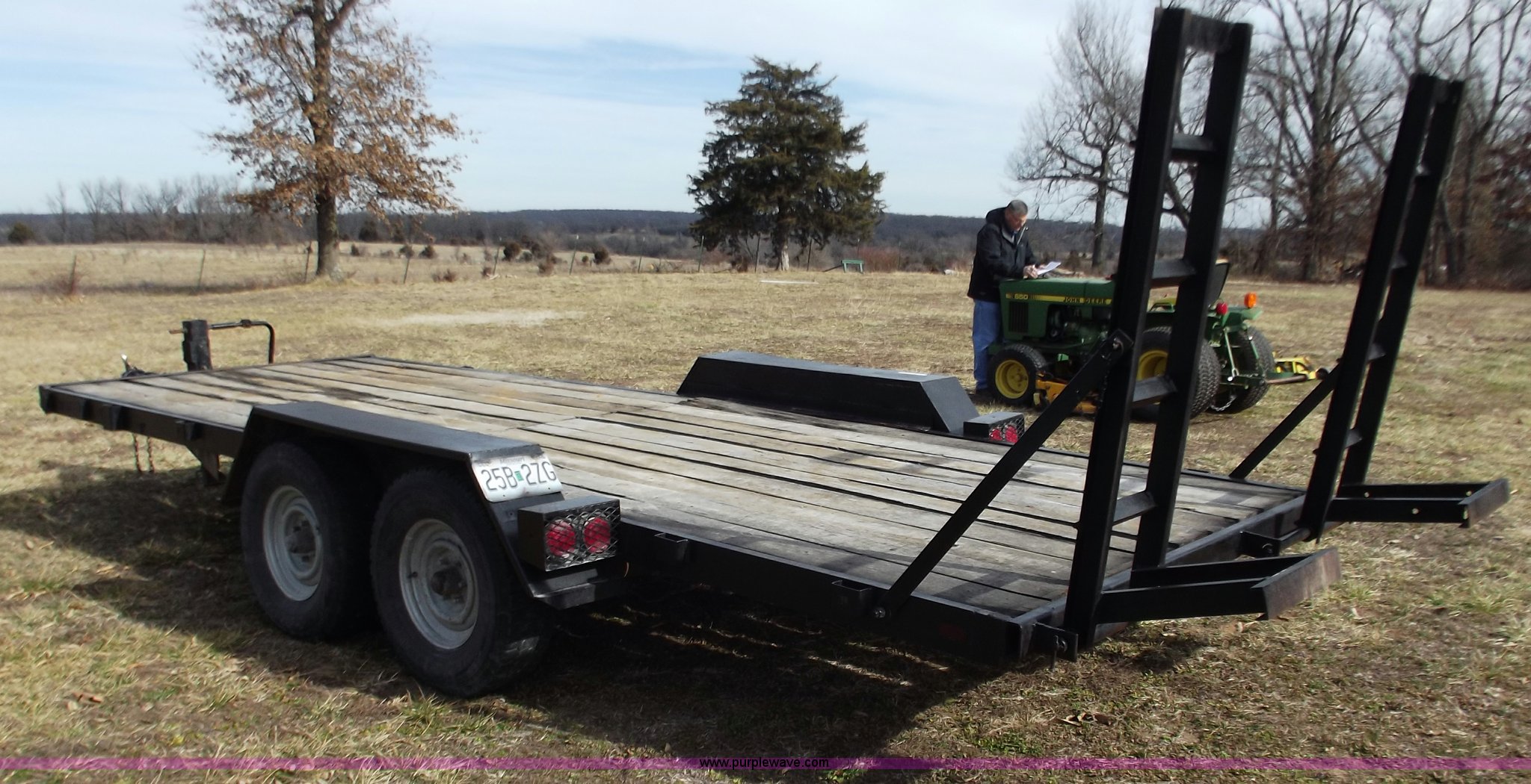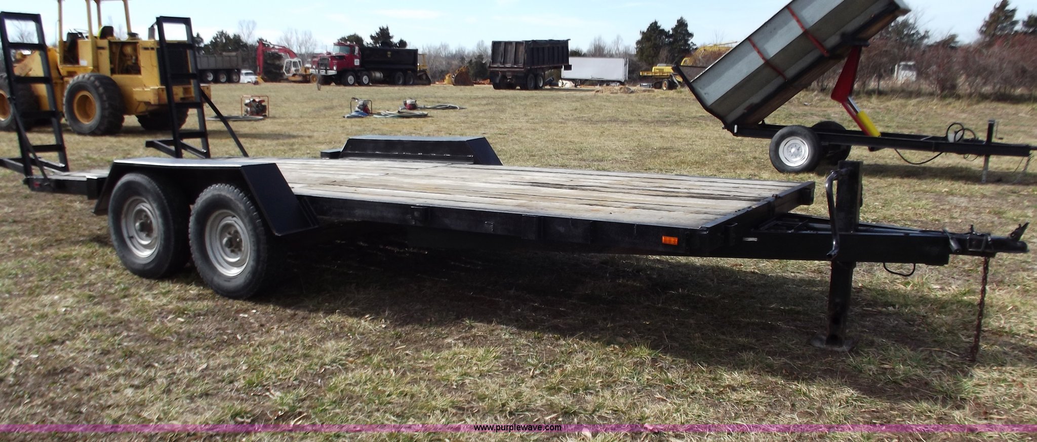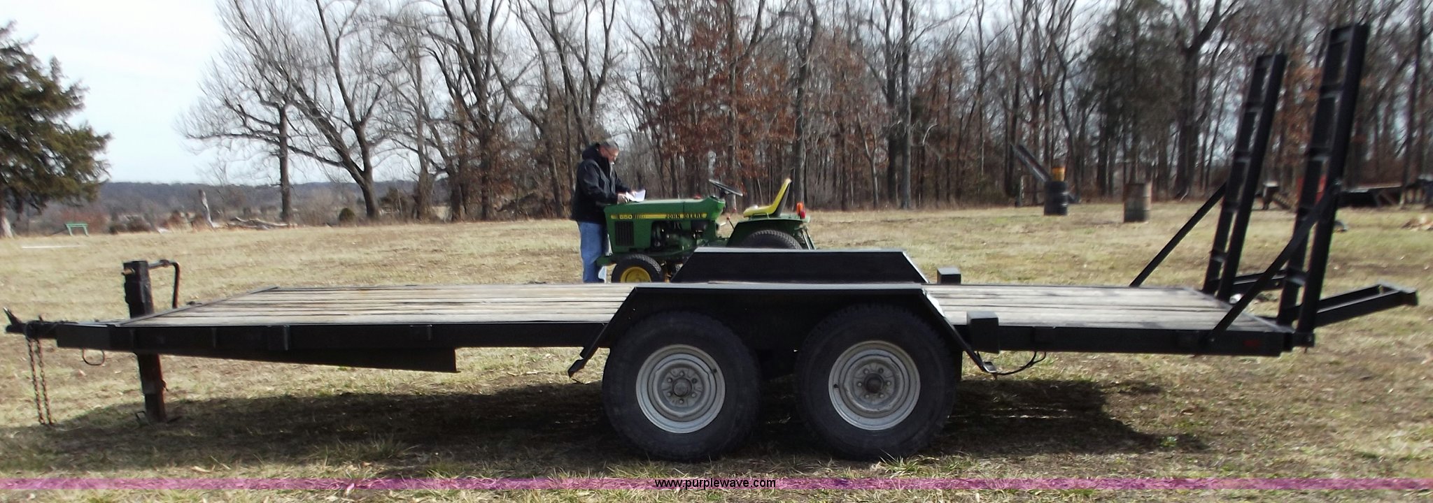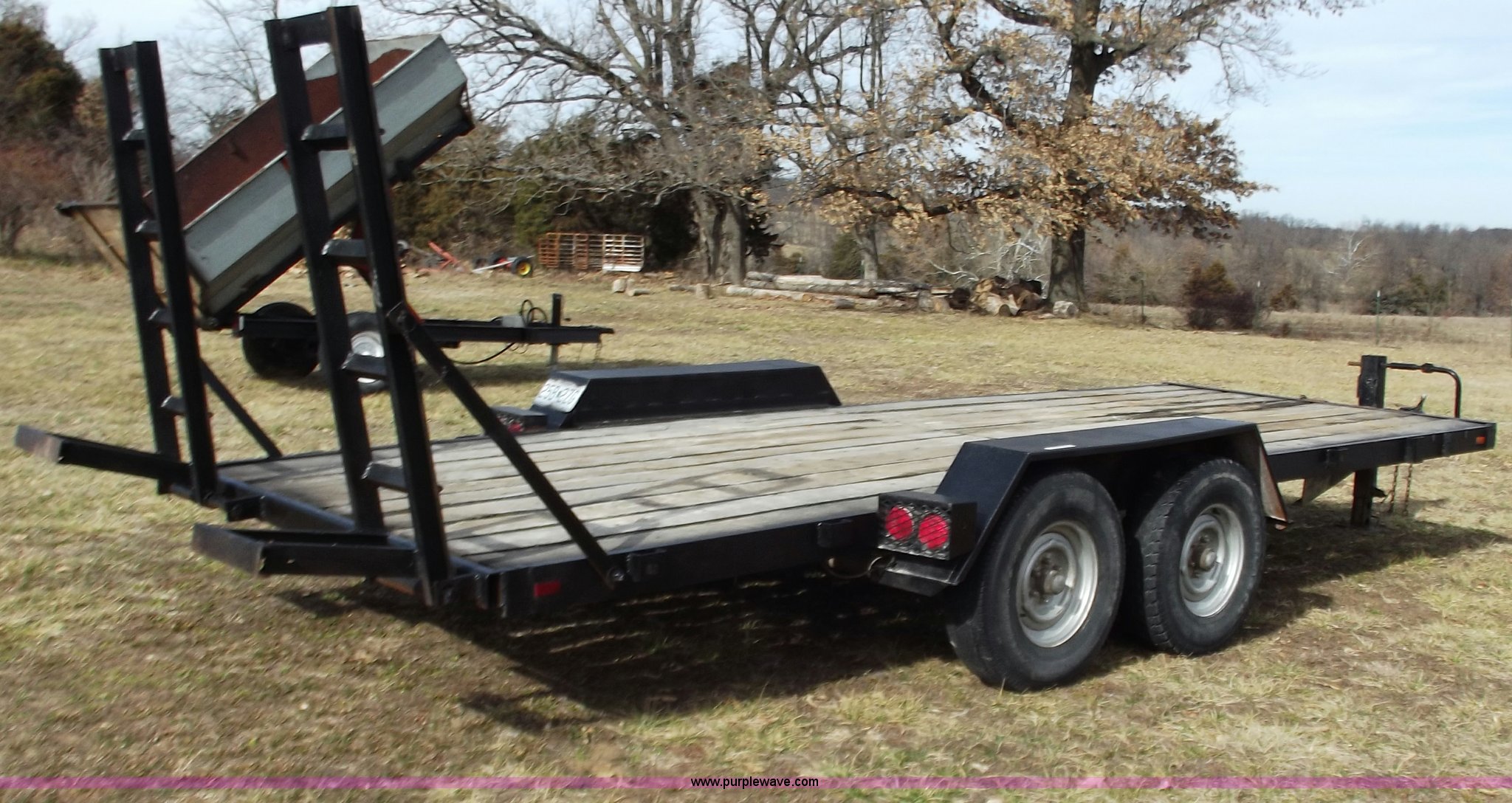 Purple Wave is selling a used Equip. Trailer in Missouri. This item is a 1995 shop built equipment trailer with the following: 20' x 7', (2) 5,000 lb axles, 5' fold down ramps, Steel fenders, Stake pockets, Electric brakes on both axles, Tongue jack, 2" ball, Spring suspension, 235/80R16 tires