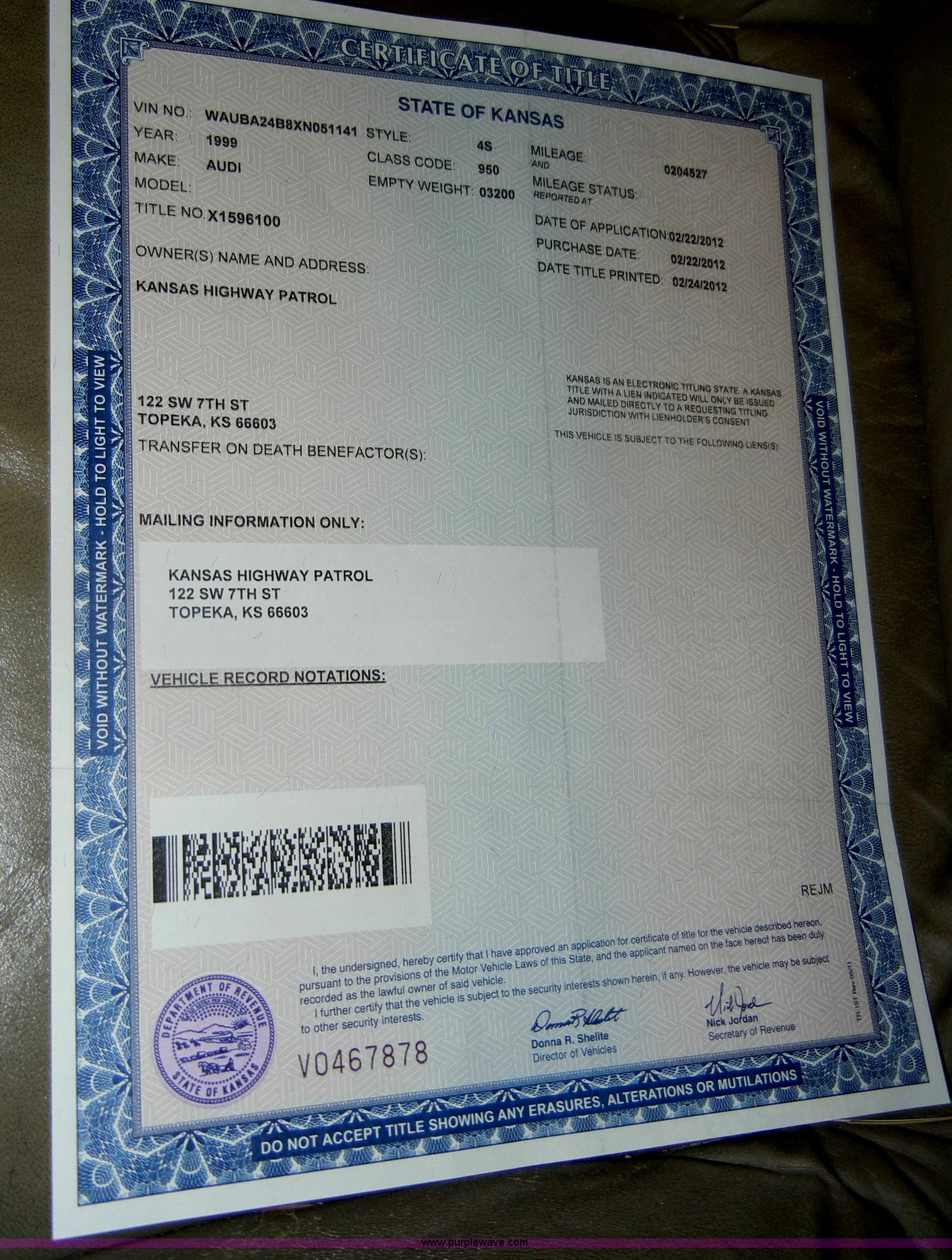 1999 Audi A6 Quattro. 204,535 miles on odometer, 2.8L V6 SFI engine, Automatic transmission, AC and heat, Tilt, Cruise, AM/FM/CD, Power windows, locks, mirrors, and seats, Heated seats, Vinyl interior, Sunroof, 205/55R16 tires, Interior/exterior cosmetic damage, Driver interior door panel missing, Service light on, Chipped windshield. Vehicle seized by the KHP. Please review KHP Disclaimer. Vehicle will be transferred with Kansas highway title. Title distribution may be delayed up to 14 days from verification of funds. WAUBA24B8XN051141. Shipping quotes available. 3501 NW Hwy 24. Topeka, KS 66618