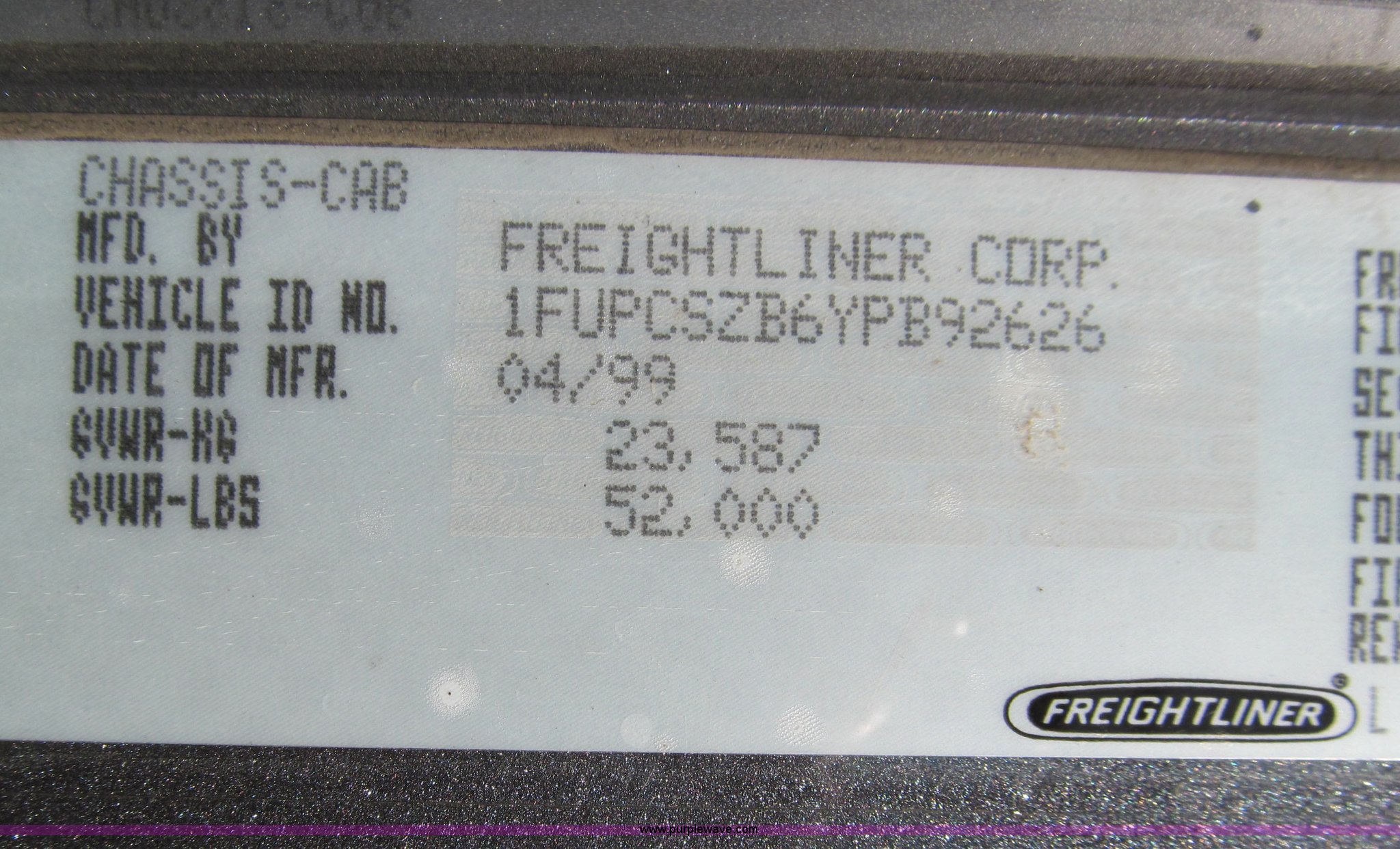 2000 Freightliner FLD120 Classic XL semi truck. 237,785 miles on odometer, Detroit Series 60 12.7L diesel engine, Eaton Fuller 13 speed manual transmission, Twin screw, AC and heat, Tilt, AM/FM/CD, Air ride seat, Power windows, High Top 60" sleeper Dual bunks, Storage, Side and front windows, Exterior visor, Bumper, Block heater, (2) 140 gallon fuel tanks, Dual exhaust stacks, Aluminum deck plate, (2) aluminum step battery boxes, (2) aluminum side mount toolboxes, (2) chrome air breathers, Air suspension, Air brakes, Jake brake, GVWR 52,000 lbs, FAWR 12,000 lbs, IAWR 20,000 lbs, RAWR 20,000 lbs. Title distribution may be delayed up to 14 days from verification of funds. 1FUPCSZB6YPB92626. Shipping quotes available. A to Z. Mountain View, MO 65548