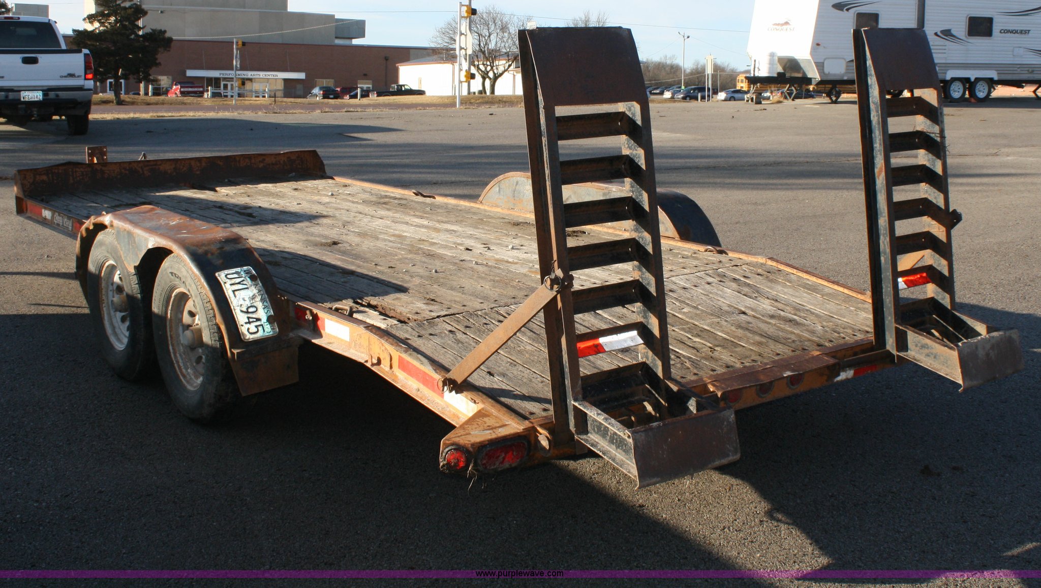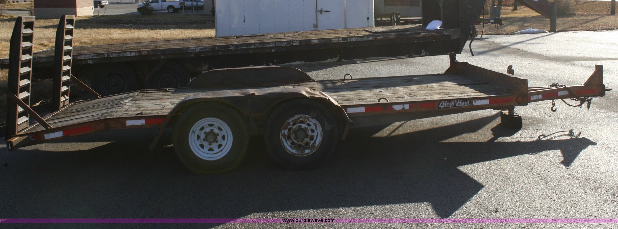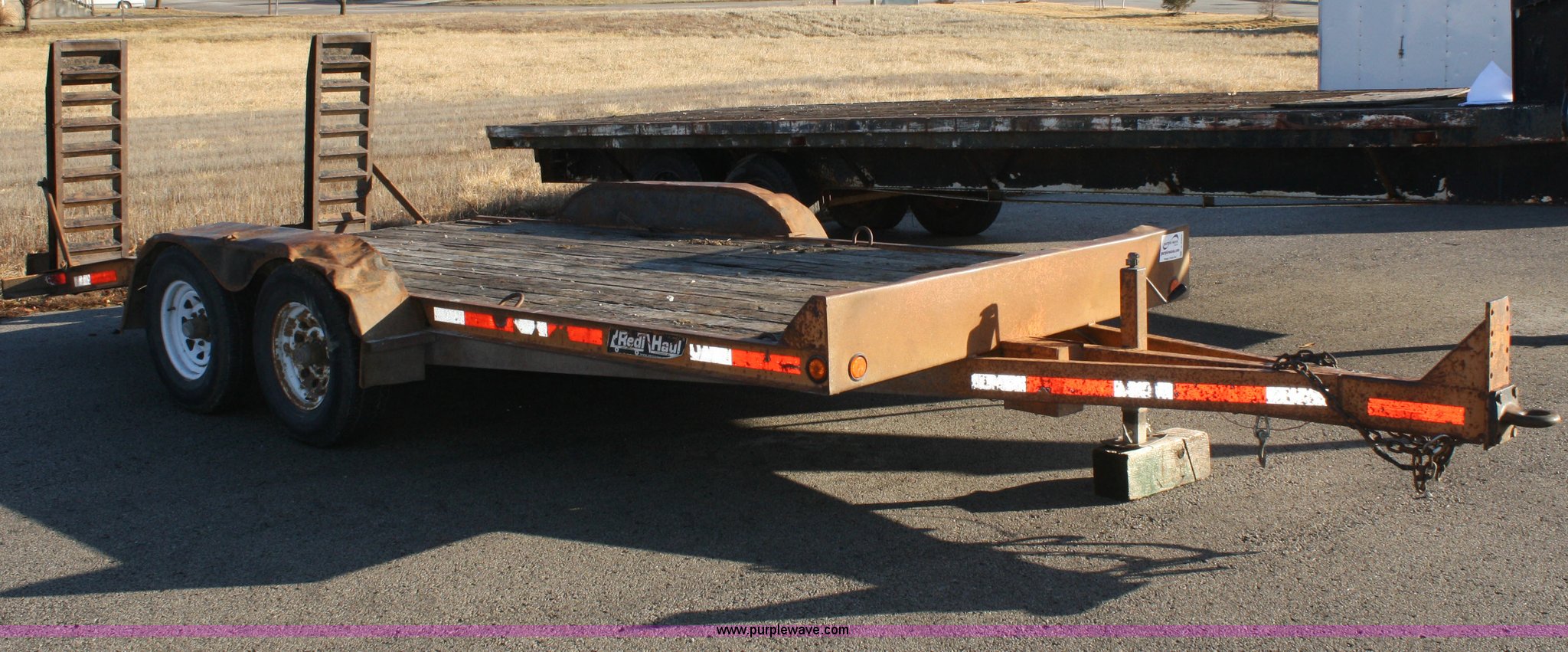 Purple Wave is selling a used Equip. Trailer in Kansas. This item is a 2001 Redi Haul 14' double axle trailer with the following: 82" wood deck, 3' tail, (2) 5,000 lbs axles, 4' fold up ramps, Pintle hitch, 225/75R15 tires