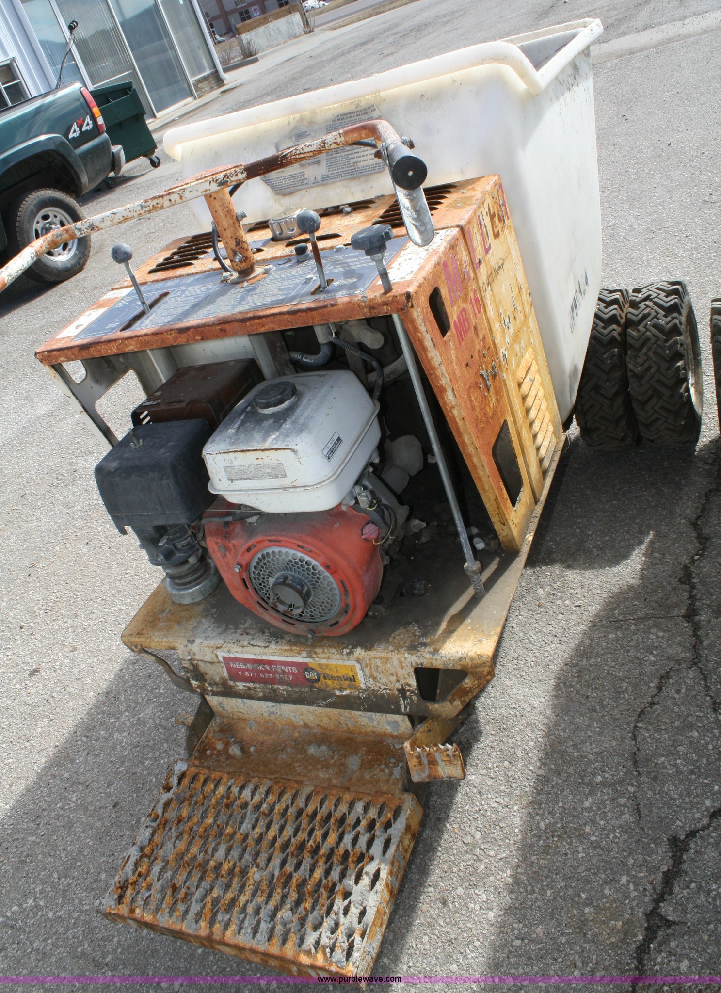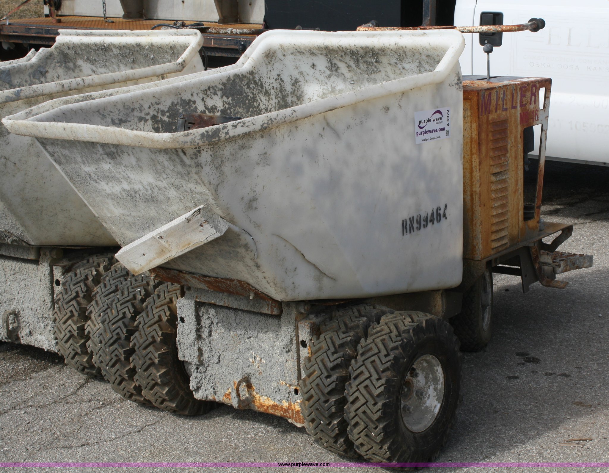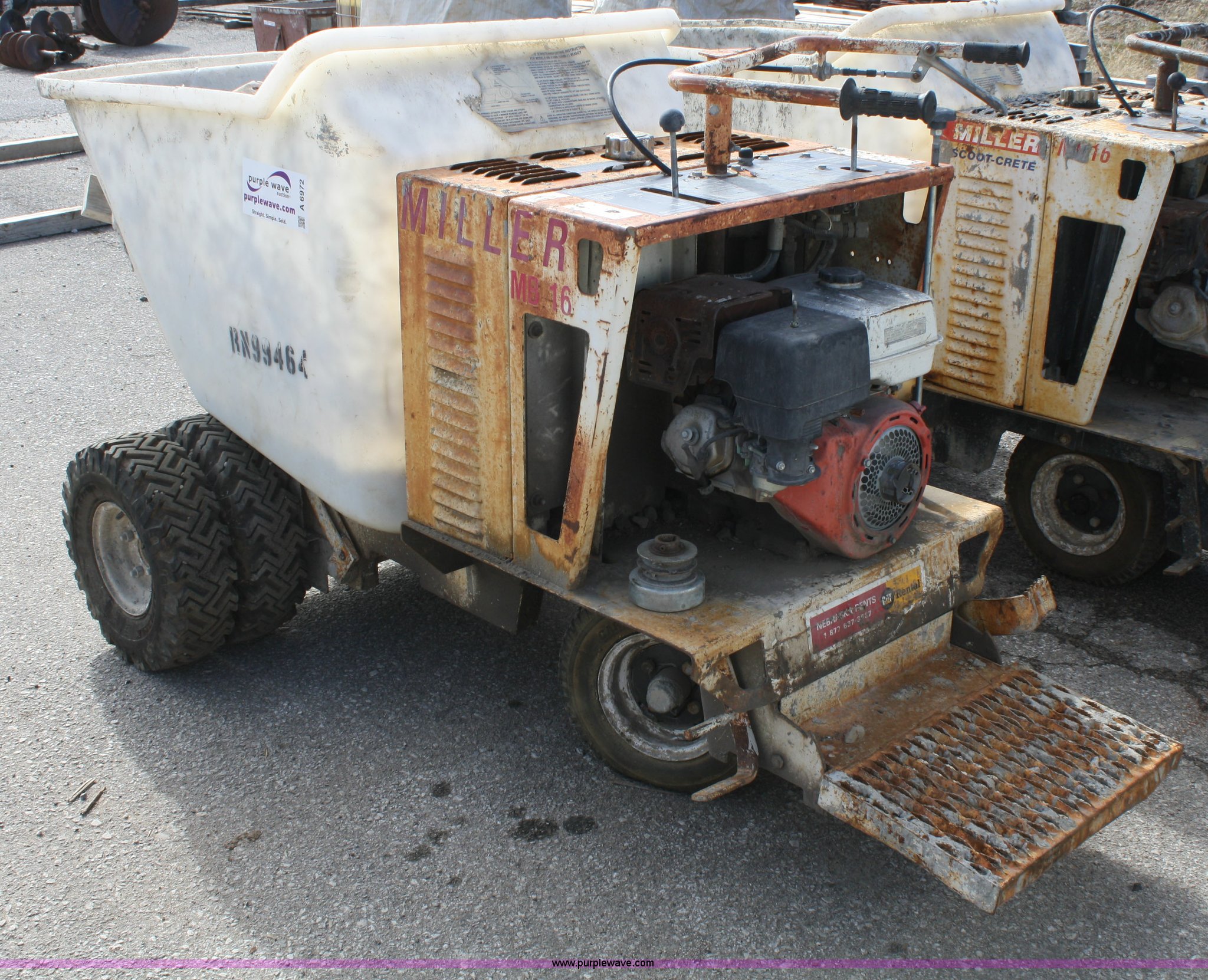 Purple Wave is selling a used Concrete Equip. or Acces. in Kansas. This item is a Miller MB16 concrete buggy with the following: Honda engine, Does not run, Self propelled, 2/3 cu.yd. capacity, Crack in plastic hopper, 5.7-8 tires, Serial G13591