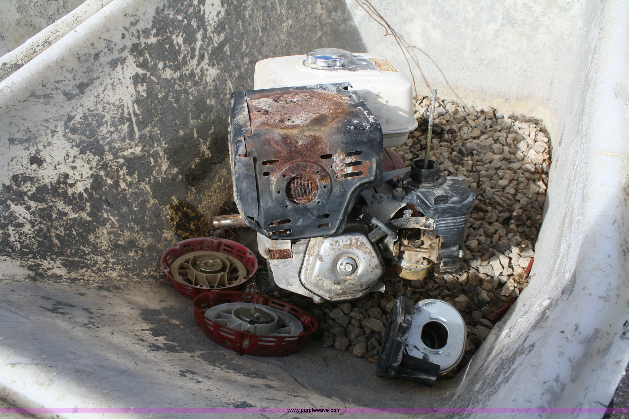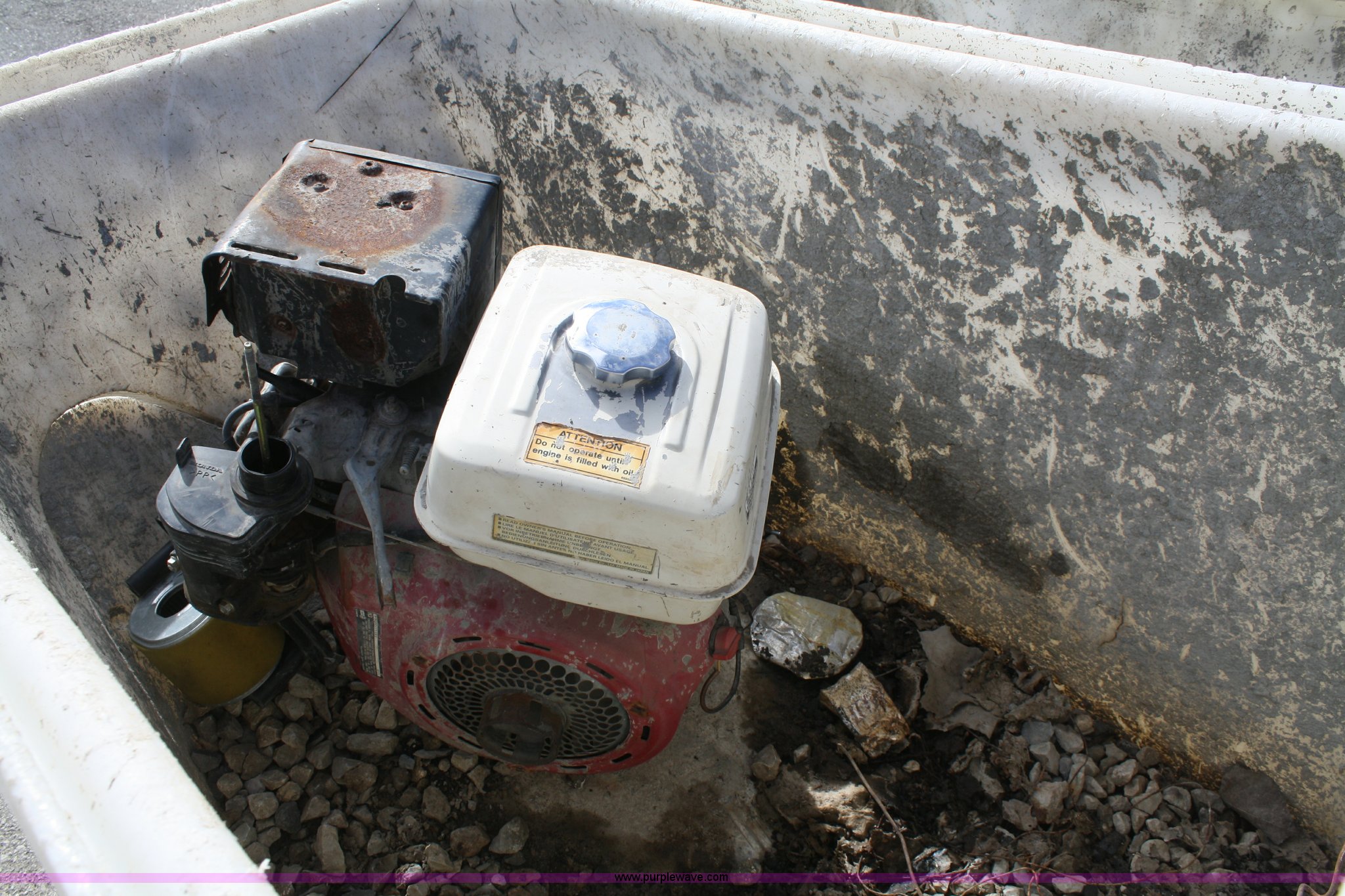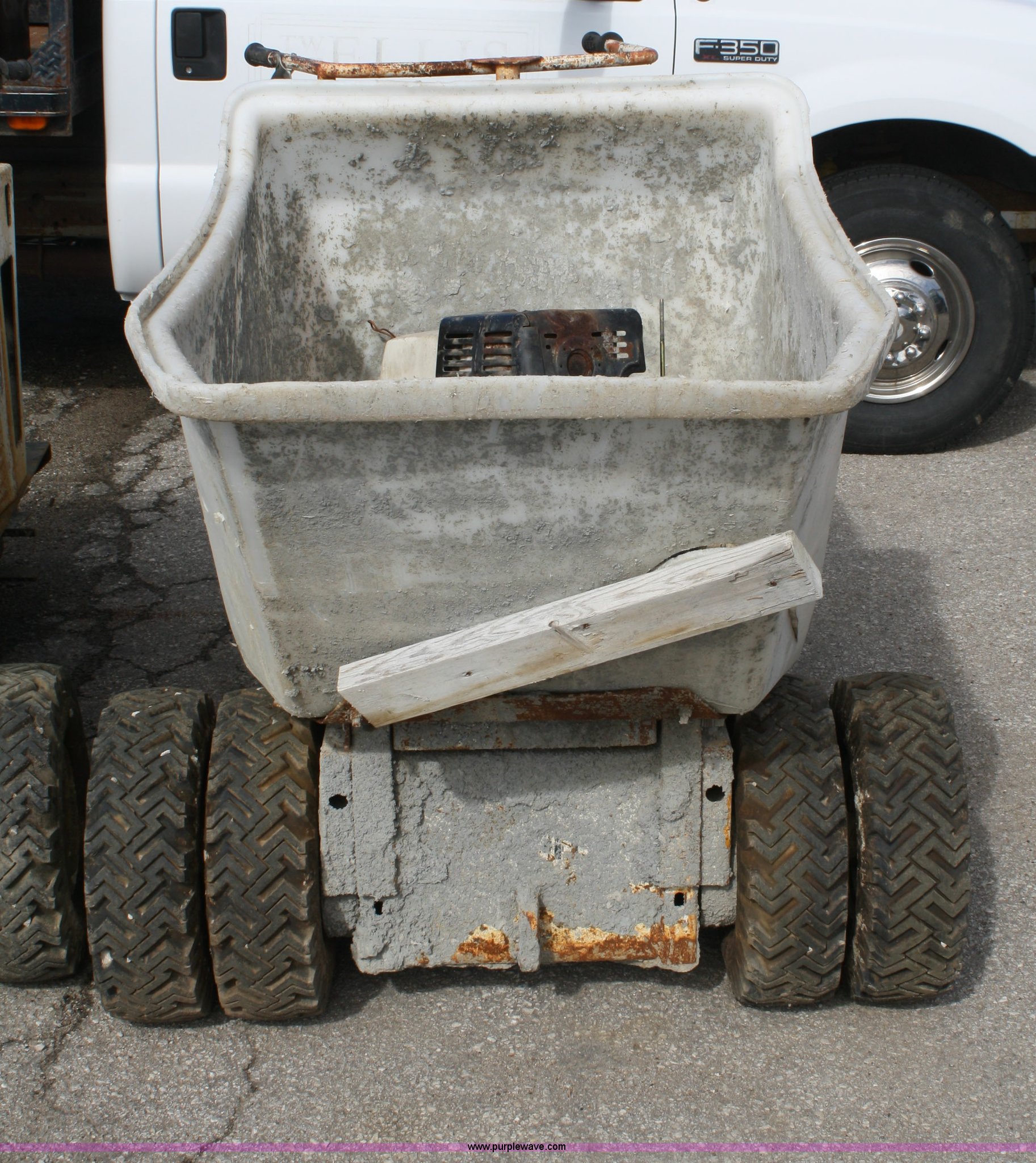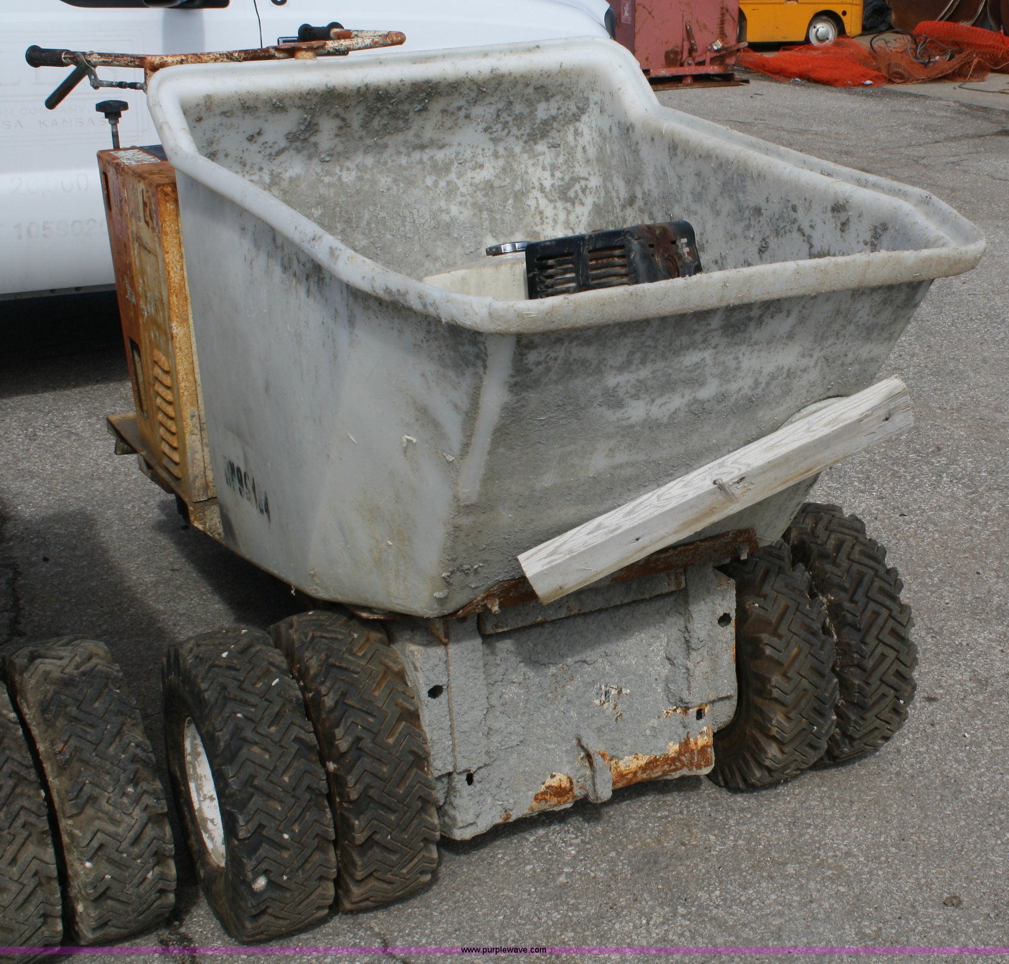 Purple Wave is selling a used Concrete Equip. or Acces. in Kansas. This item is a Miller MB16 concrete buggy with the following: Honda engine, Does not run, Self propelled, 2/3 cu.yd. capacity, Crack in plastic hopper, 5.7-8 tires, Serial G13591
