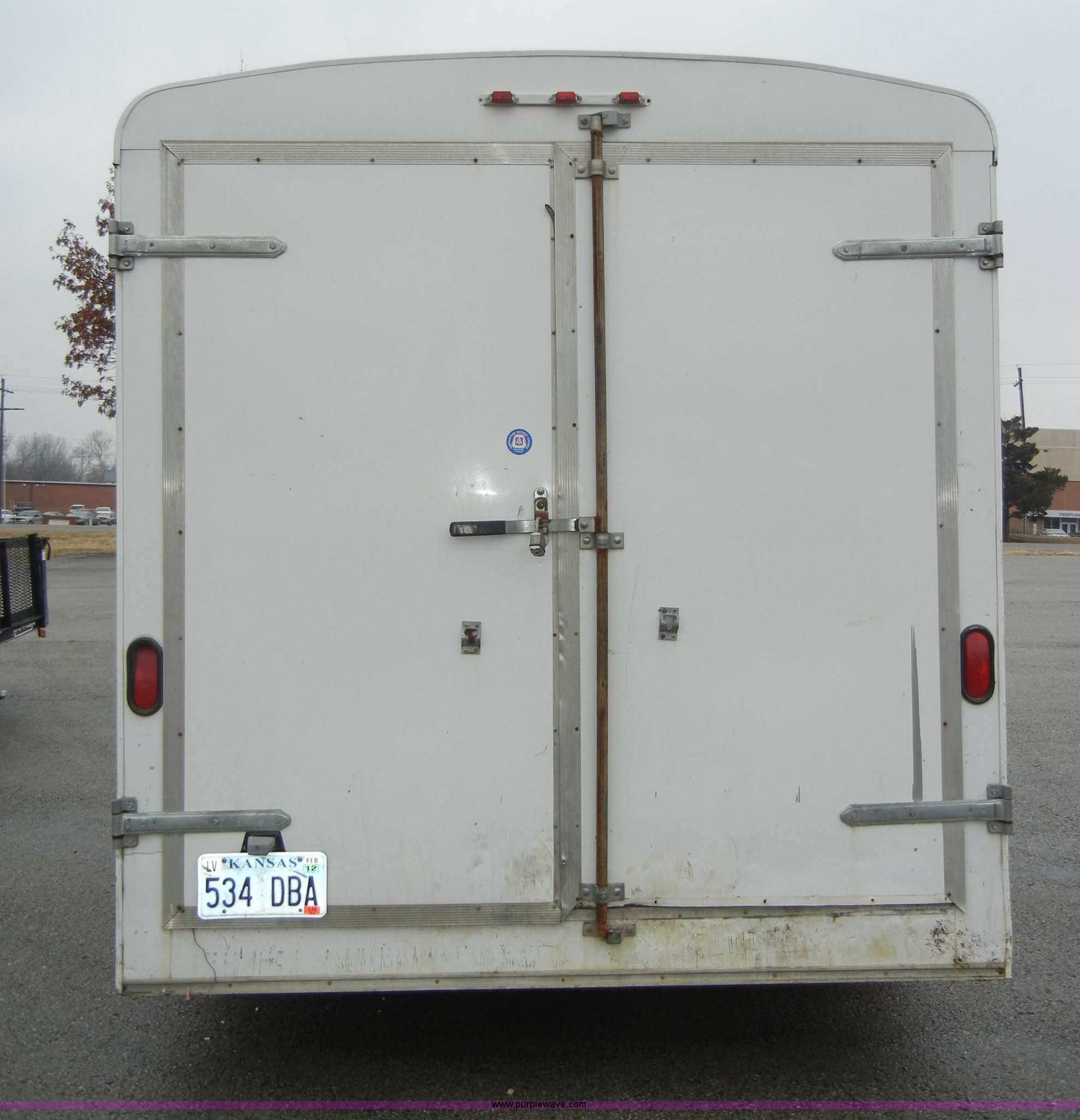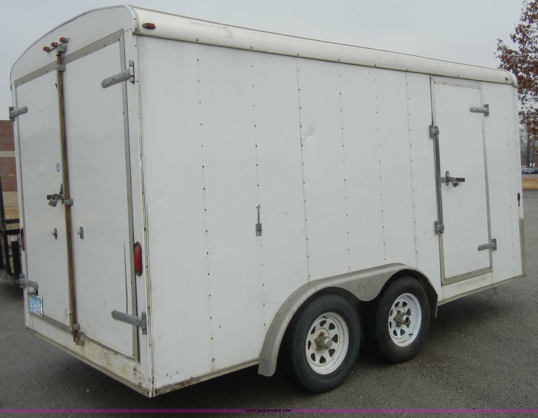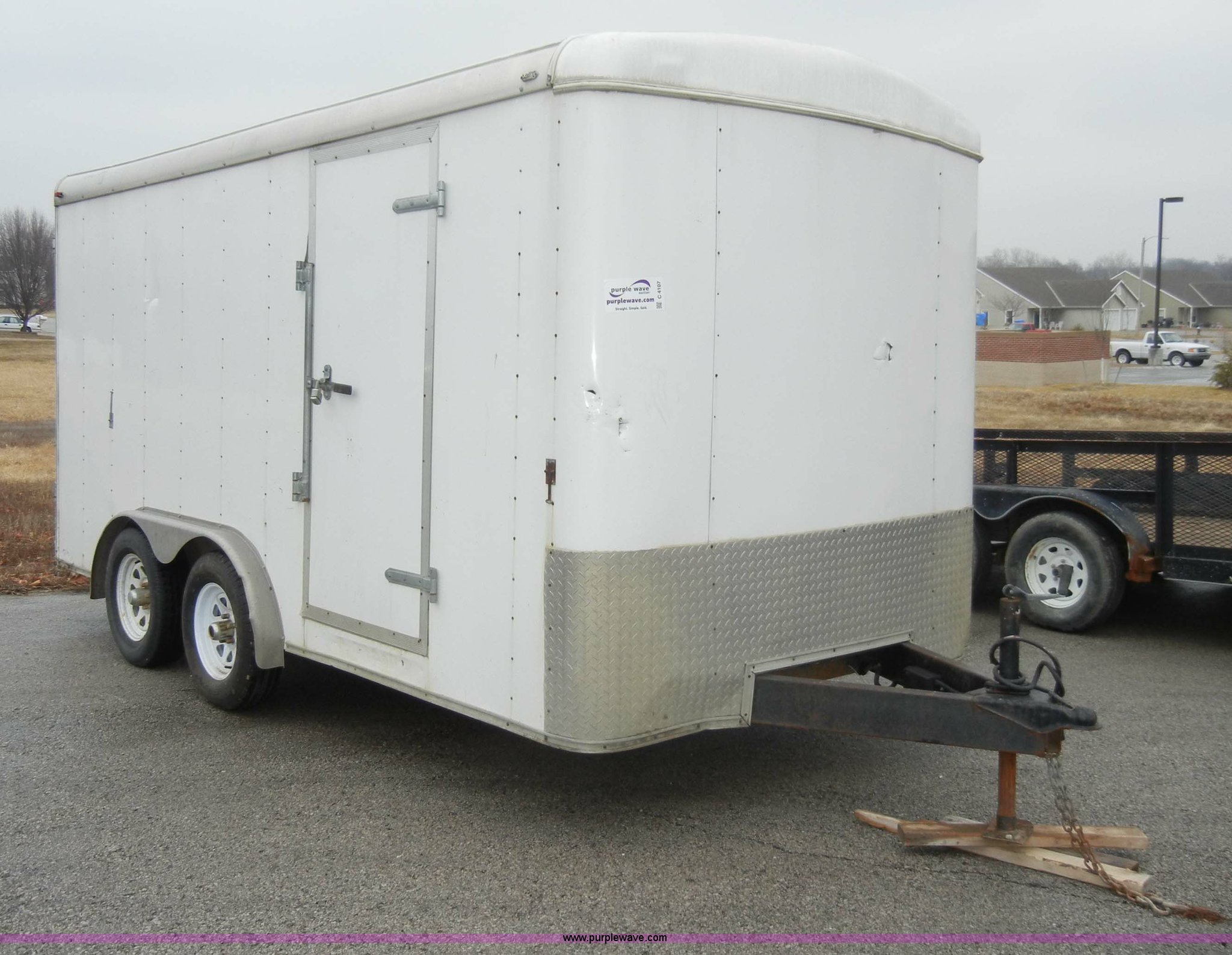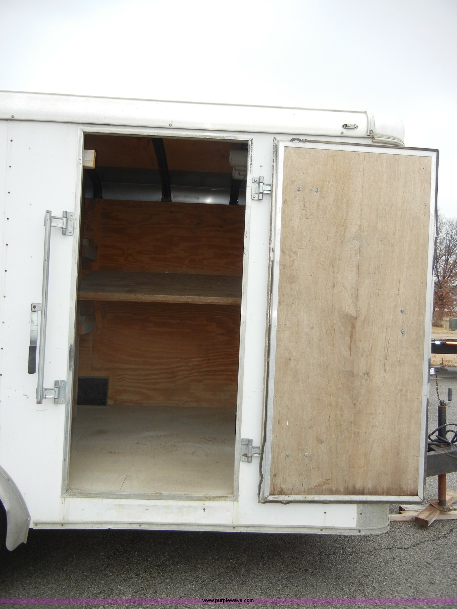 Purple Wave is selling a used Enclosed Cargo Trailer in Kansas. This item is a 2002 14' enclosed trailer with the following: Tandem axle, 7' wide, 7' high, Double rear entry doors, Single side entry door, Wood deck, Shelving and table, 2 5/16" ball hitch, Jack, chains, and lights, Exterior cosmetic damage