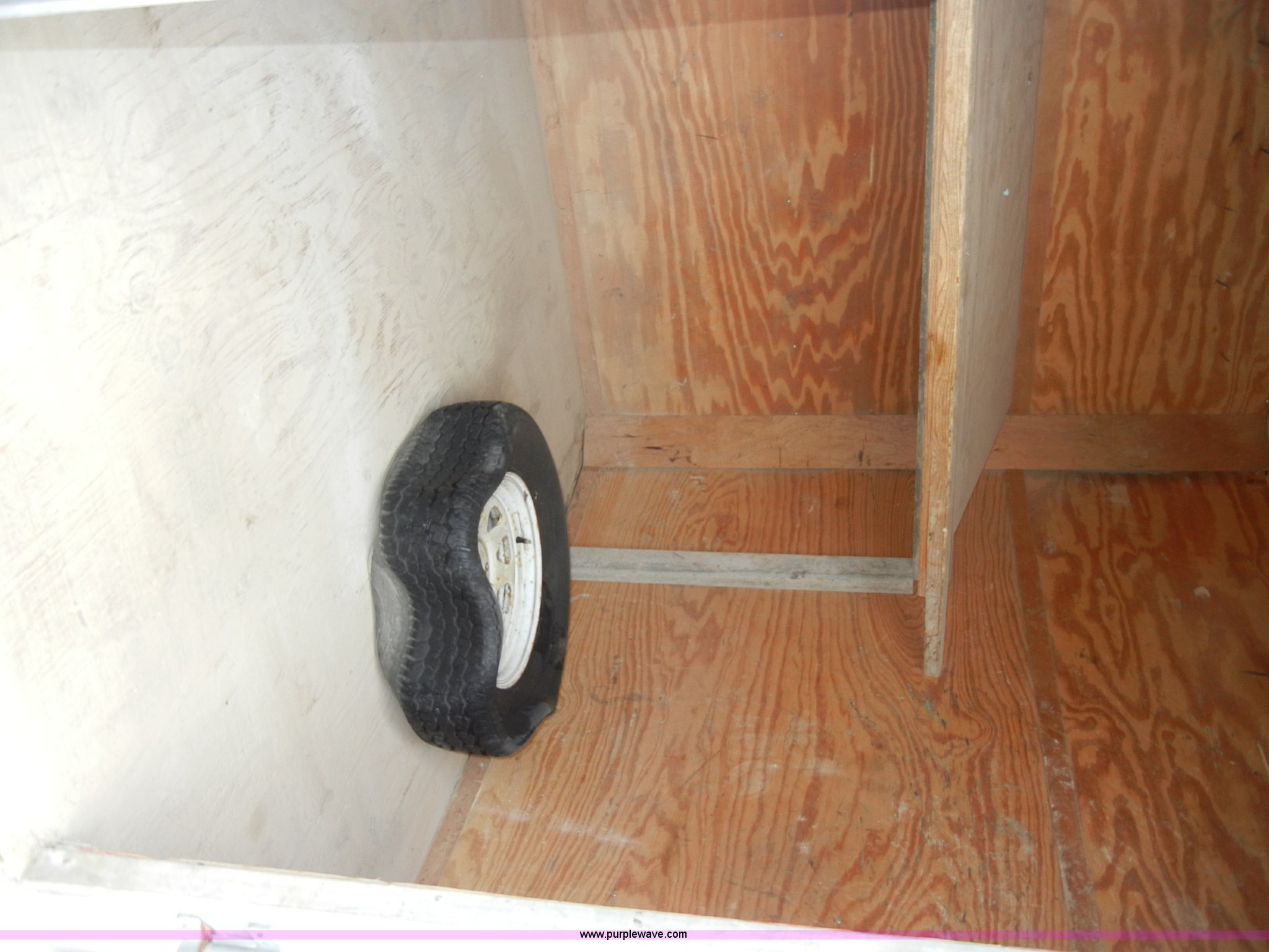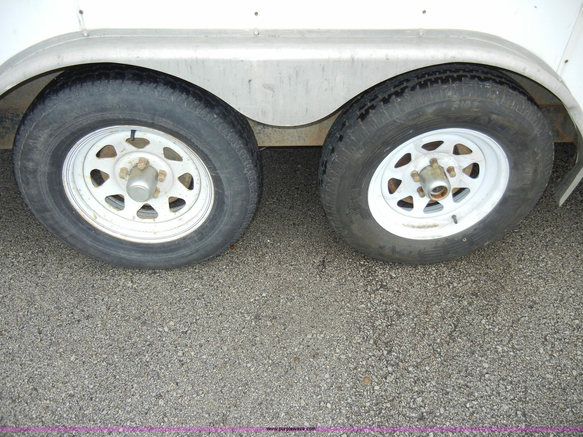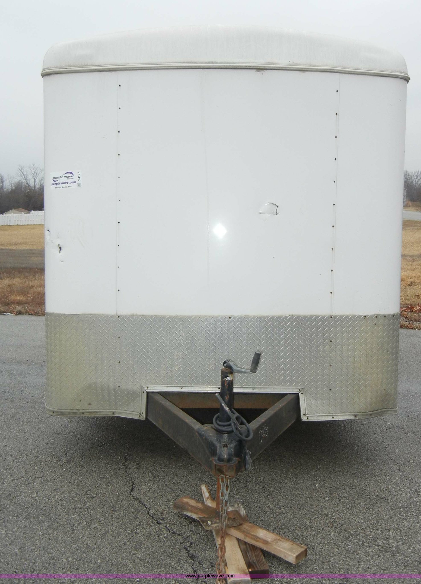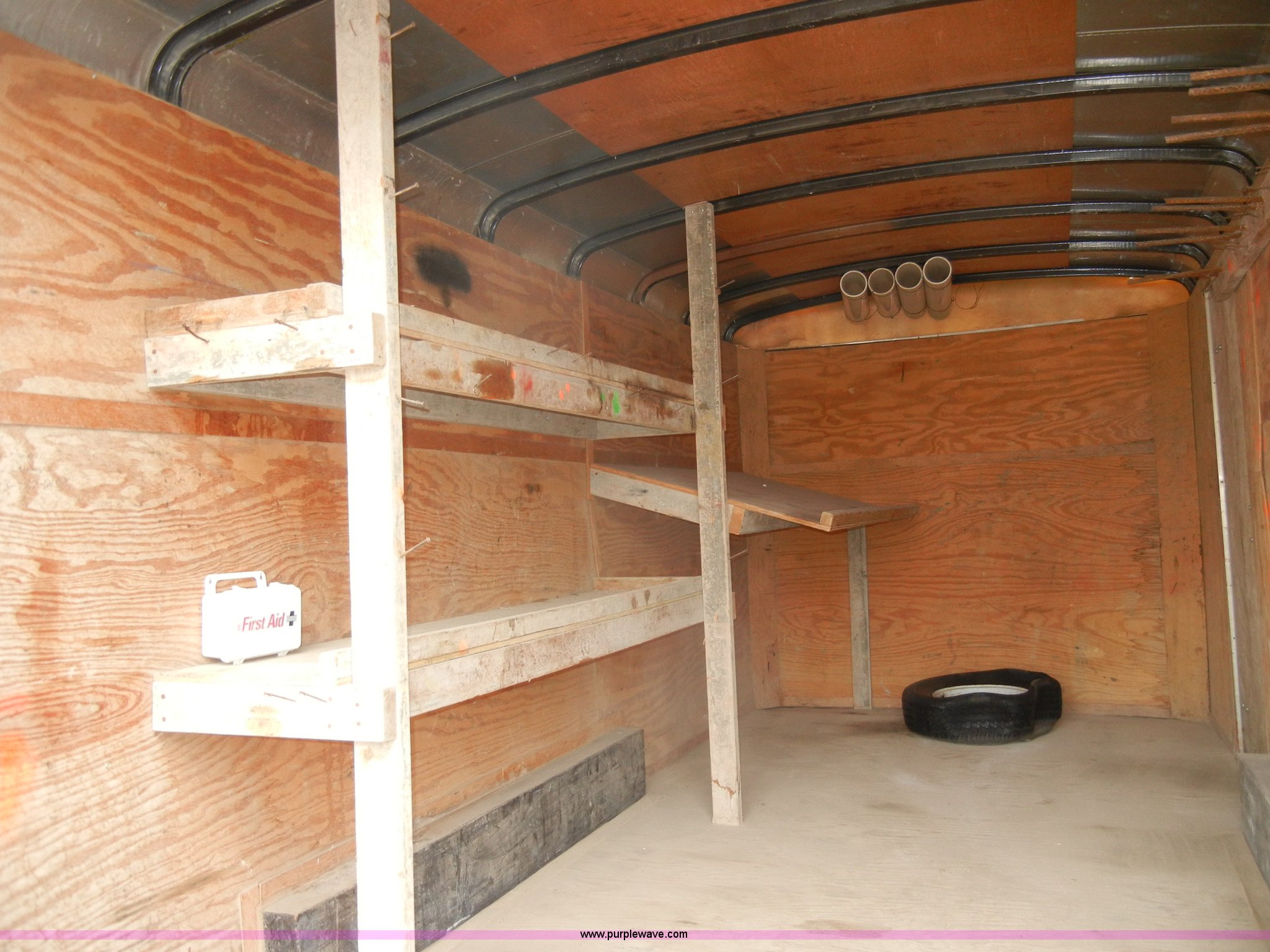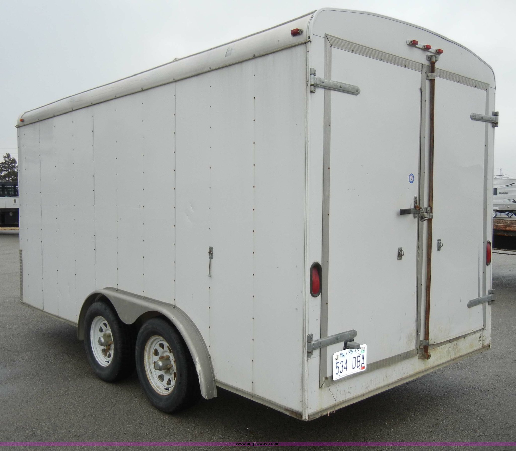Purple Wave is selling a used Enclosed Cargo Trailer in Kansas. This item is a 2002 14' enclosed trailer with the following: Tandem axle, 7' wide, 7' high, Double rear entry doors, Single side entry door, Wood deck, Shelving and table, 2 5/16" ball hitch, Jack, chains, and lights, Exterior cosmetic damage