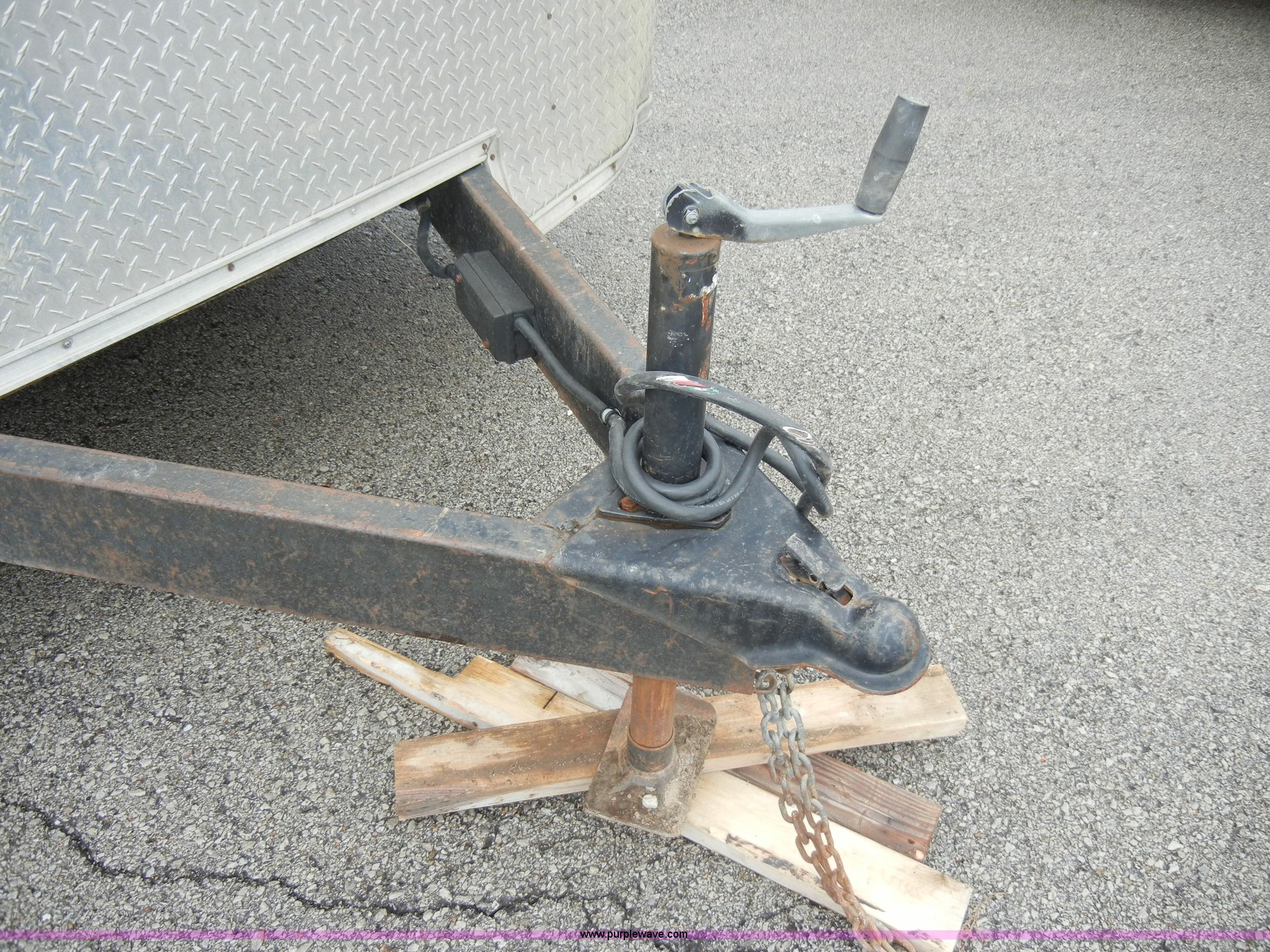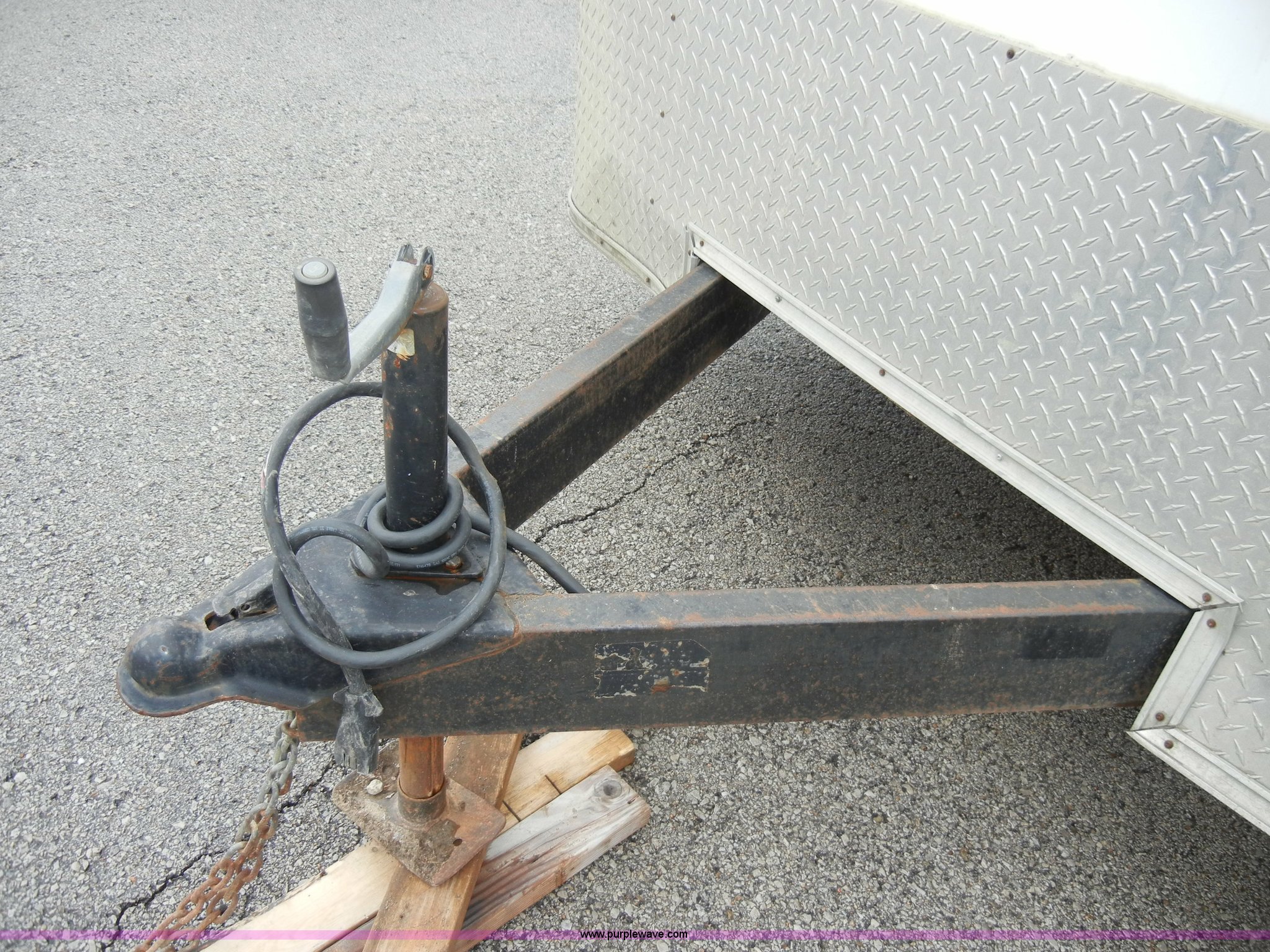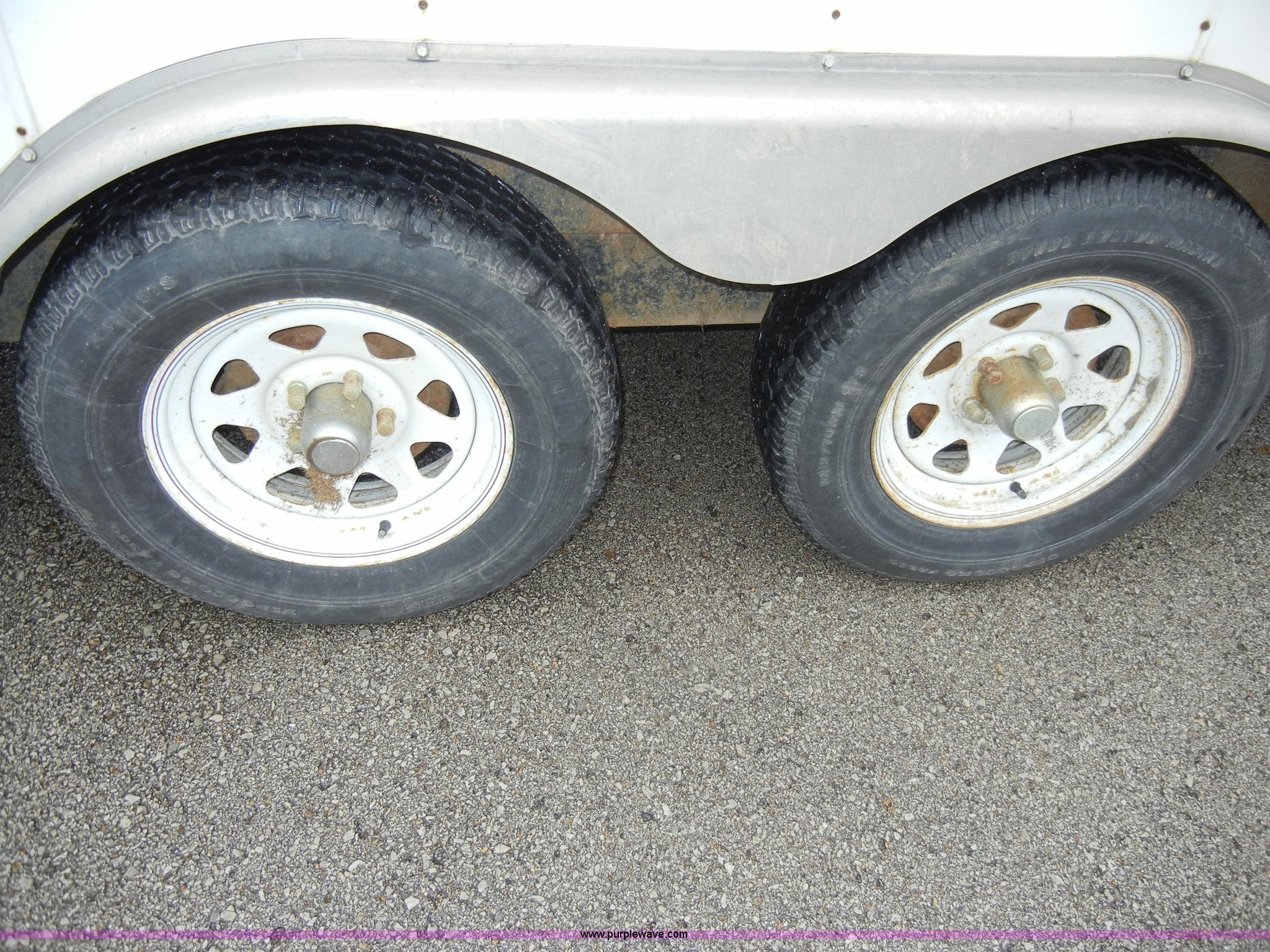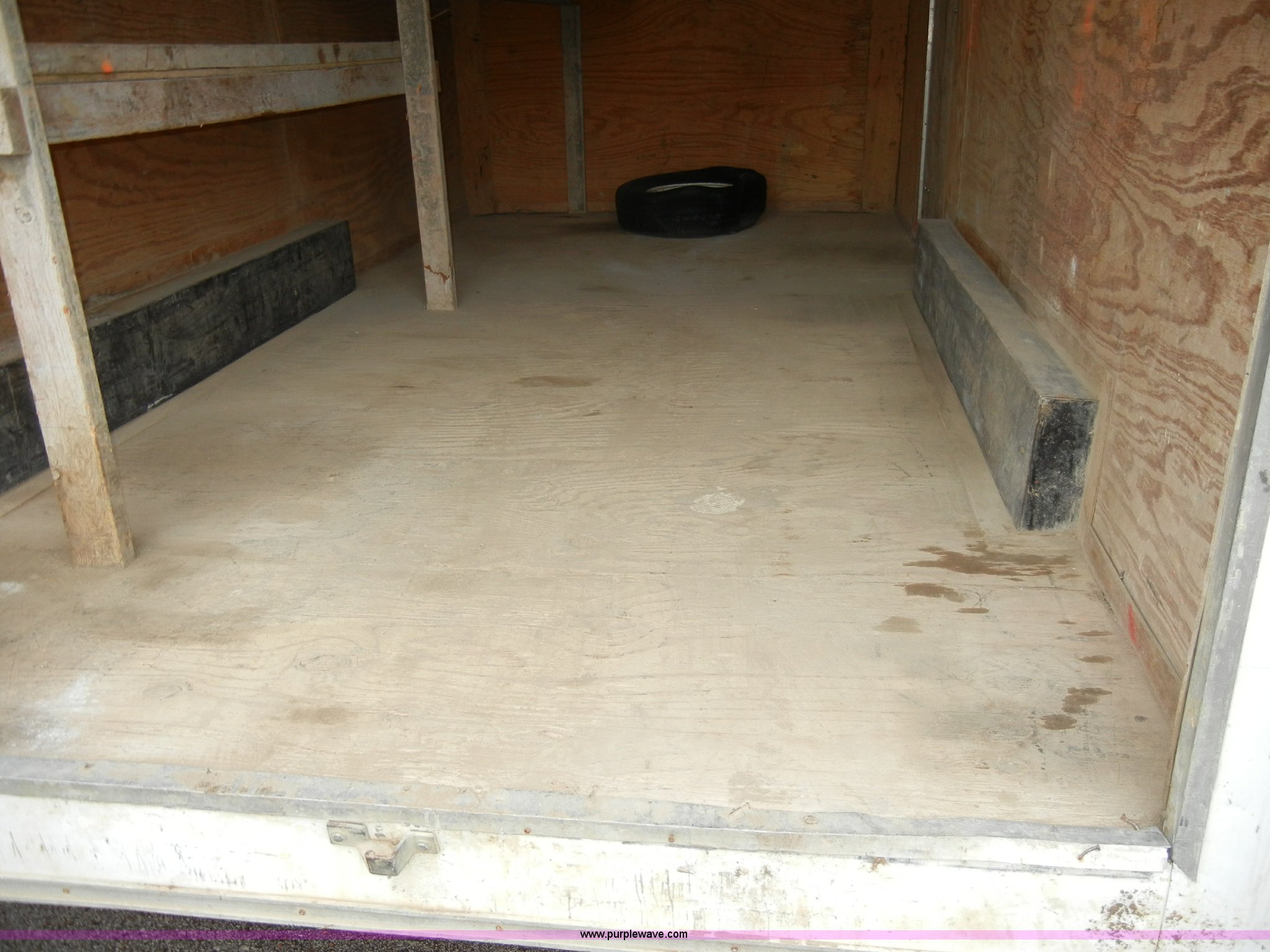 Purple Wave is selling a used Enclosed Cargo Trailer in Kansas. This item is a 2002 14' enclosed trailer with the following: Tandem axle, 7' wide, 7' high, Double rear entry doors, Single side entry door, Wood deck, Shelving and table, 2 5/16" ball hitch, Jack, chains, and lights, Exterior cosmetic damage