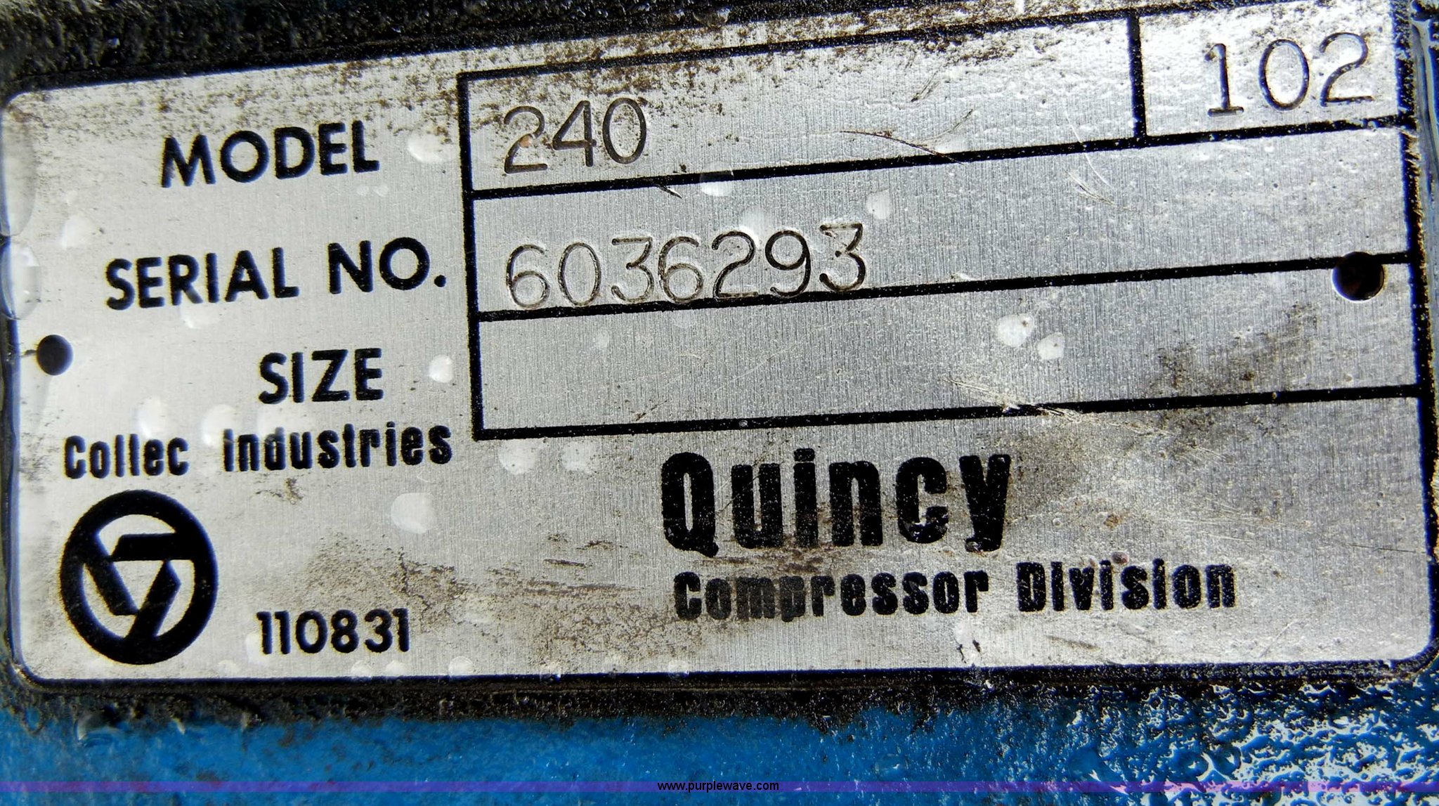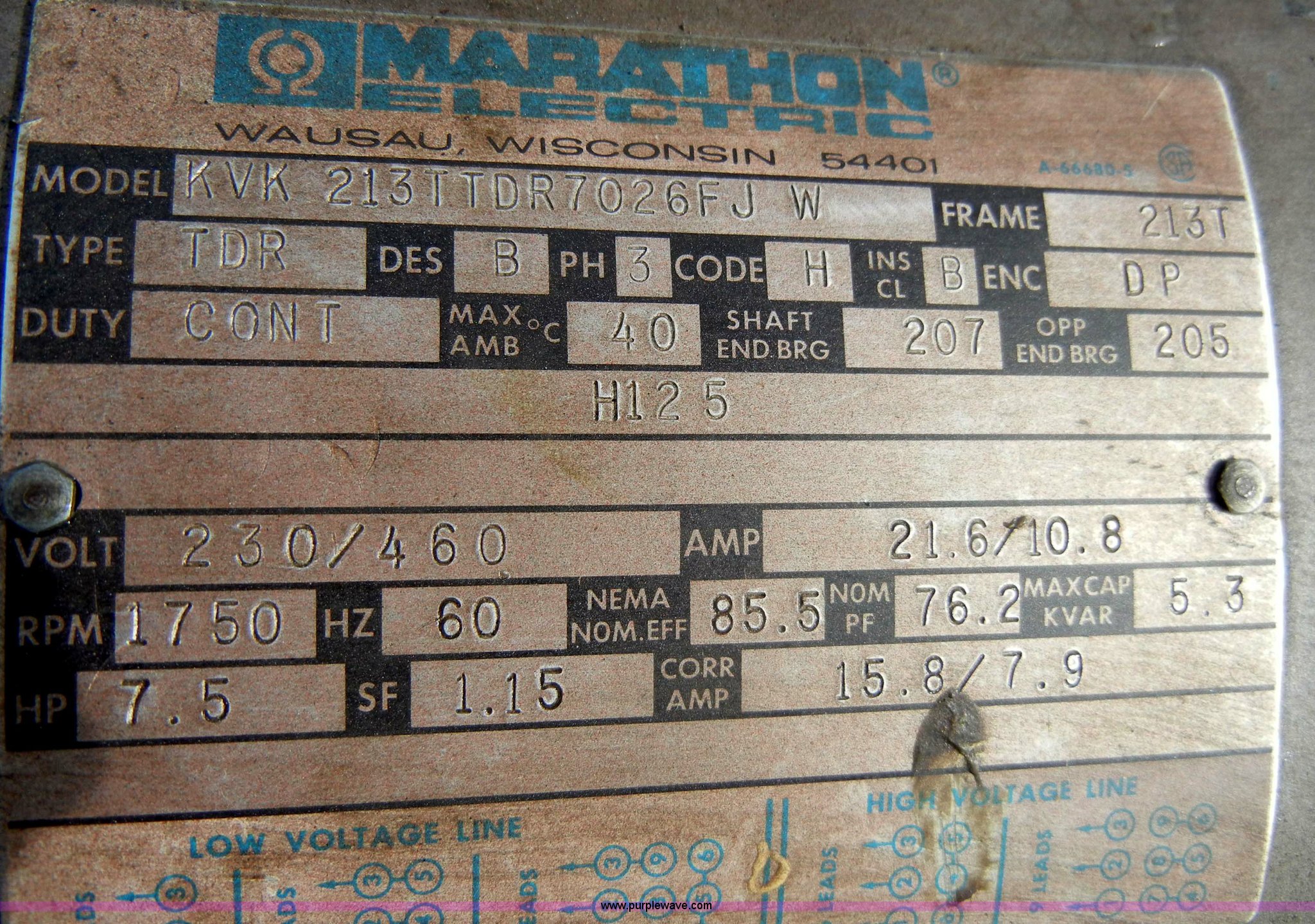 National 200 gallon air compressor. Marathon 7.5 HP electric motor, 230/460 volt, Three phase, 1,750 RPM, Quincy compressor Model 240, Serial 6036293, Model KVK213TTDR7026FJW, CPN E66385T236490871. Shipping quotes available. T.W. Ellis Construction. 325 Hwy 24/40. Tonganoxie, KS 66086