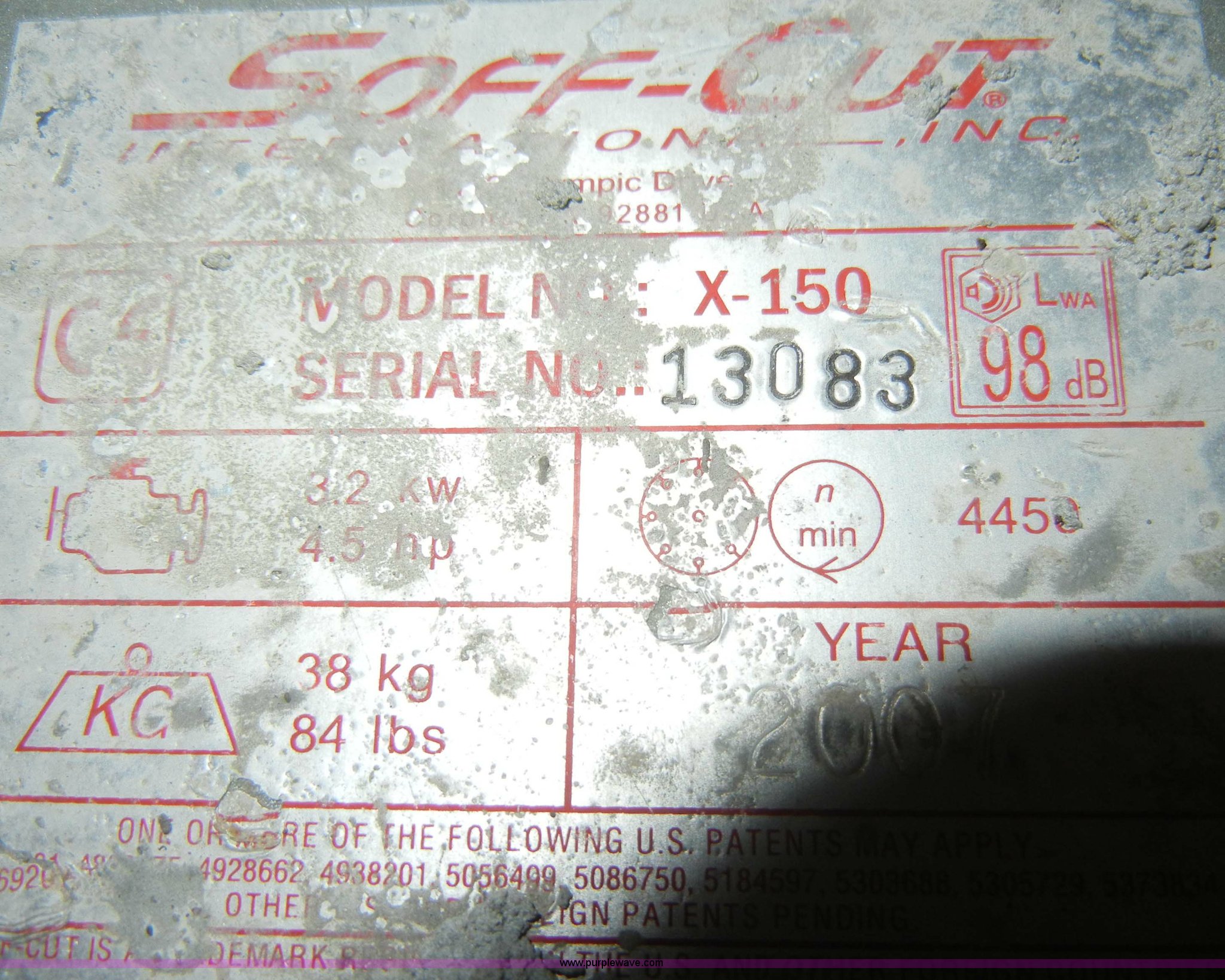 Soff Cut concrete saw. Moder X-150, 6" blade, Robin 4.5hp engine, Guide marker, Serial 13083. Shipping quotes available. T.W. Ellis Construction. 325 Hwy 24/40. Tonganoxie, KS 66086