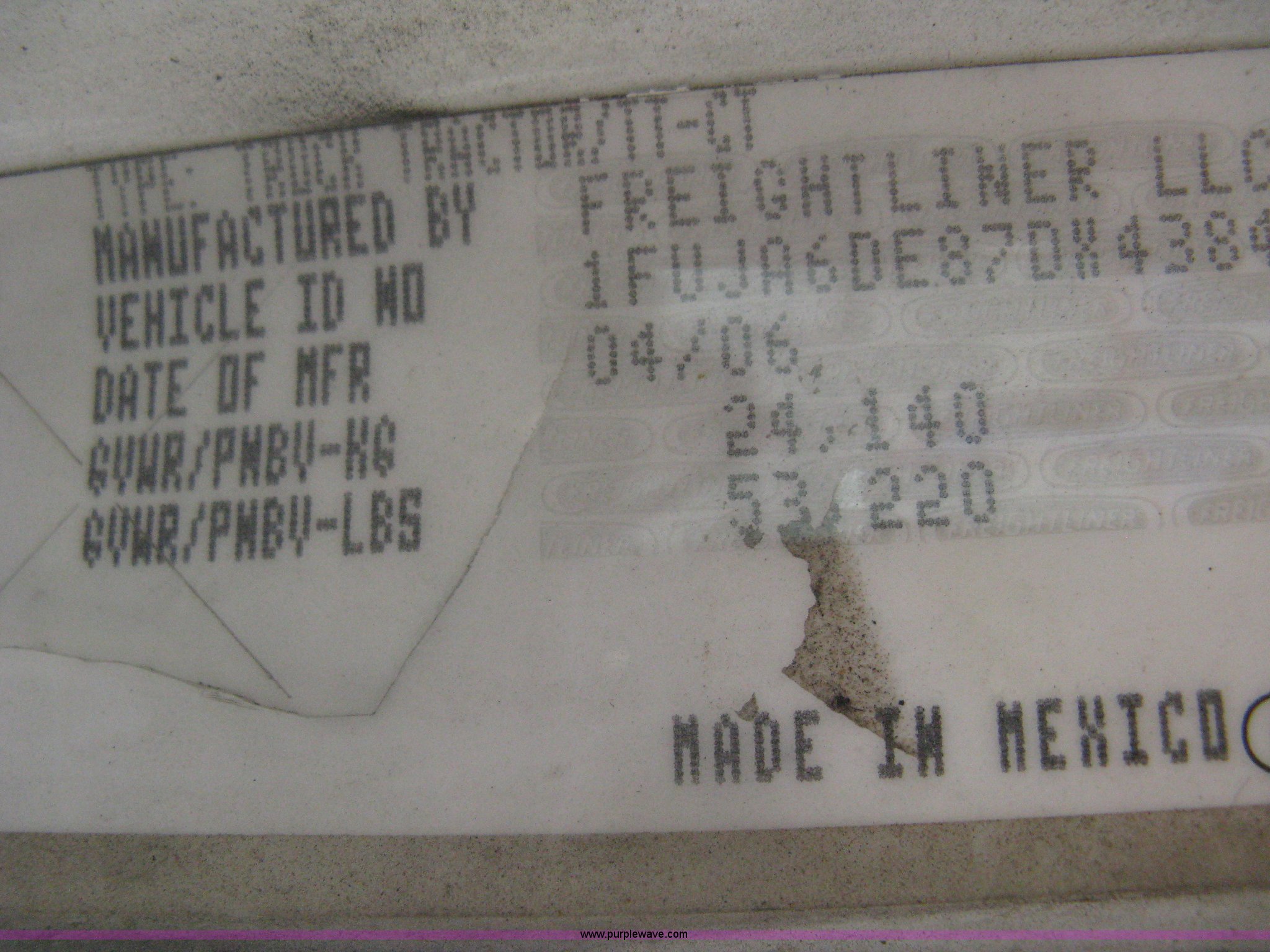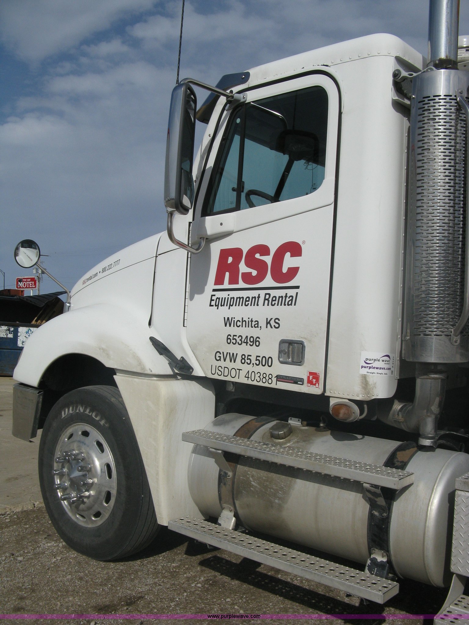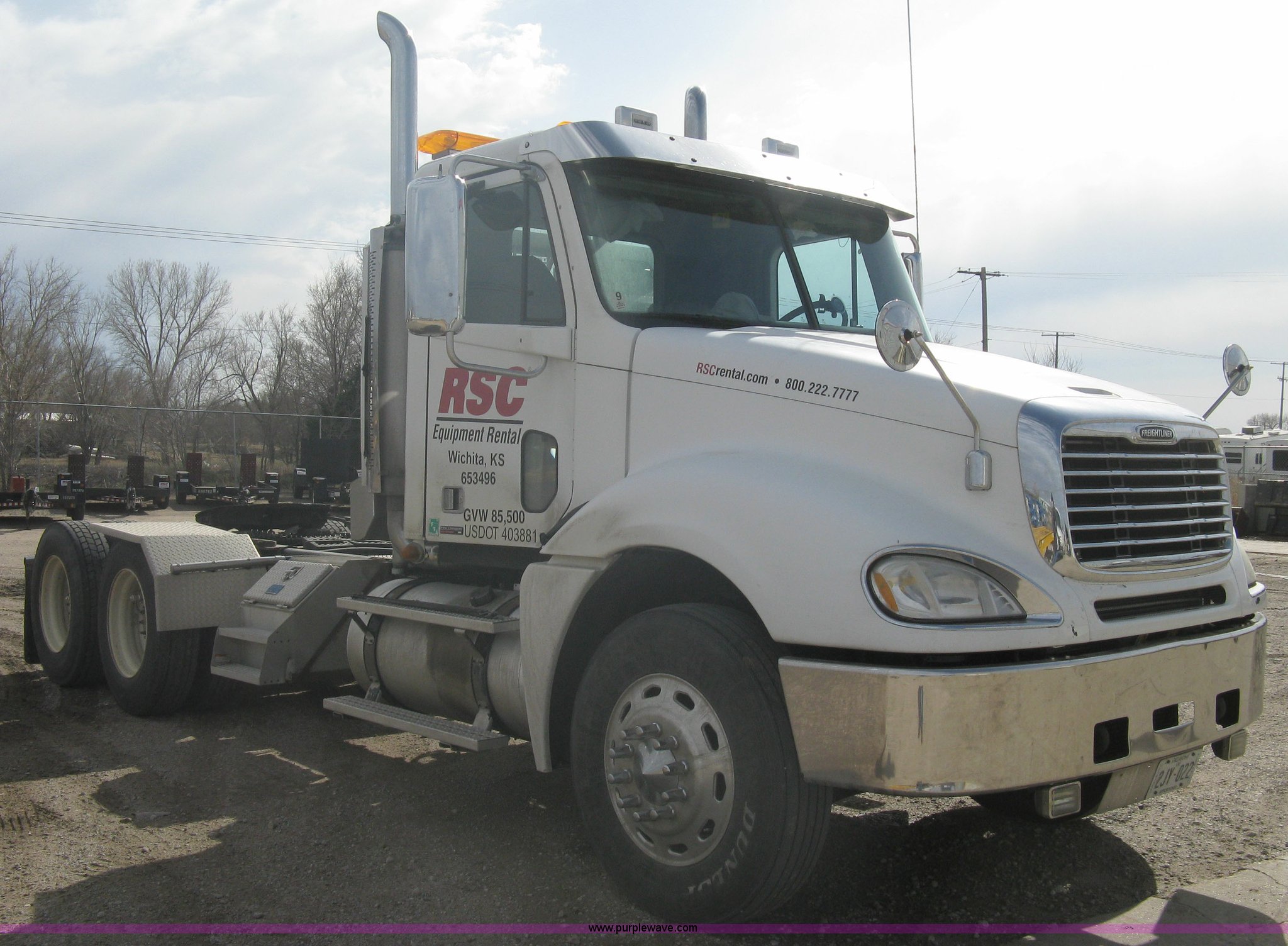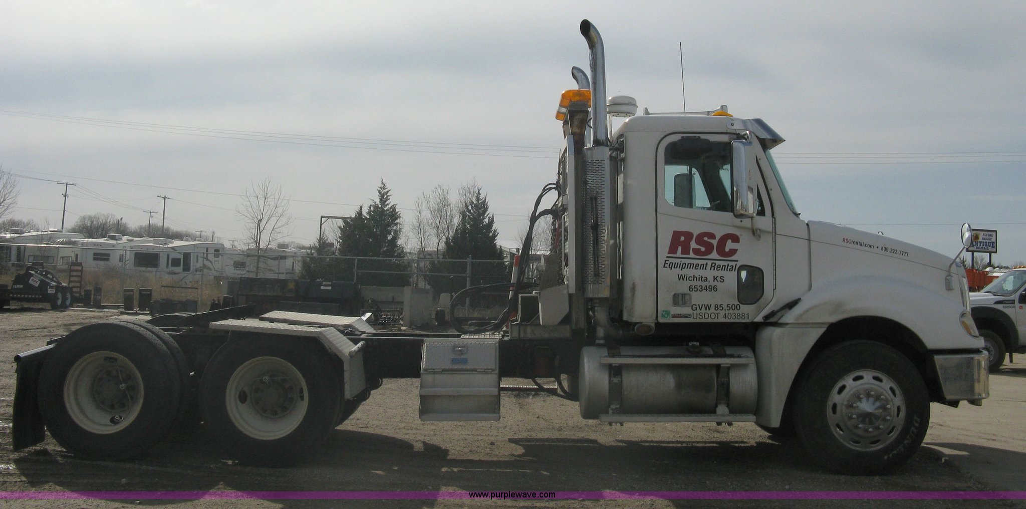Purple Wave is selling a used Truck Tractor in Kansas. This item is a 2007 Freightliner Columbia-TA semi truck with the following: 275,283 miles on odometer, Caterpillar C13 L6, 12.5L, (763 CID) diesel engine, Bad cam shaft, one cylinder down, Eaton Fuller 10 speed manual transmission, Twin screw, AC and heat, Cruise control, AM/FM/CD player, Passenger daylight door, Air ride cab, Power passenger window, Heated mirrors, Passenger seat, Exterior visor, Chrome bumper, Block heater, Dual 90 gallon fuel tanks, Dual exhaust stacks, Aluminum deck plate, Ledwell headache rack, Window, Storage, Chain hanger, Aluminum quarter fenders, Amber caution light, Sliding fifth wheel, Step-up tool box, PTO, Wet kit, Air suspension, Air brakes, Jake brake, Brake controller, Wheel nut covers, GVWR 53,220 lbs, FAWR 13,220 lbs, IAWR 20,000 lbs, RAWR 20,000 lbs, 11R24.5 tires, Chains, binders, and traffic cones not included, All personal property items in cab will be removed, EIN 653496