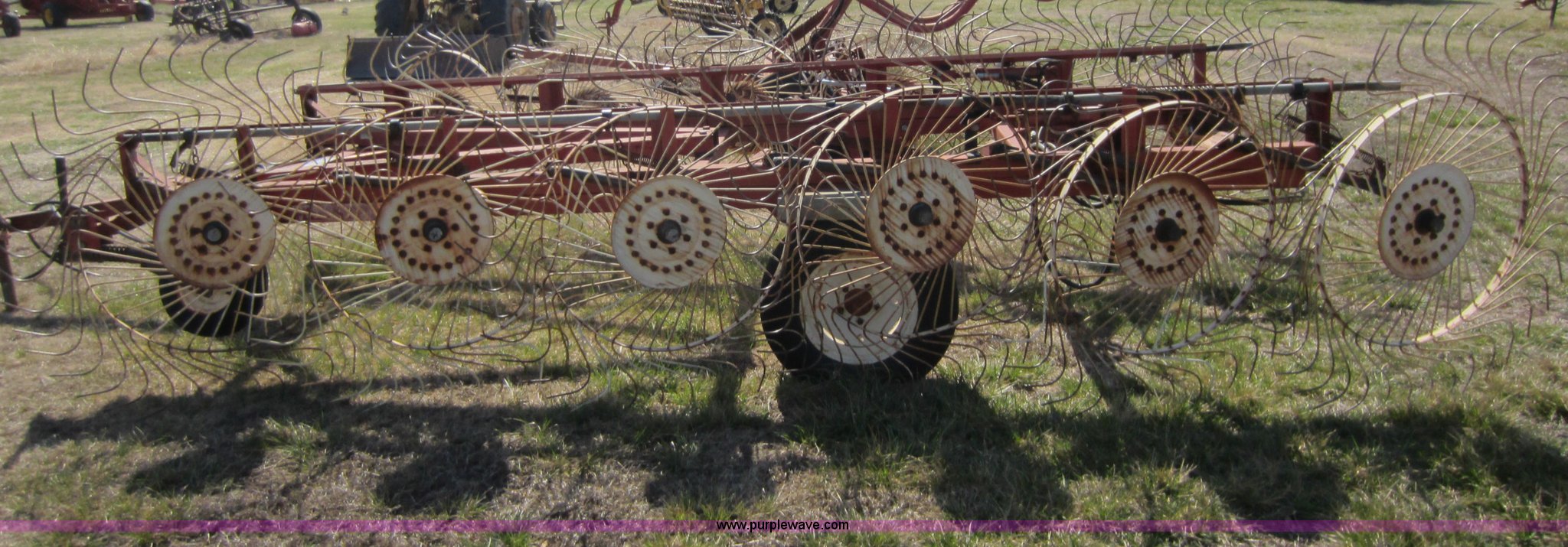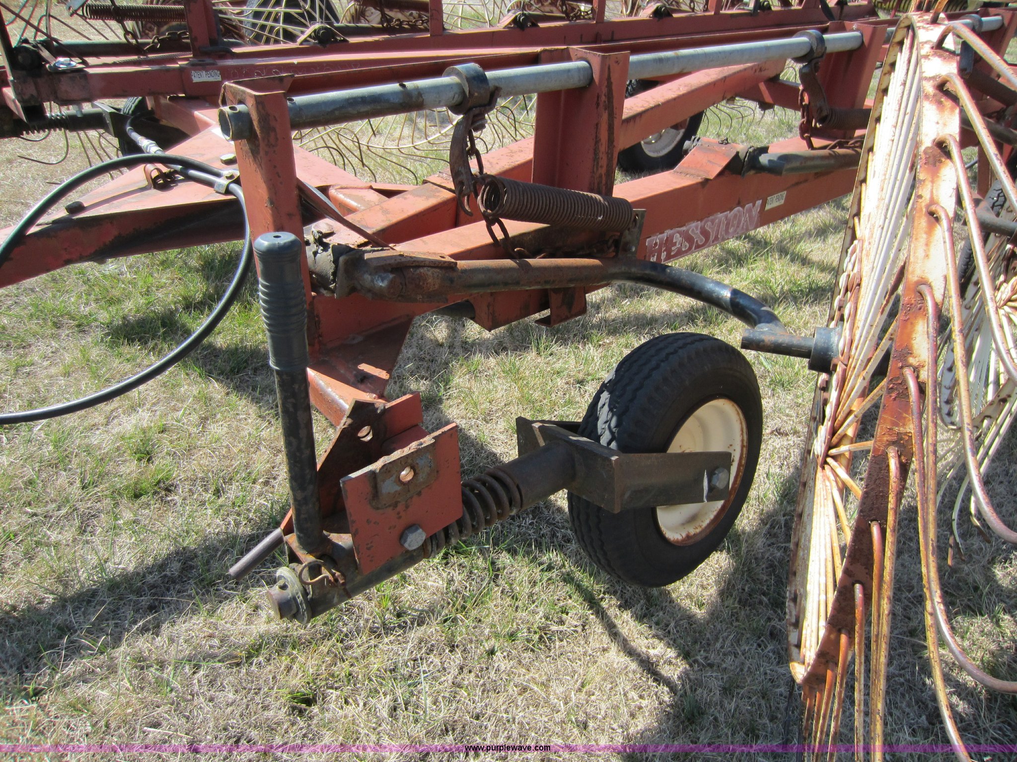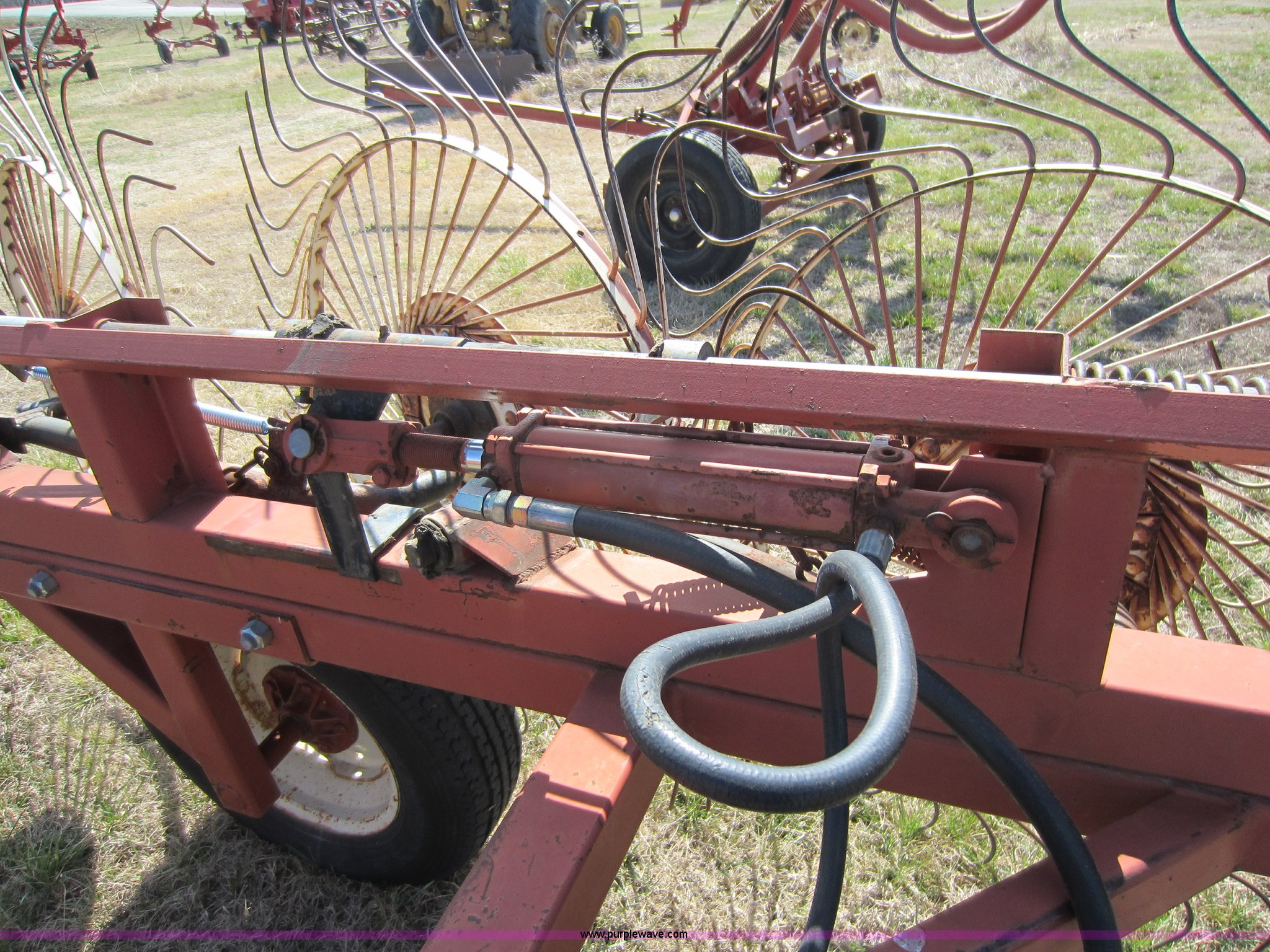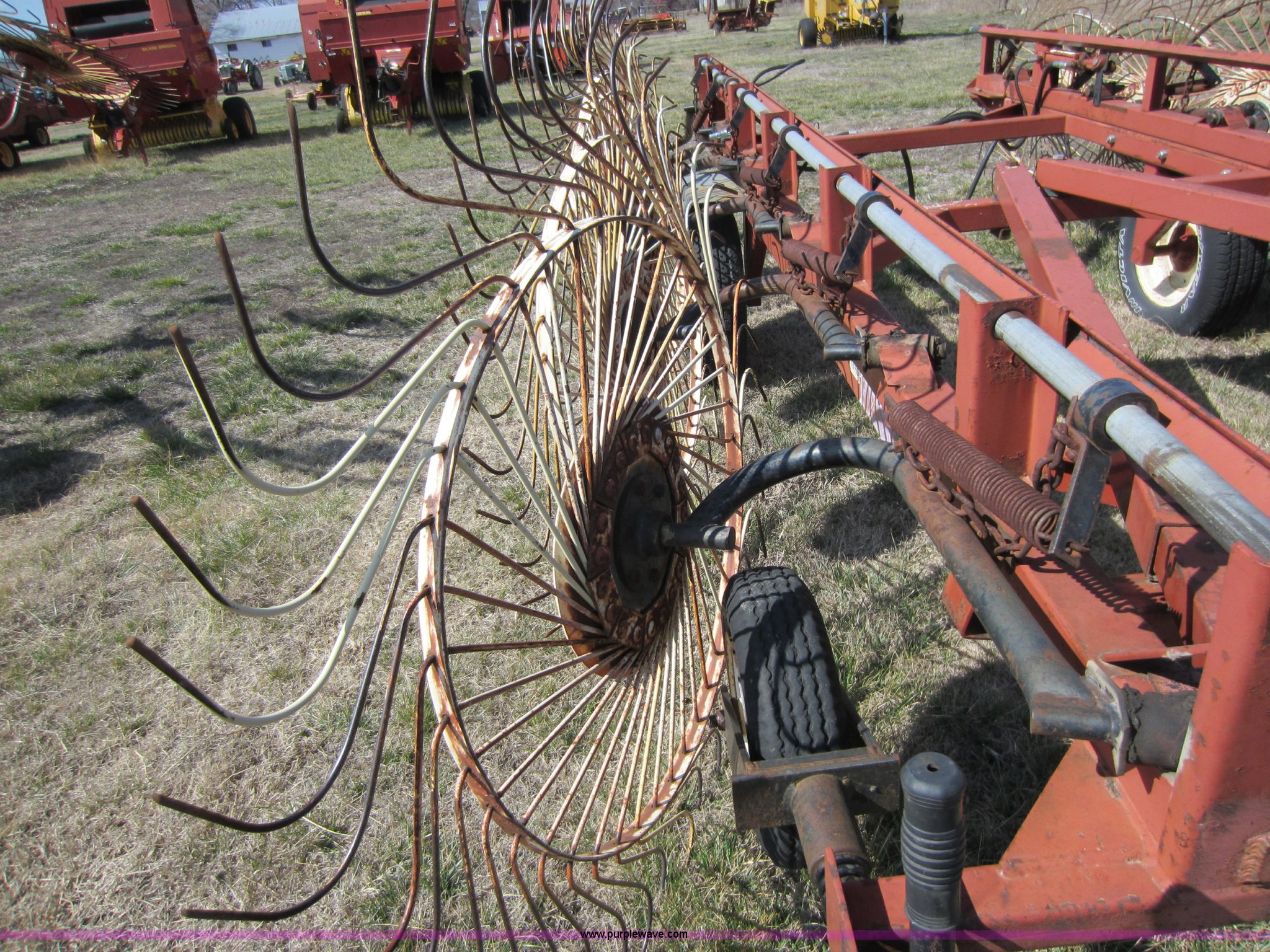 Purple Wave is selling a used Hay Rake in Oklahoma. This item is a Hesston 3980 12 wheel rake with the following: Hydraulic fold, 54" diameter wheels, Pin hitch, 205/75R15 tires, Serial 00557