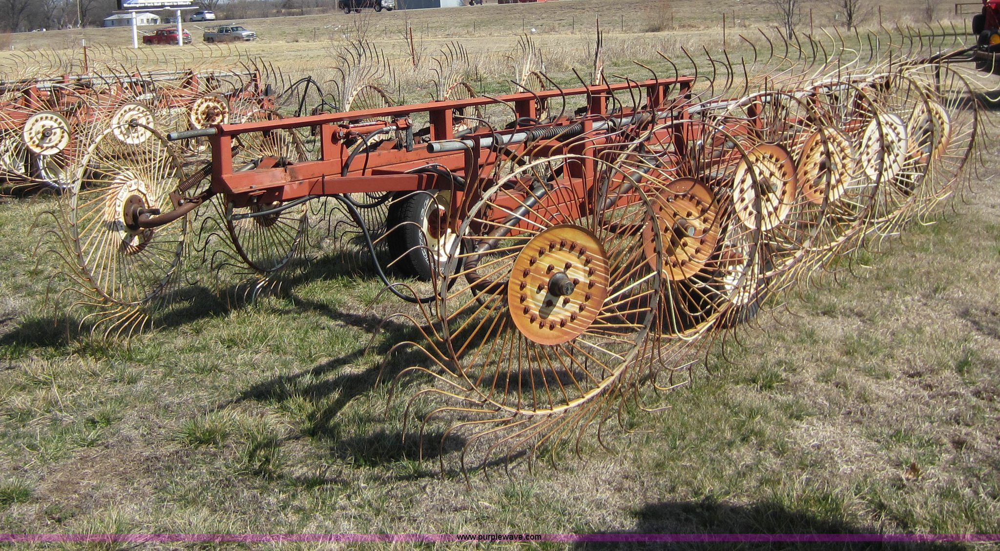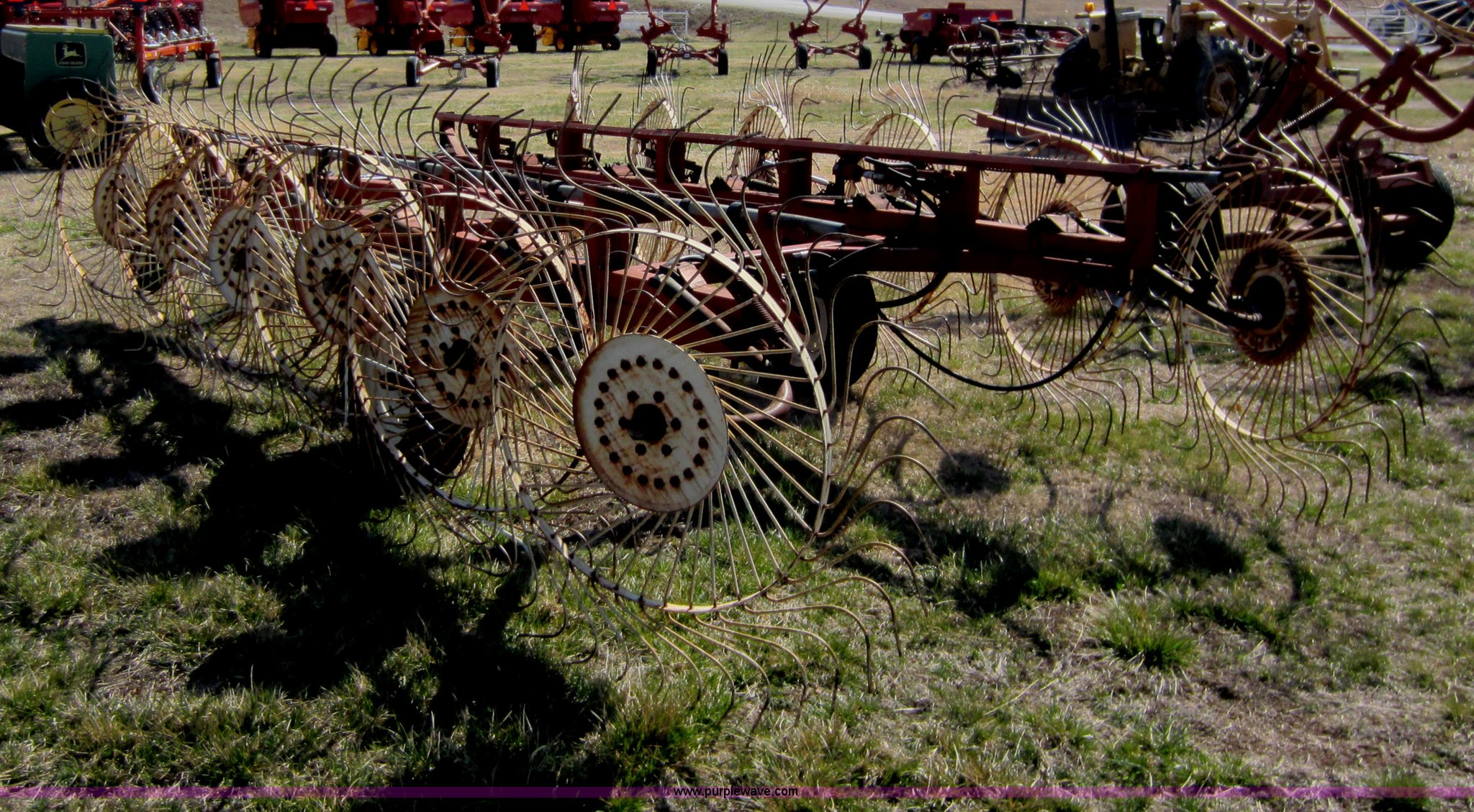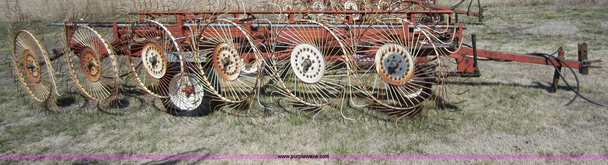 Purple Wave is selling a used Hay Rake in Oklahoma. This item is a Hesston 3980 12 wheel rake with the following: Hydraulic fold, 54" diameter wheels, Pin hitch, 205/75R15 tires, Serial 00557