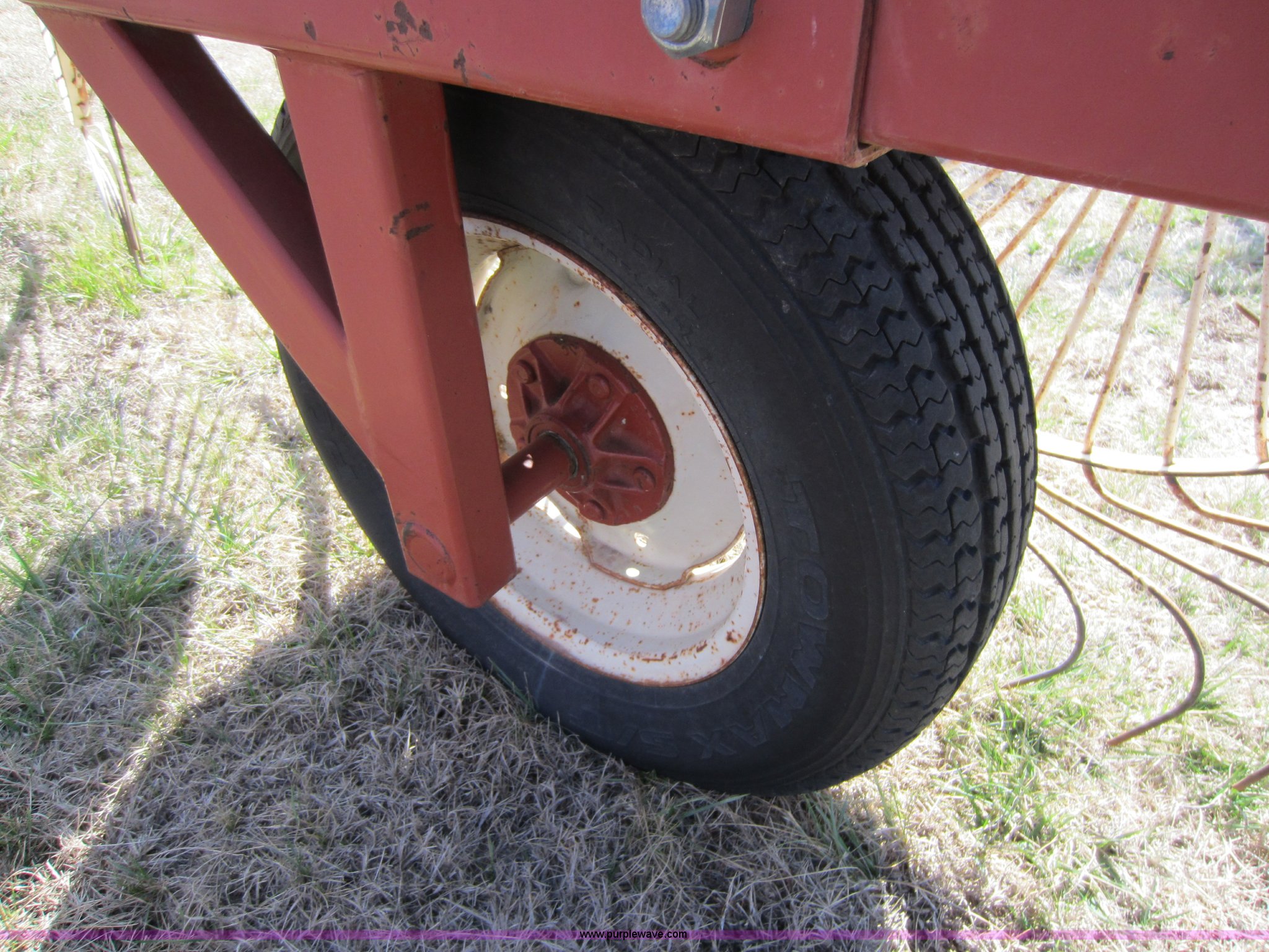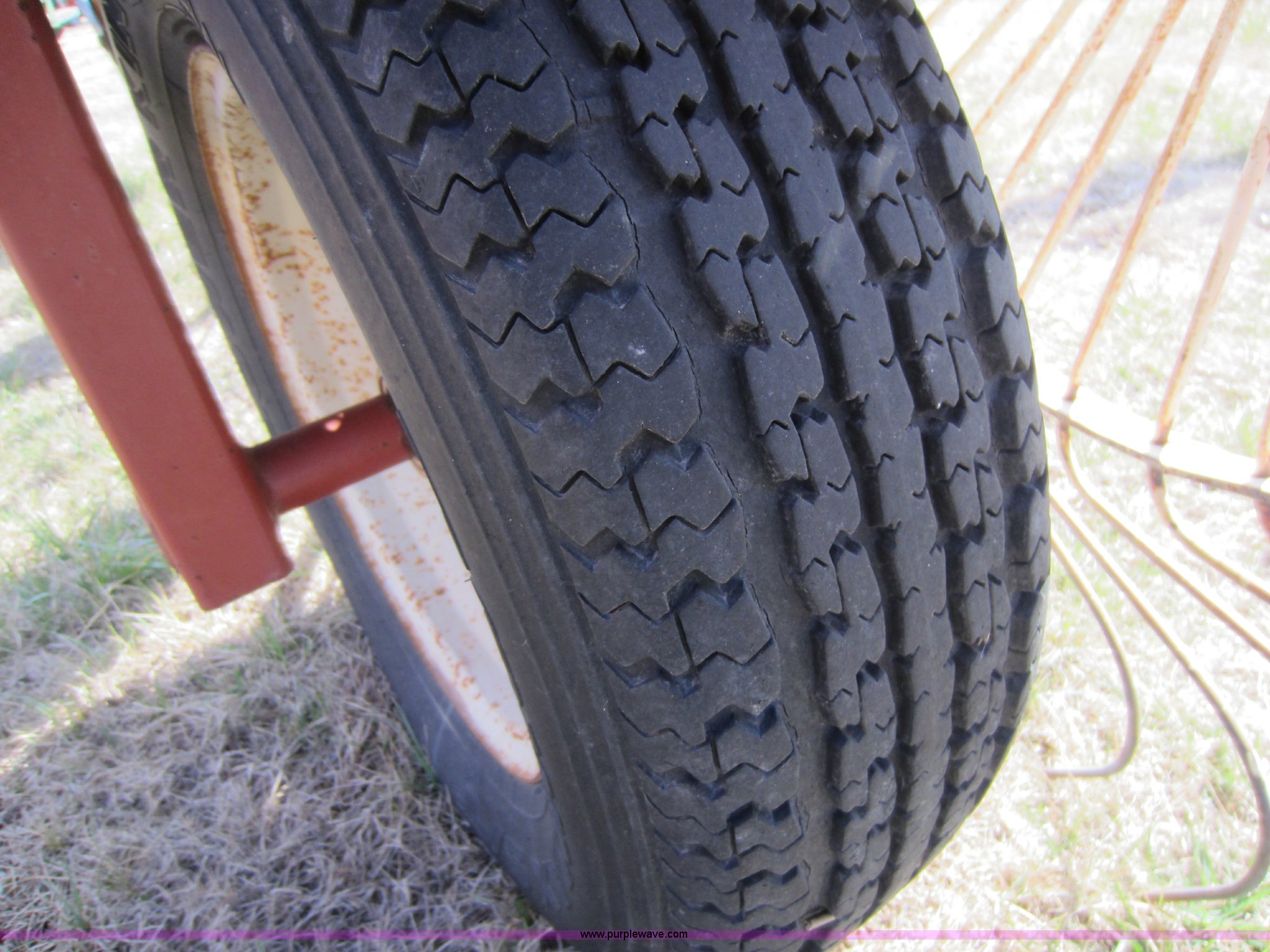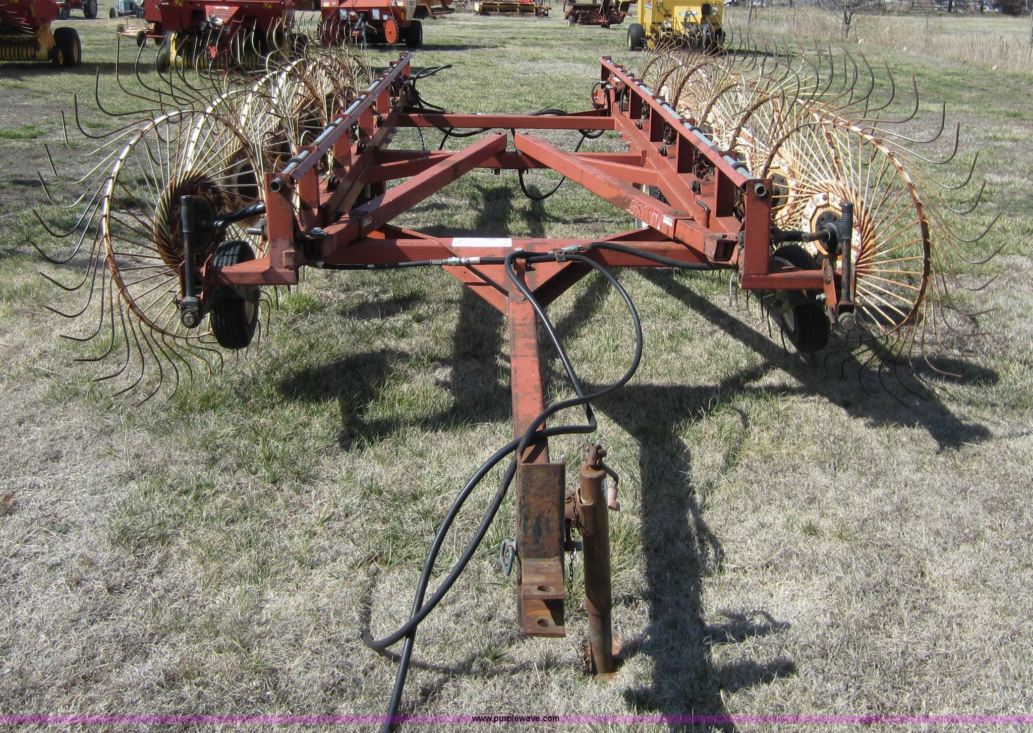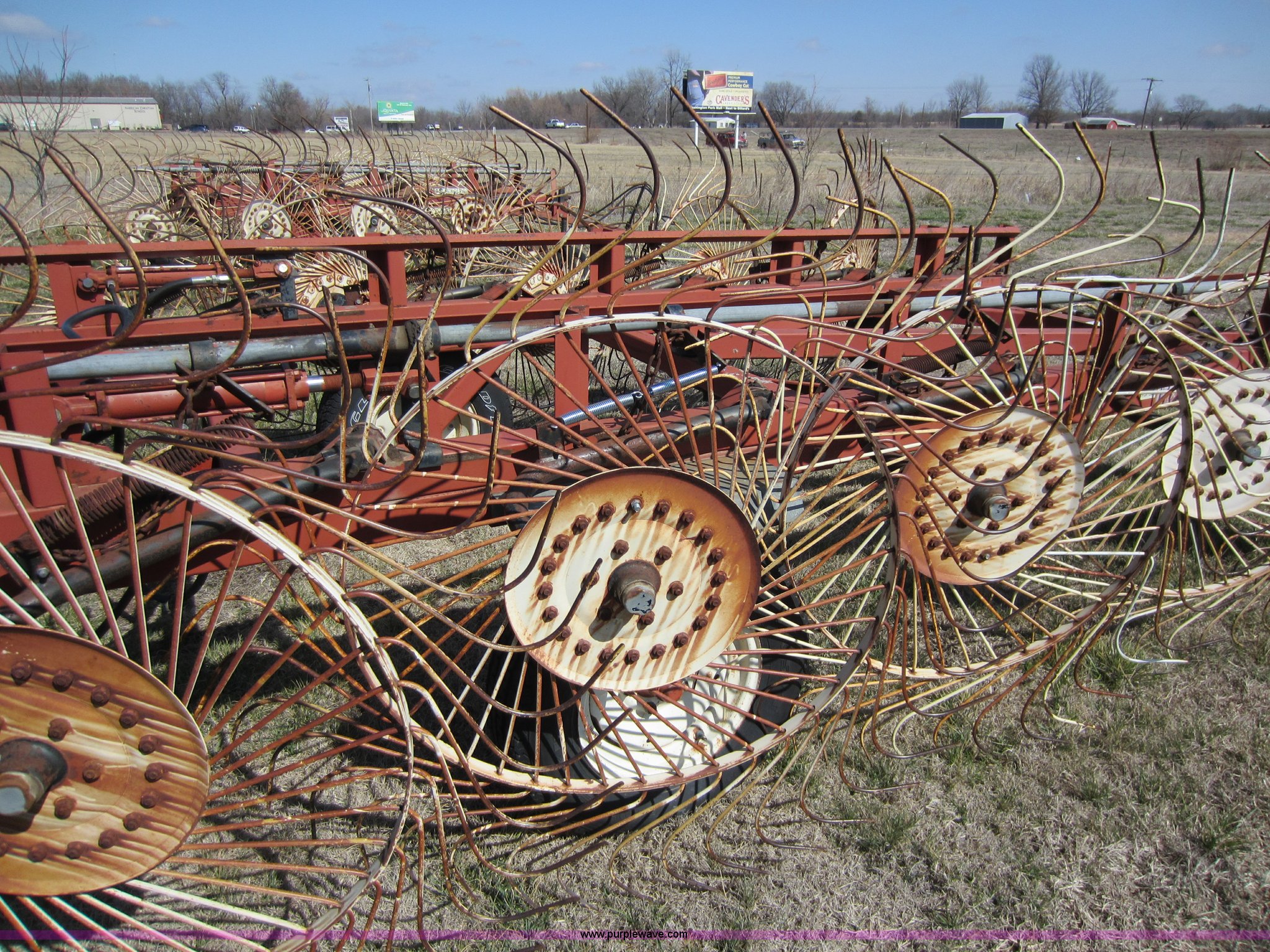 Purple Wave is selling a used Hay Rake in Oklahoma. This item is a Hesston 3980 12 wheel rake with the following: Hydraulic fold, 54" diameter wheels, Pin hitch, 205/75R15 tires, Serial 00557