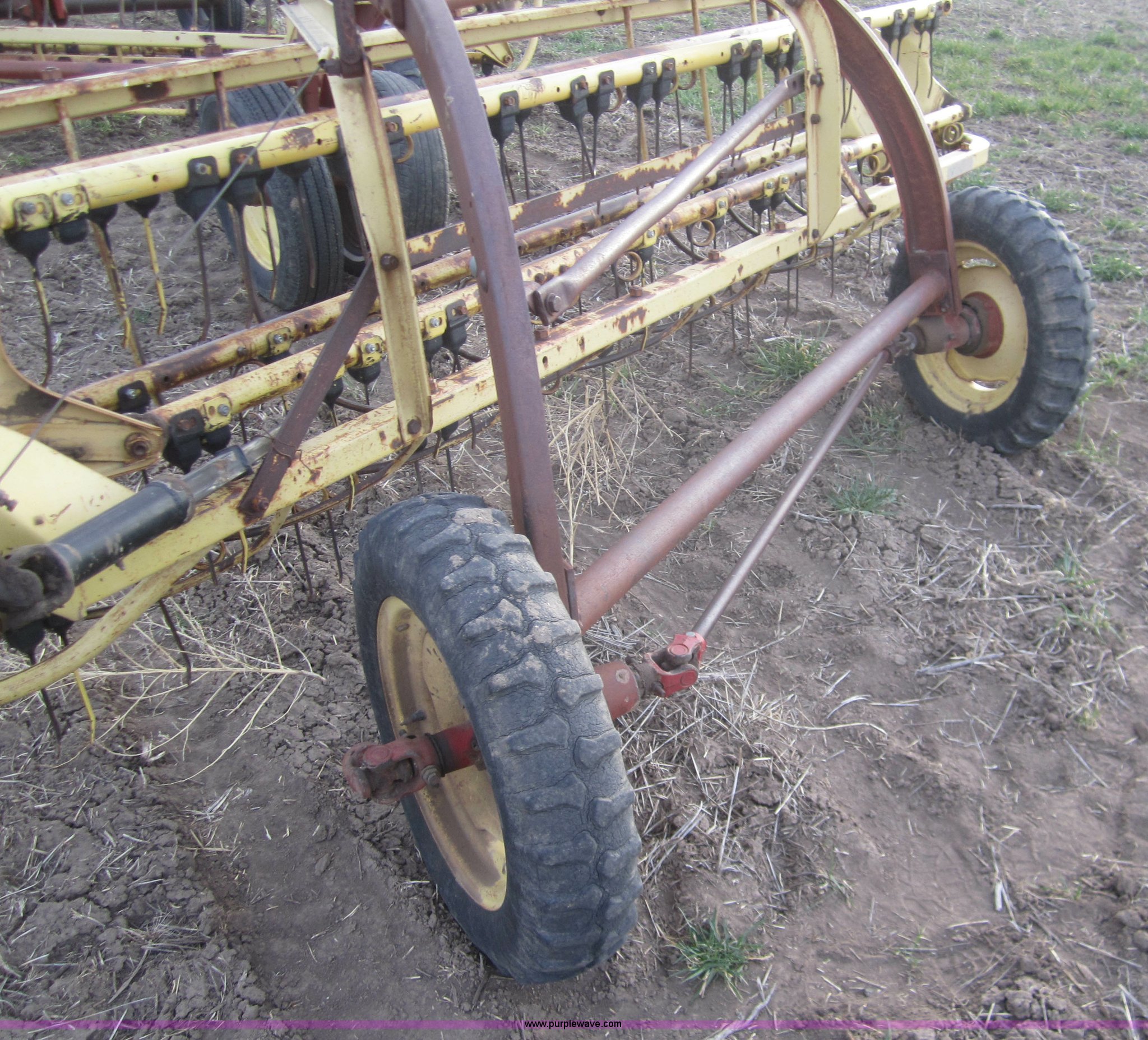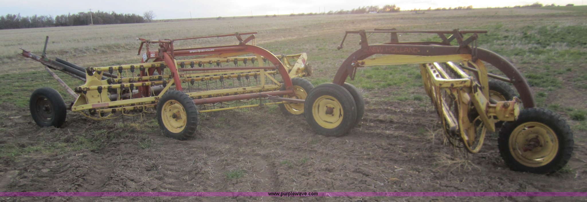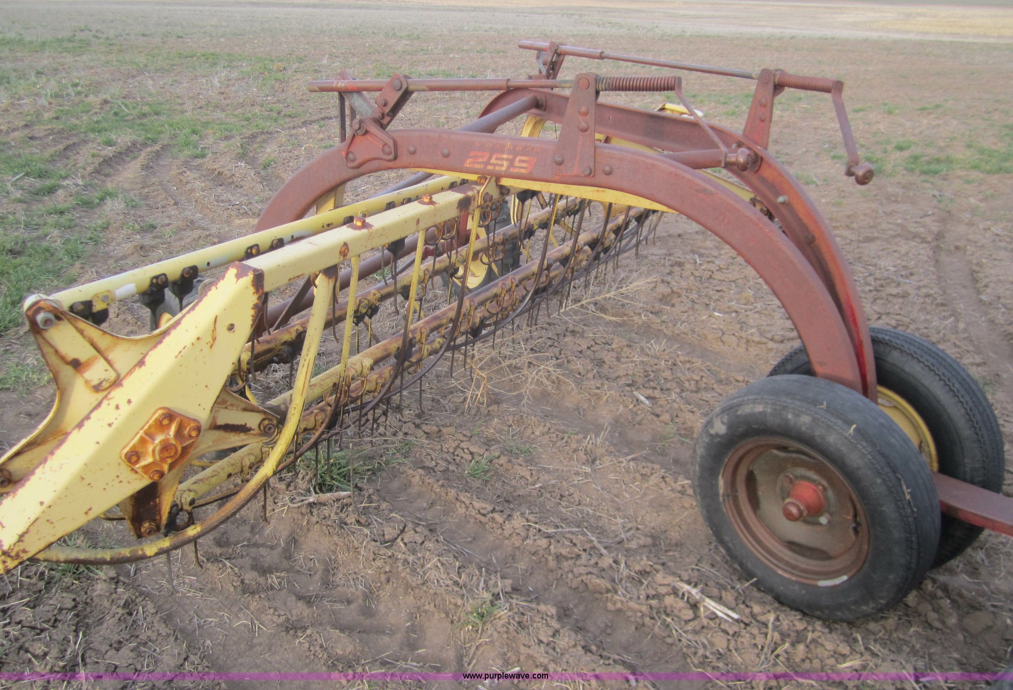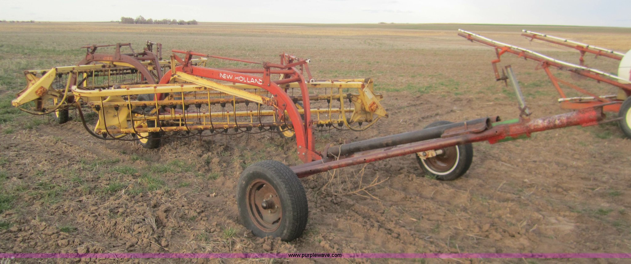 Purple Wave is selling a used Hay Rake in Kansas. This item is a Double hay rake with the following: New Holland 260 rake, Serial 471379, Five bar, New Holland 259 rake, Serial 189344, Five bar, 5.00-15 tires, Used on 16' rows