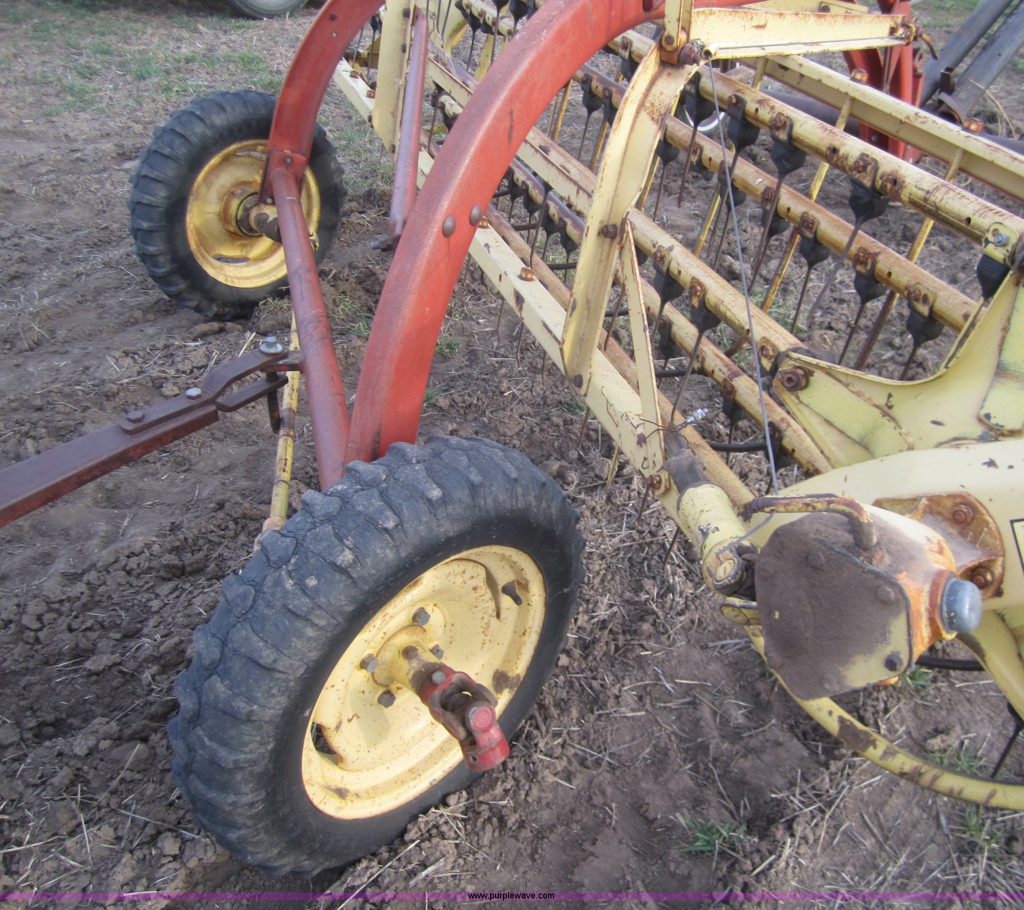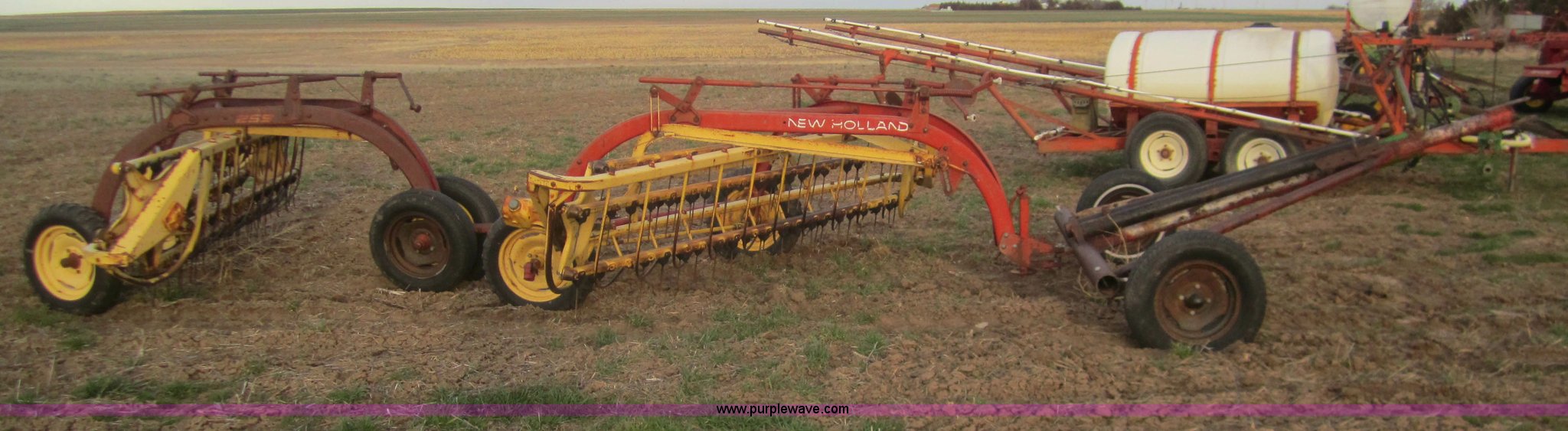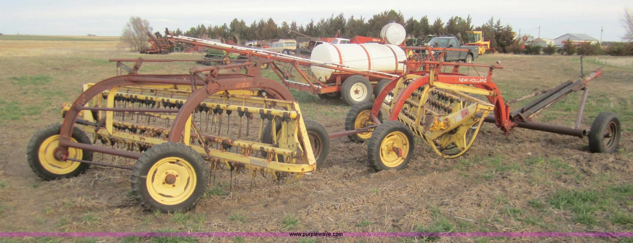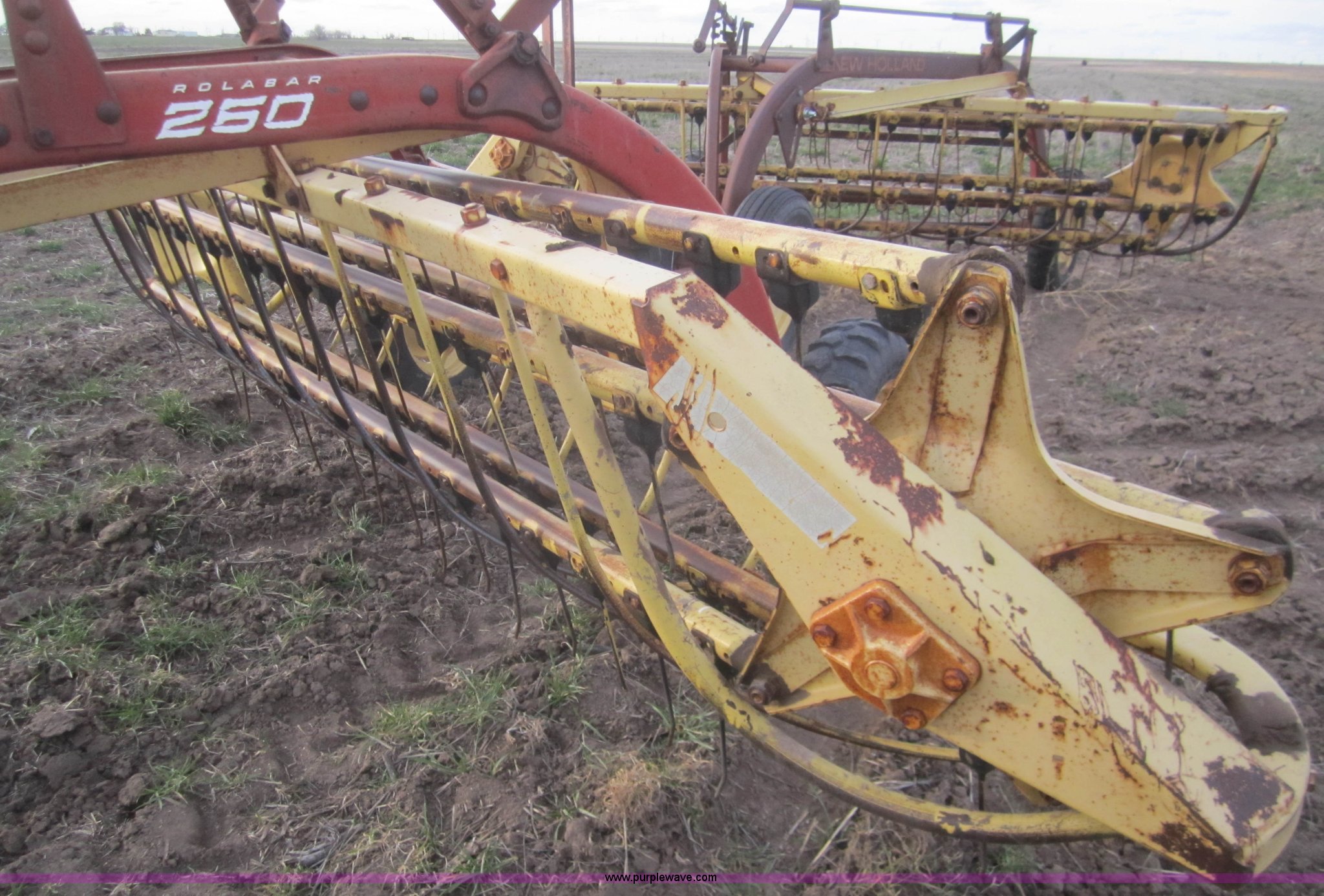 Purple Wave is selling a used Hay Rake in Kansas. This item is a Double hay rake with the following: New Holland 260 rake, Serial 471379, Five bar, New Holland 259 rake, Serial 189344, Five bar, 5.00-15 tires, Used on 16' rows
