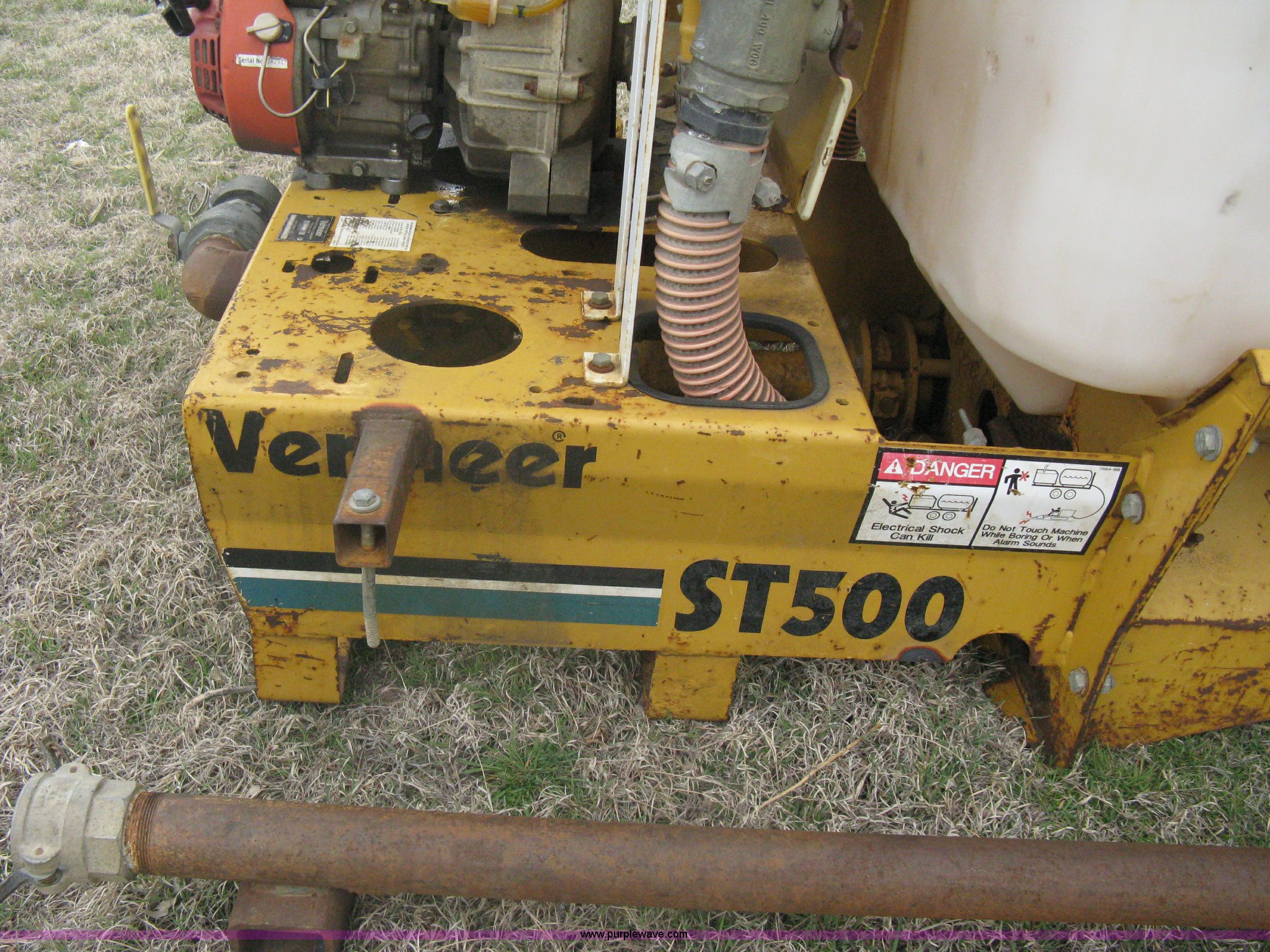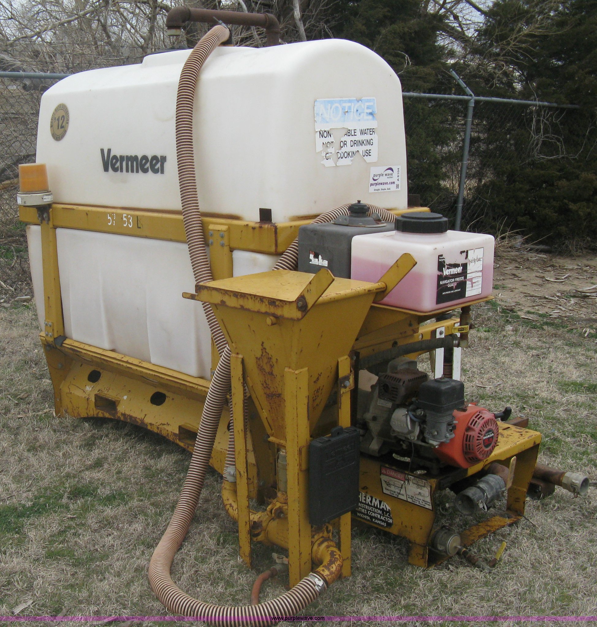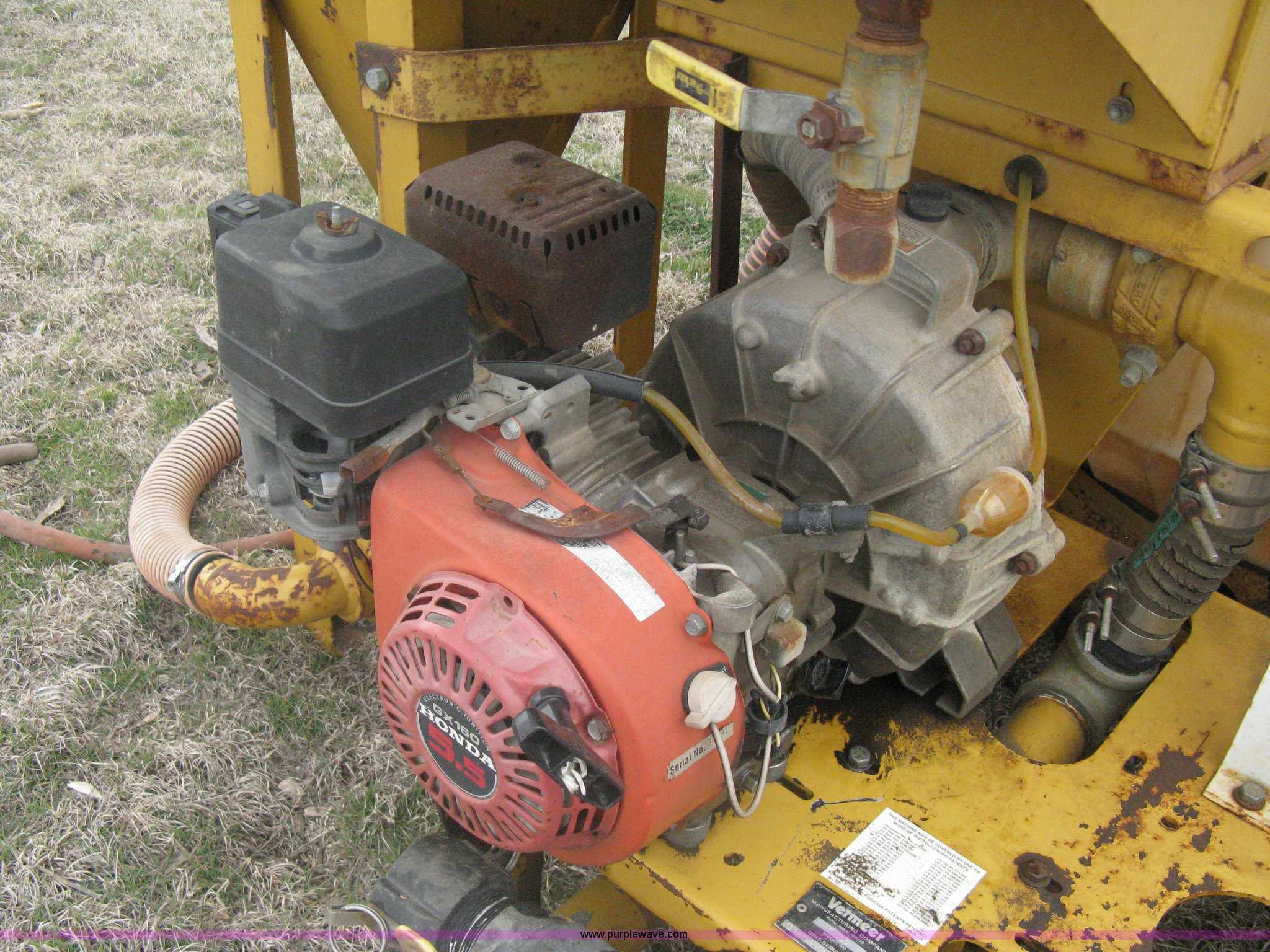 Purple Wave is selling a used Pump in Kansas. This item is a Vermeer ST500 mud pump with the following: 500 gallon poly tank, Honda GX160 5.5 HP engine, Side mount mixing hopper, Side mount fill pipe with camlock end, 5 gallon Navigator Freeze Guard tank, Approx. 5 gallon gas tank, Carriage assembly with forklift pockets, Operators manual included, Serial 1VRT090T2Y1000633