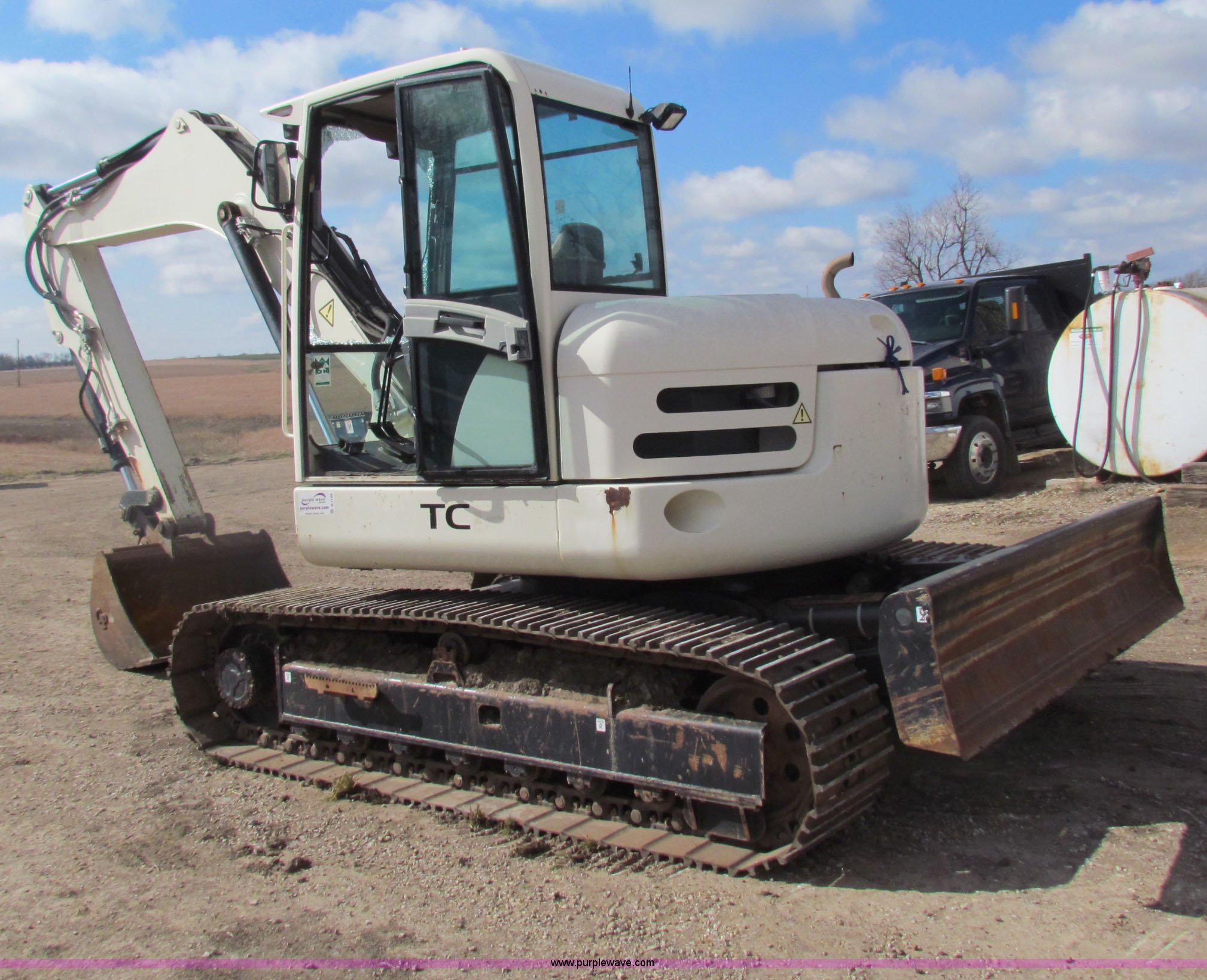 Purple Wave is selling a used Hydraulic Excavator in Kansas. This item is a 2006 Terex TC125 excavator with the following: 932 hours on meter, Deutz BF 4M 2012 diesel engine, 94 HP, 48" bucket, 20"W tracks, Approx 30,000 lbs. base operating weight, Broken windshield will be replaced by sale date, Bucket pins are loose, Rear hood latch broken, Serial 000324
