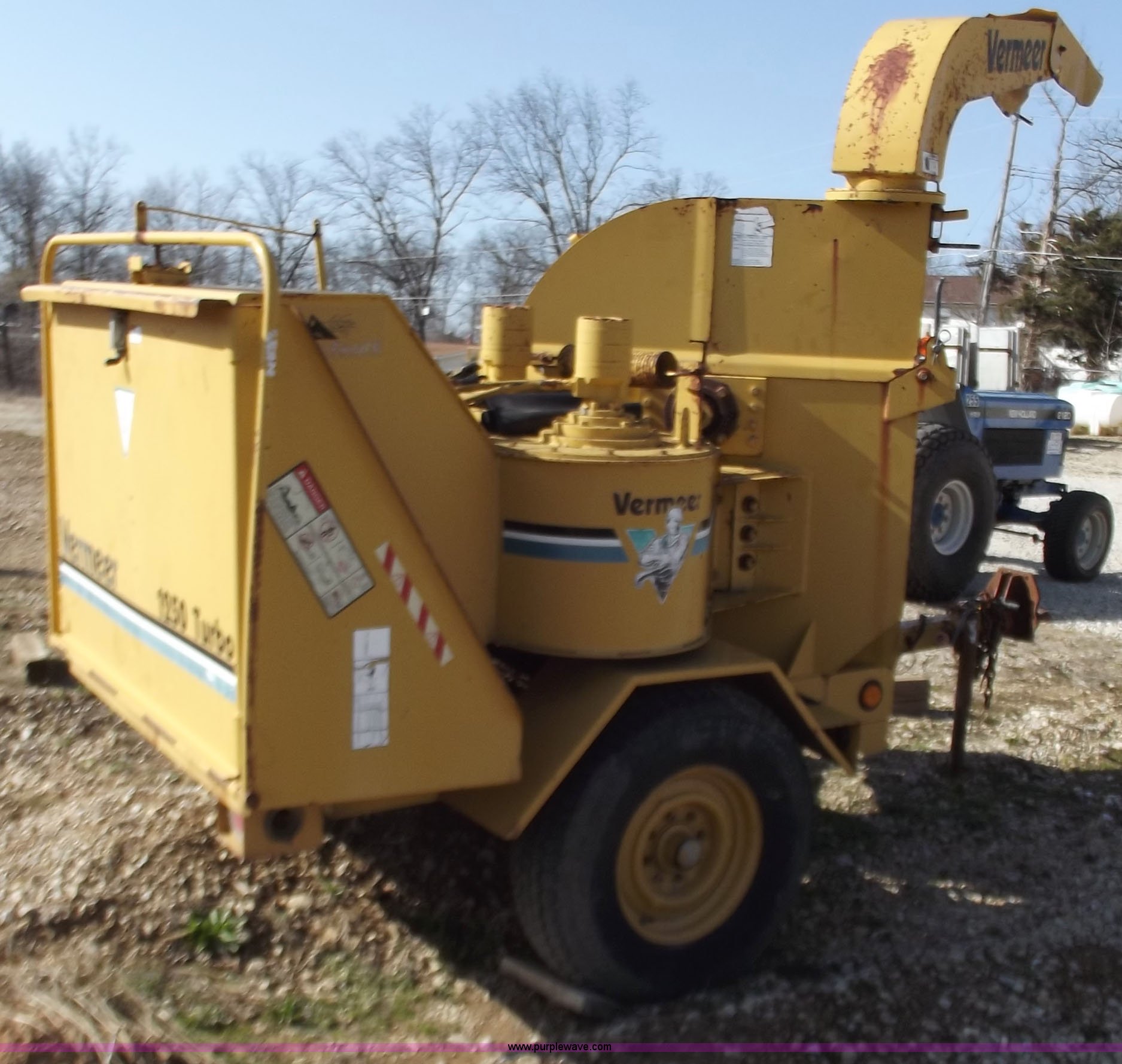 Purple Wave is selling a used Wood Chipper or Stump Grinder in Missouri. This item is a Vermeer 1250 Turbo wood chipper with the following: 631 hours on meter, Auto Feed II system, 12" log capacity, Perkins four cylinder diesel engine, Adjustable height pintle hitch, Tongue jack, 235/85/16 tires, Serial 1VRC14130T1005403
