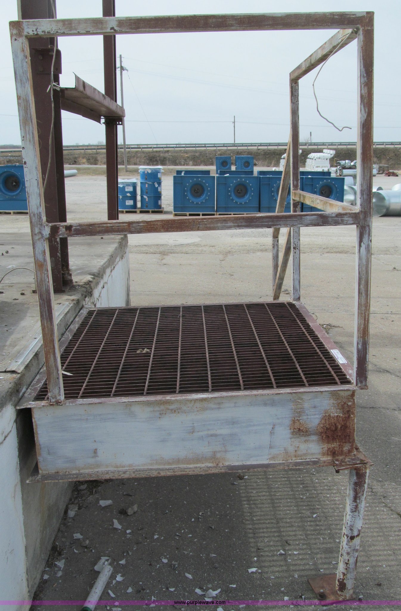 Iron four-step stair entry. Hand rail, Screen flooring, Two rail safety fence, Approx. 78"L x 42"W, 30"H deck. Shipping quotes available. Fisher Concrete. 1211 E 14th St. Falls City, NE 68355