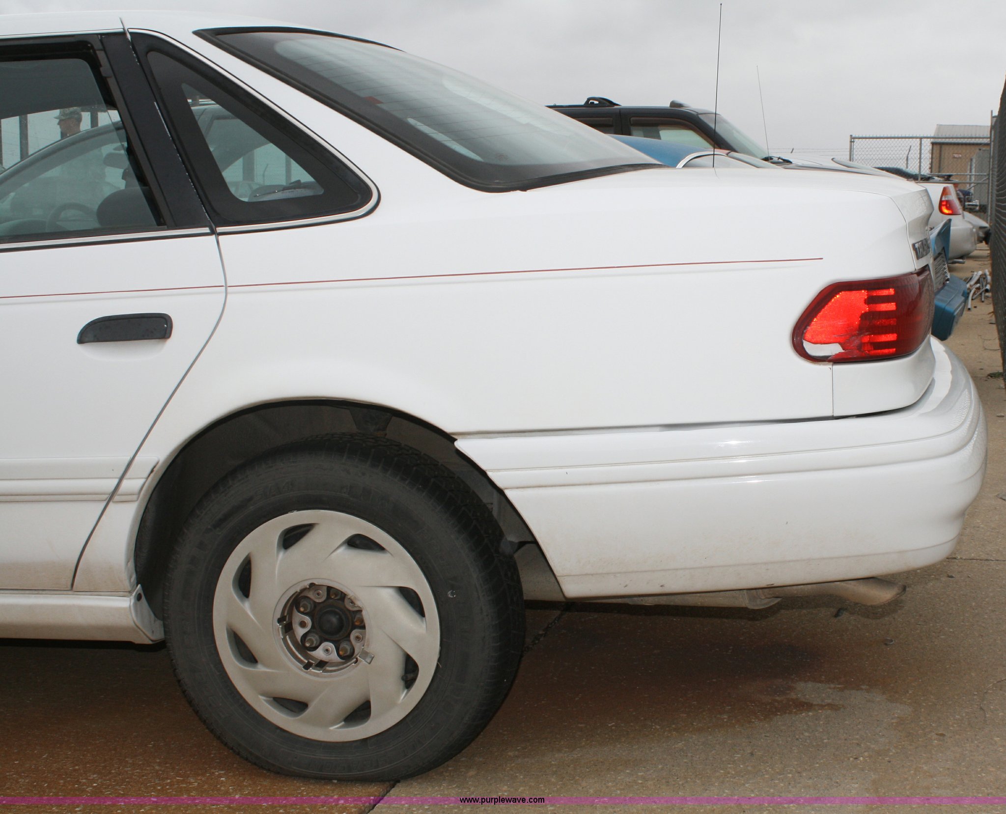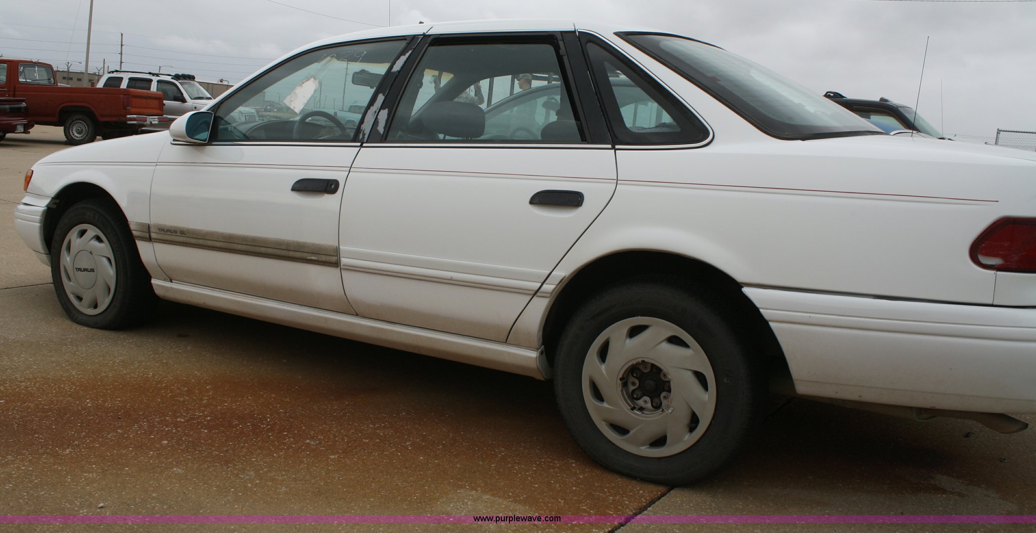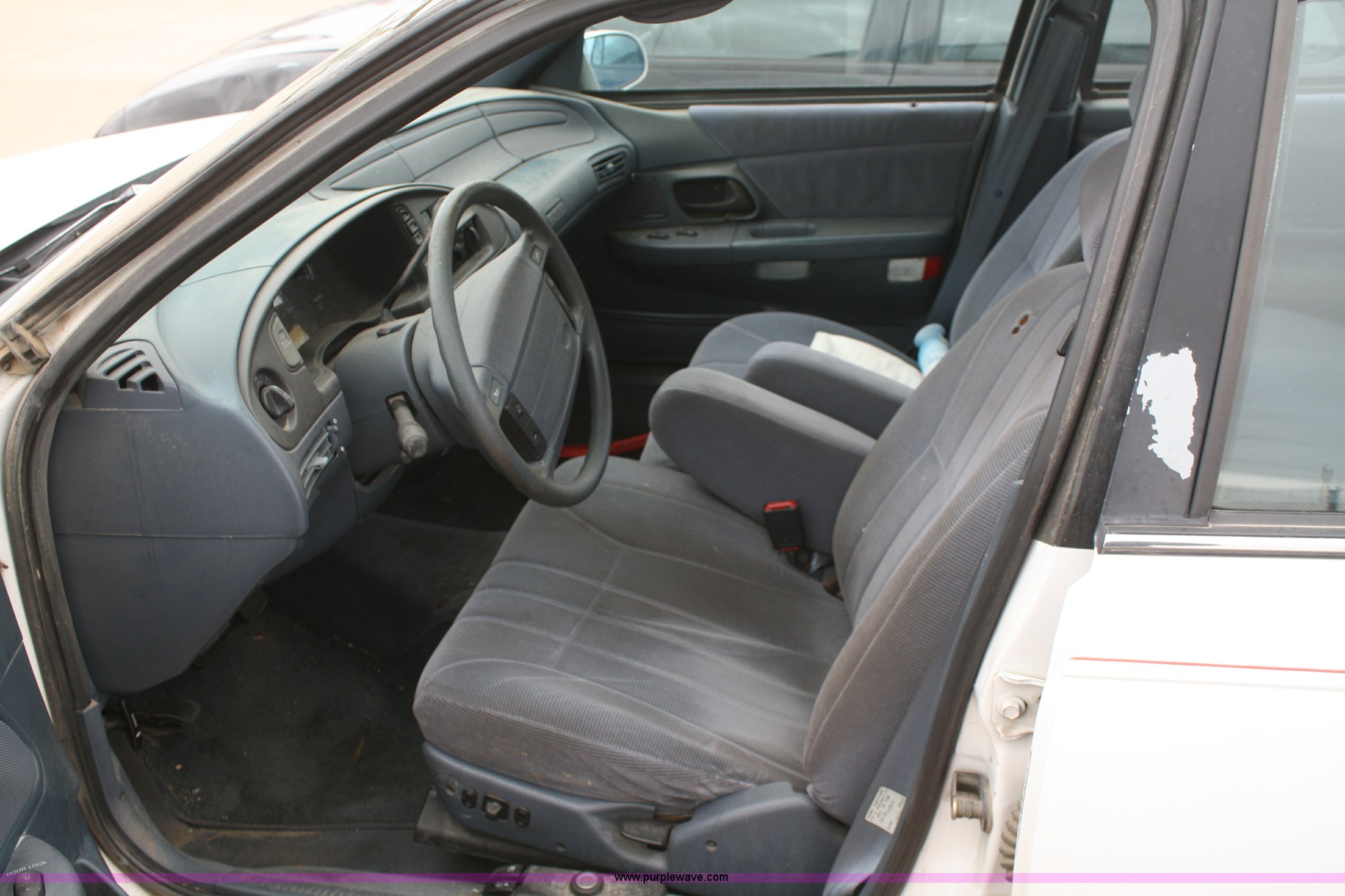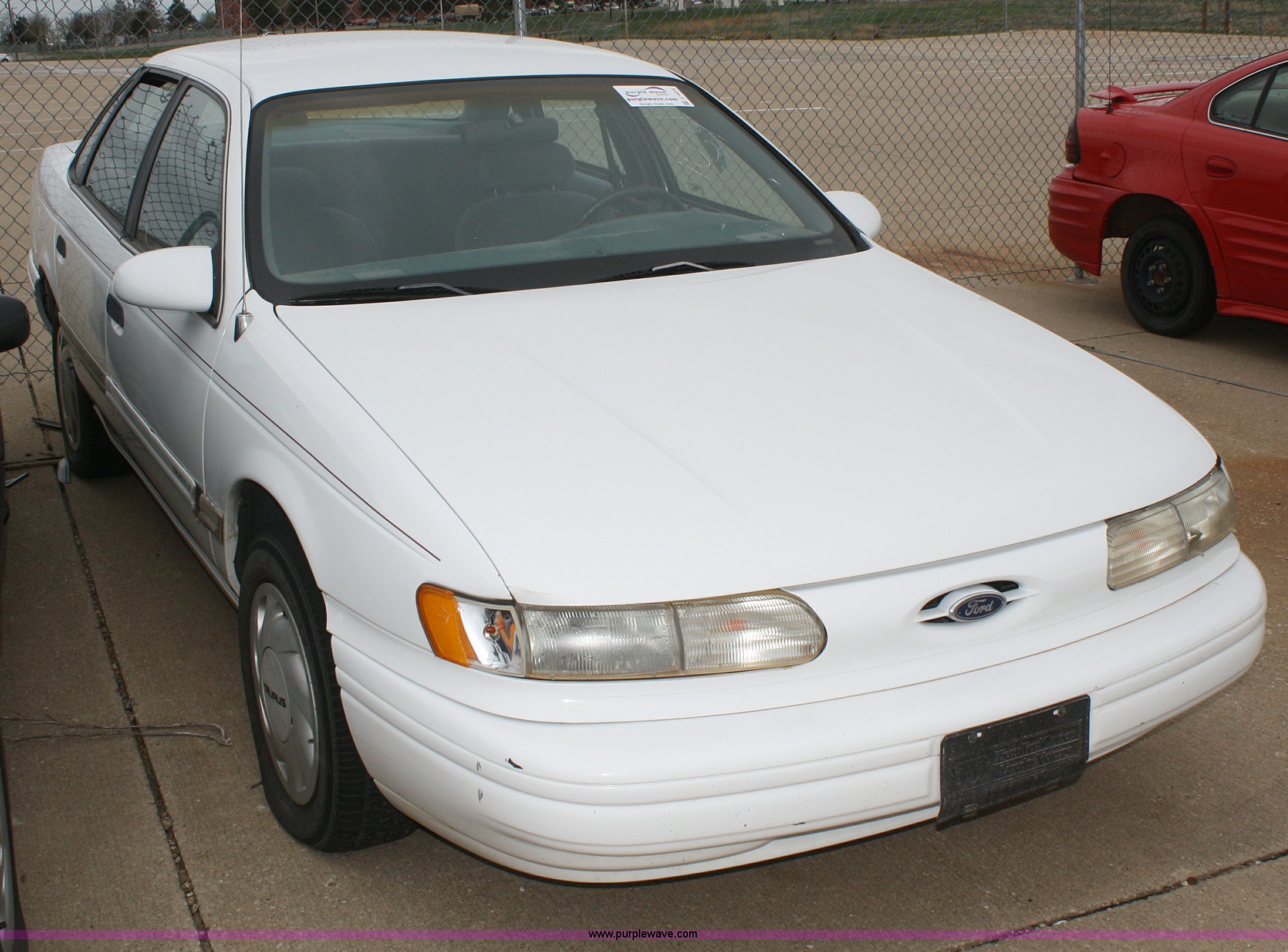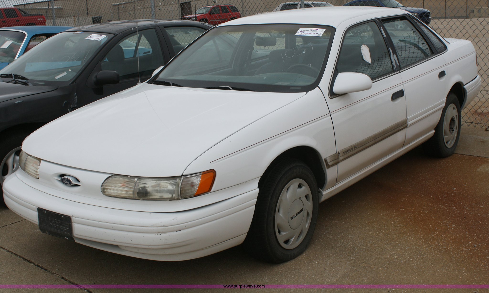 Purple Wave is selling a used Passenger Vehicle in Kansas. This item is a 1993 Ford Taurus GL with the following: 98,704 miles on odometer, 3.8L V6 EFI engine, Automatic transmission, AC and heat, Tilt, Cruise, AM/FM, Power windows, locks, mirrors, and seats, Cloth interior, 205/65R15 tires, Interior/exterior cosmetic damage, No keys, Dead battery, AV# 1039