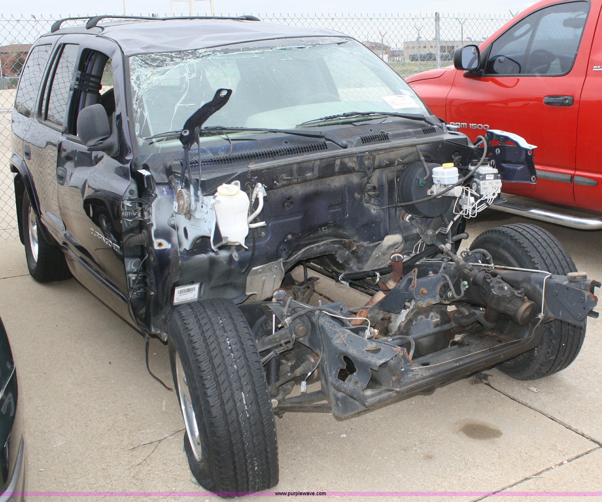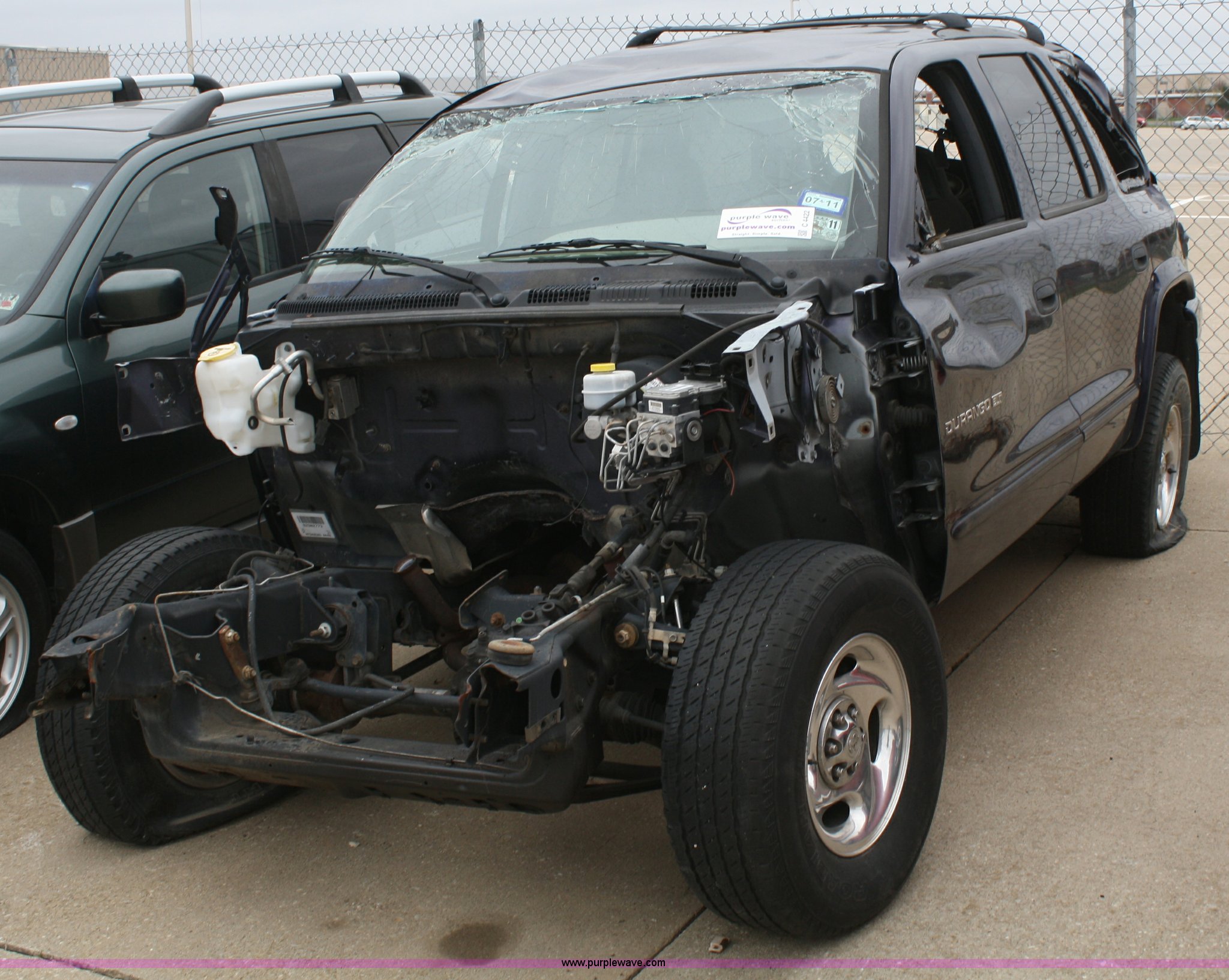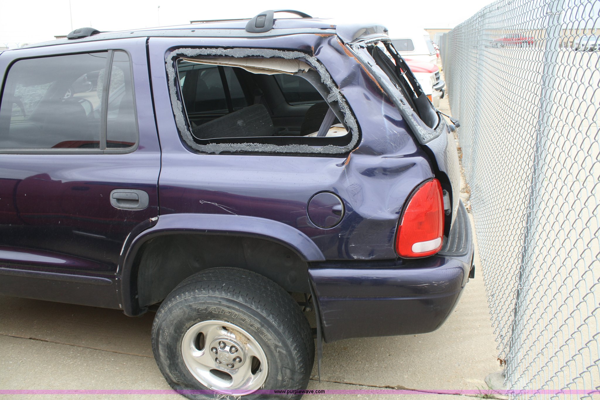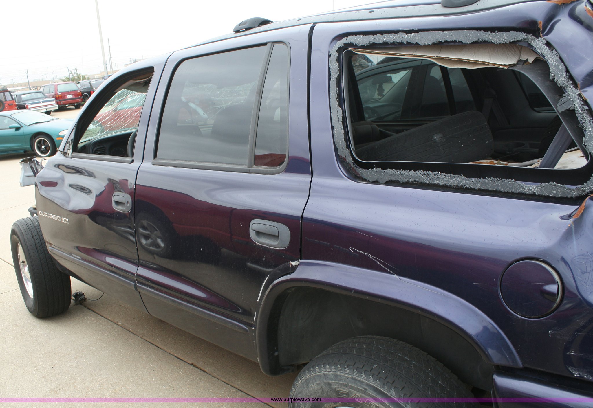 Purple Wave is selling a used Passenger Vehicle in Kansas. This item is a 1999 Dodge Durango SLT SUV with the following: Unknown mileage, No engine, Automatic transmission, AC and heat, Tilt, Cruise, Vinyl interior, 265/70R15 tires, Interior/exterior cosmetic damage, No keys, Dead battery, Driver window missing, Rear driver window broken out, Stereo missing, Side door panels missing, Cracked windshield, Rear window missing, AV# 0138