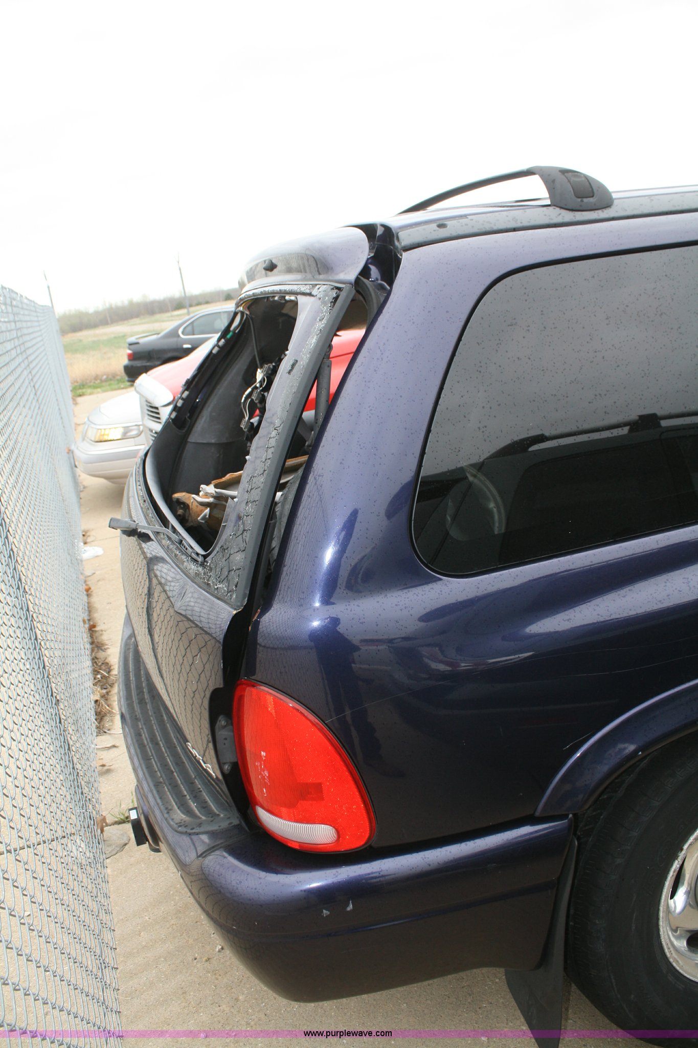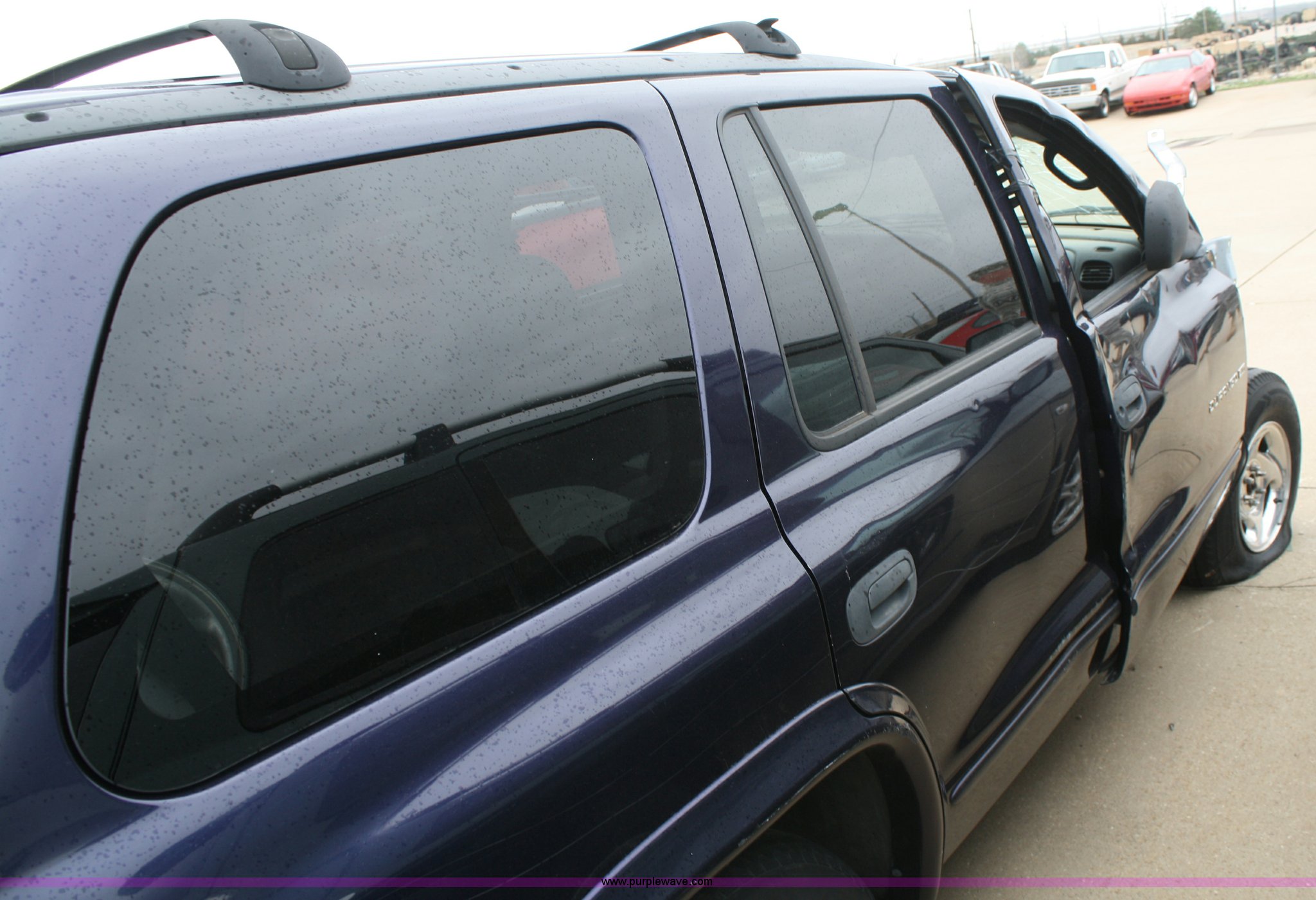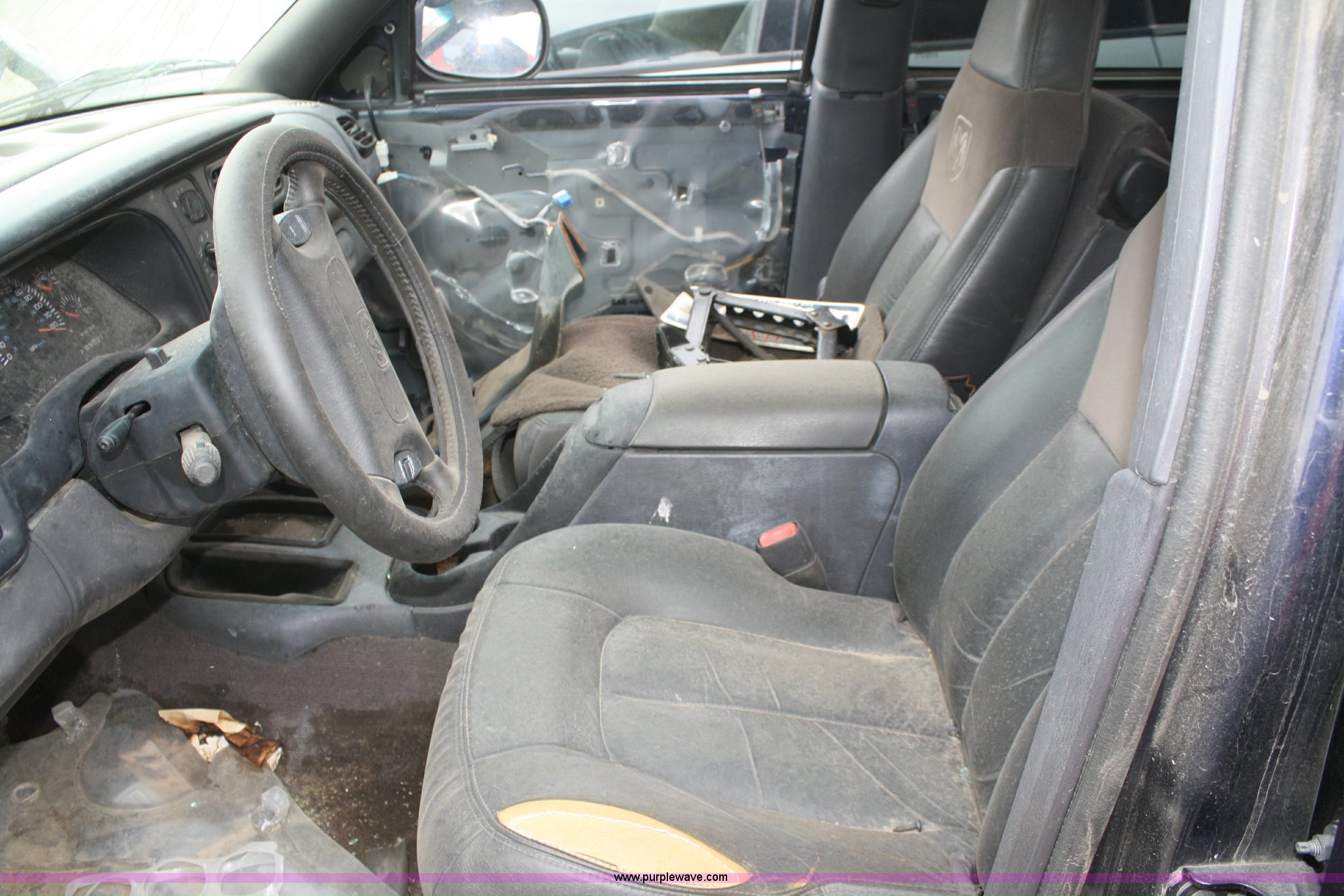 Purple Wave is selling a used Passenger Vehicle in Kansas. This item is a 1999 Dodge Durango SLT SUV with the following: Unknown mileage, No engine, Automatic transmission, AC and heat, Tilt, Cruise, Vinyl interior, 265/70R15 tires, Interior/exterior cosmetic damage, No keys, Dead battery, Driver window missing, Rear driver window broken out, Stereo missing, Side door panels missing, Cracked windshield, Rear window missing, AV# 0138