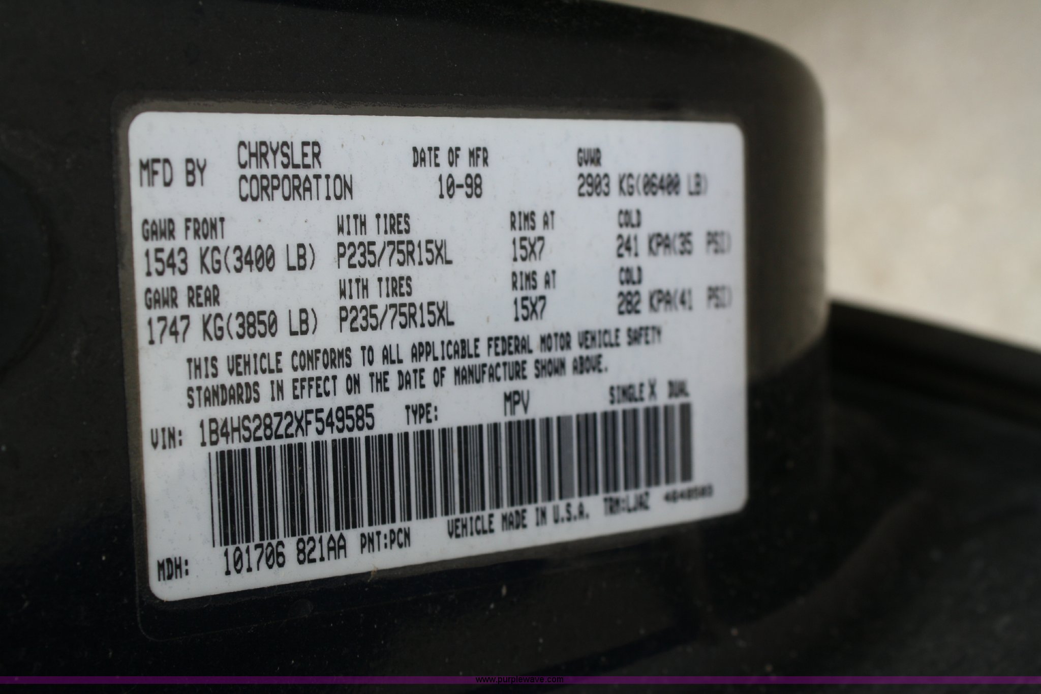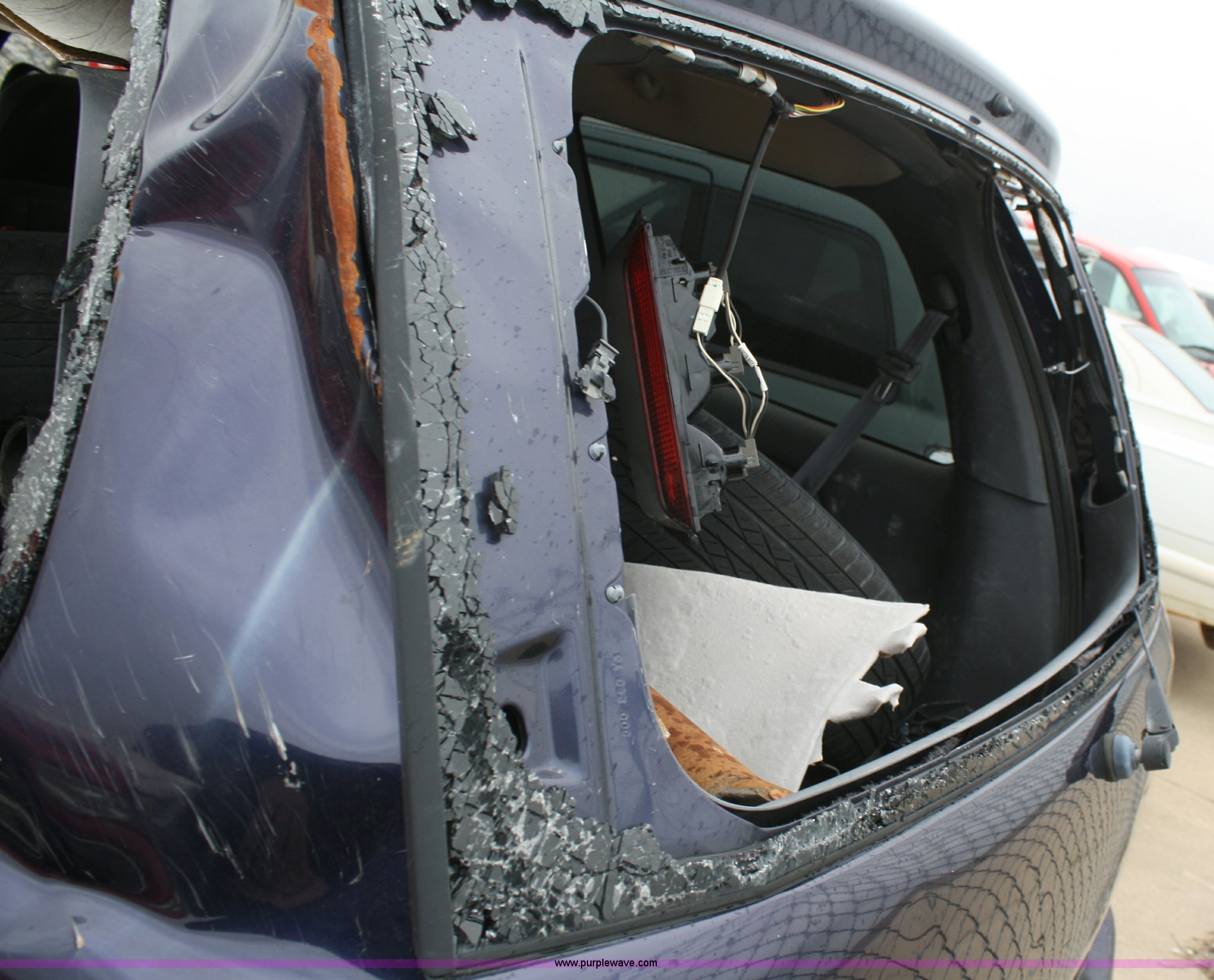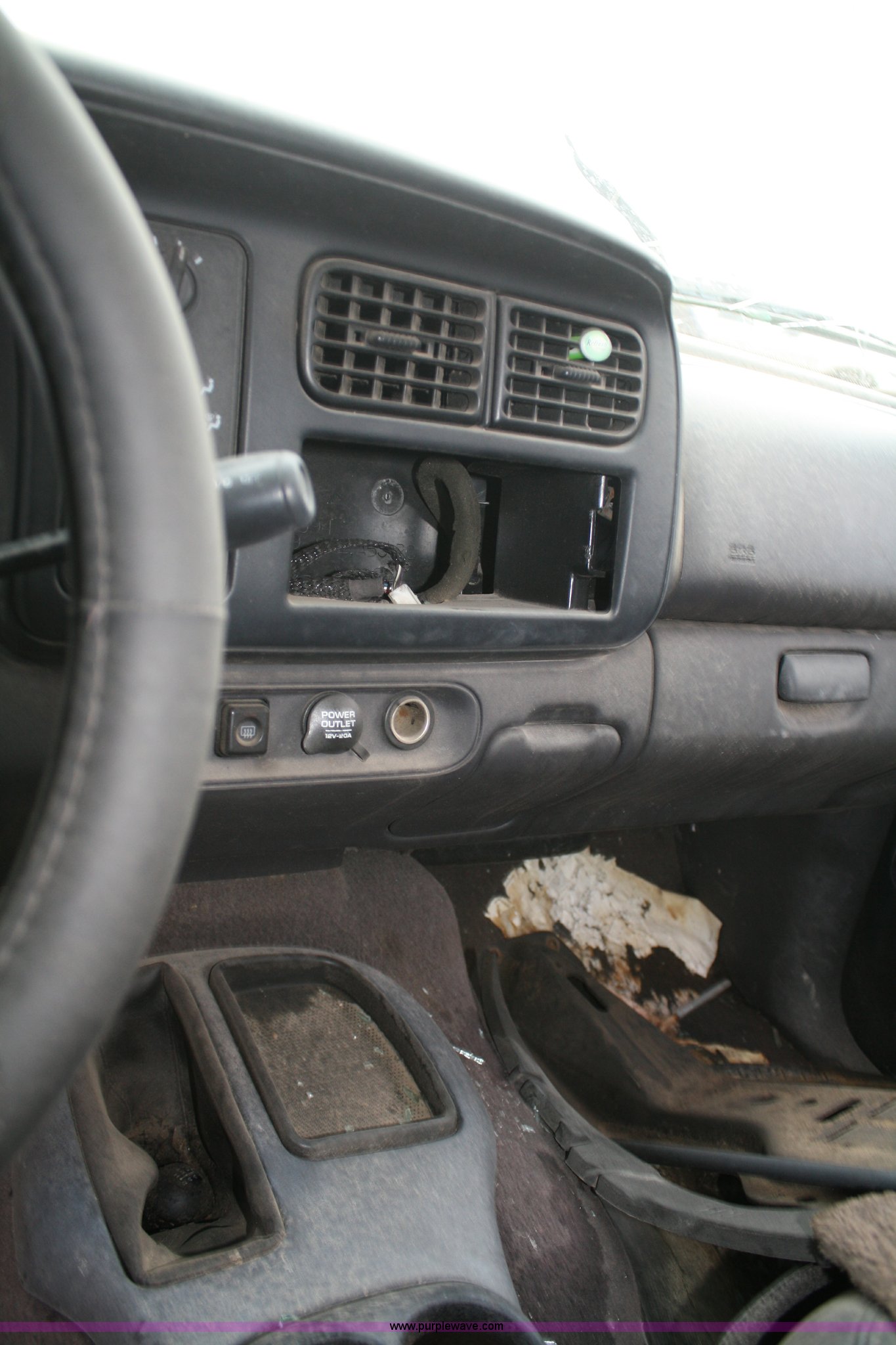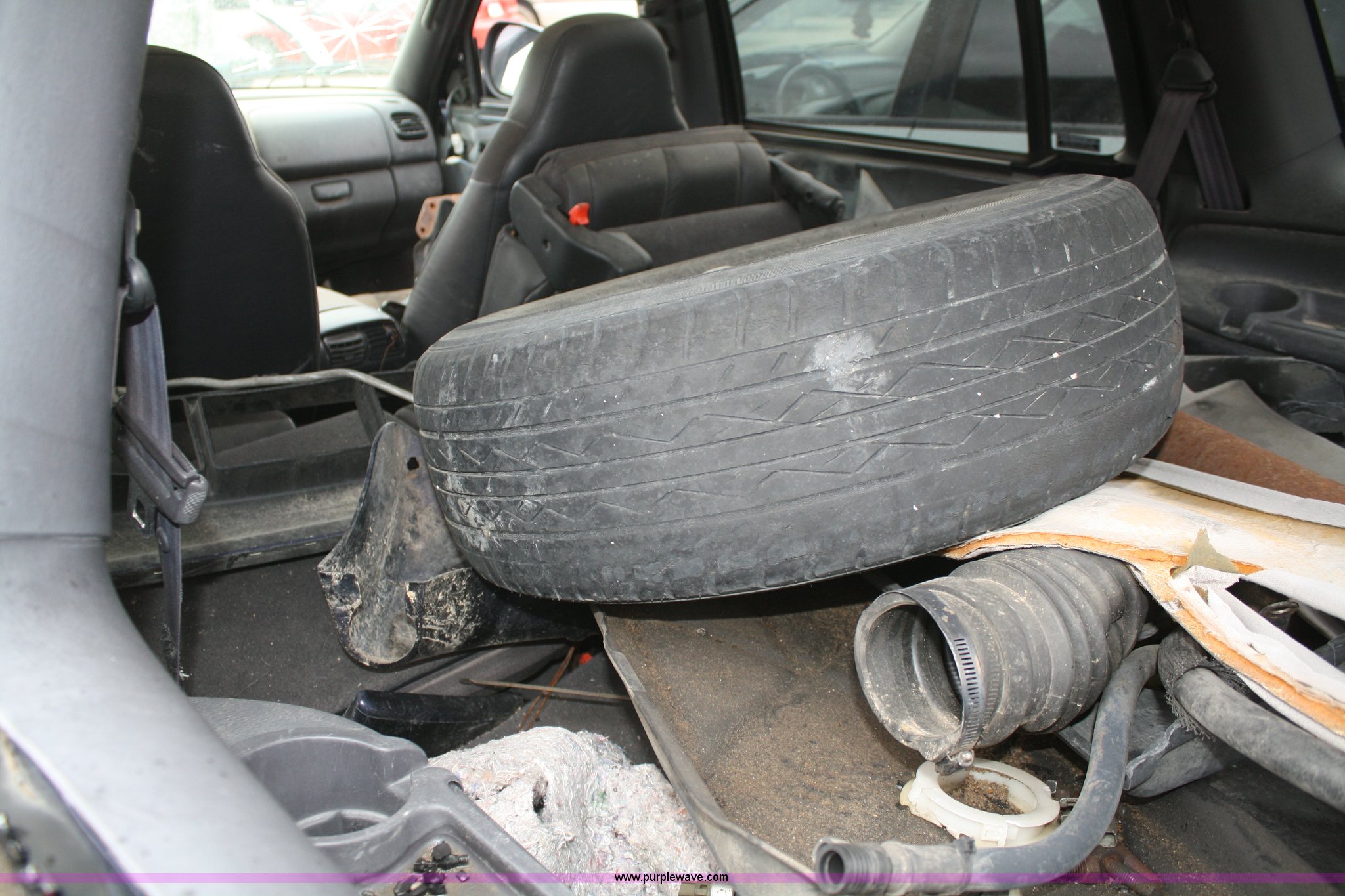 Purple Wave is selling a used Passenger Vehicle in Kansas. This item is a 1999 Dodge Durango SLT SUV with the following: Unknown mileage, No engine, Automatic transmission, AC and heat, Tilt, Cruise, Vinyl interior, 265/70R15 tires, Interior/exterior cosmetic damage, No keys, Dead battery, Driver window missing, Rear driver window broken out, Stereo missing, Side door panels missing, Cracked windshield, Rear window missing, AV# 0138