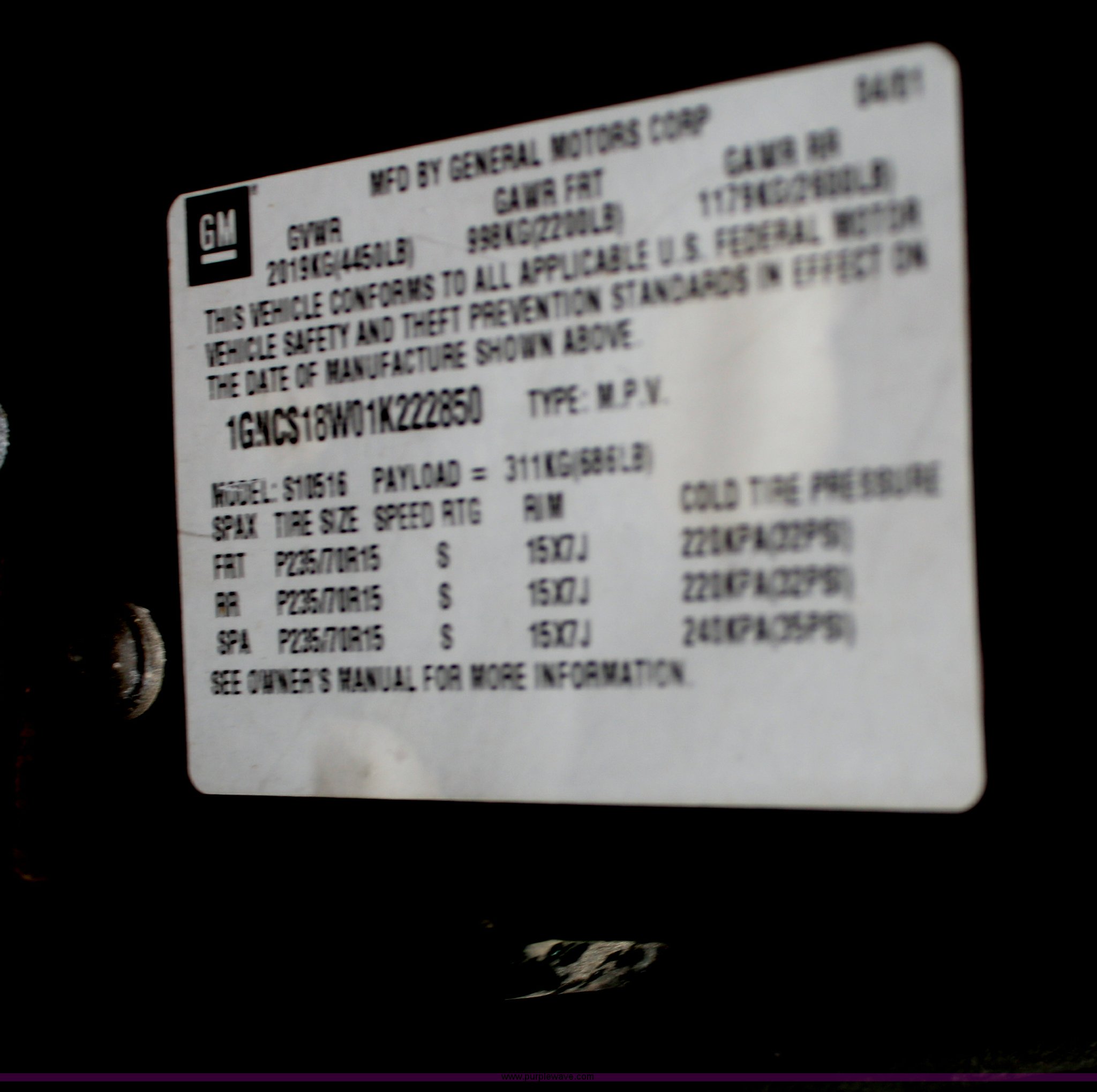 2001 Chevrolet Blazer LS SUV. Unknown mileage, 4.3L V6 CPI engine, Automatic transmission, AC and heat, Tilt, Cruise, AM/FM/CD, Power windows, locks, and mirrors, Cloth interior, Bug shield, 255/45ZR18 tires, Interior/exterior cosmetic damage, No keys, Dead battery, AV# 0149. Vehicle abandoned. No additional information available. Vehicle is subject to reclaim by original owner until 2 p.m. April, 4.. Buyer will received paperwork indicating the abandoned status of the vehicle and which is sufficient to receive a title.. See removal details below. 1GNCS18W01K222850. NAFI Abandoned Vehicles. Building 7924A 7846 Apennines Dr.. Ft. Riley, KS 66442