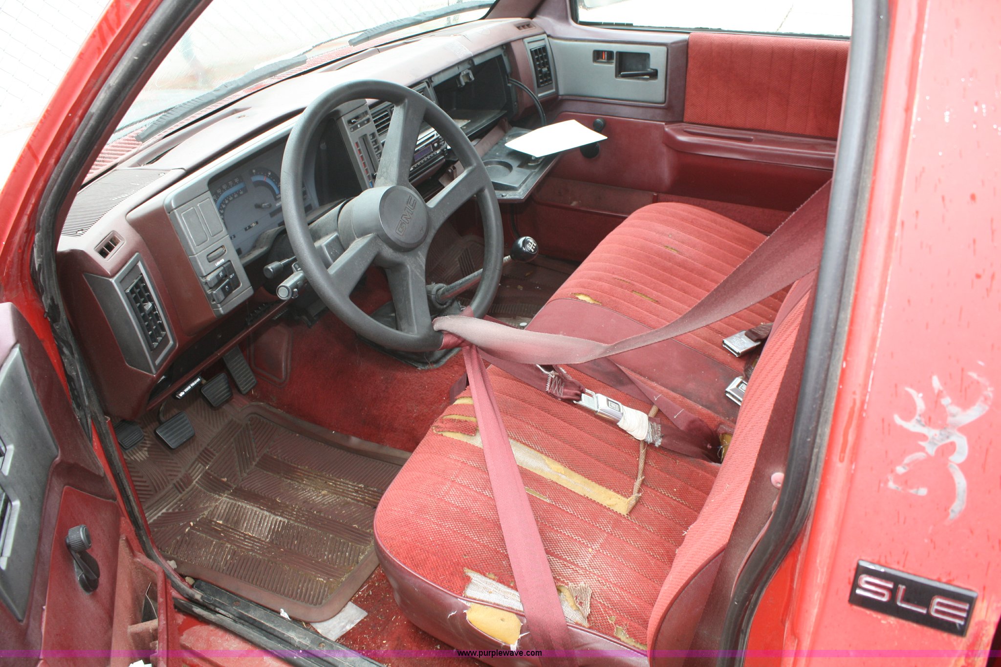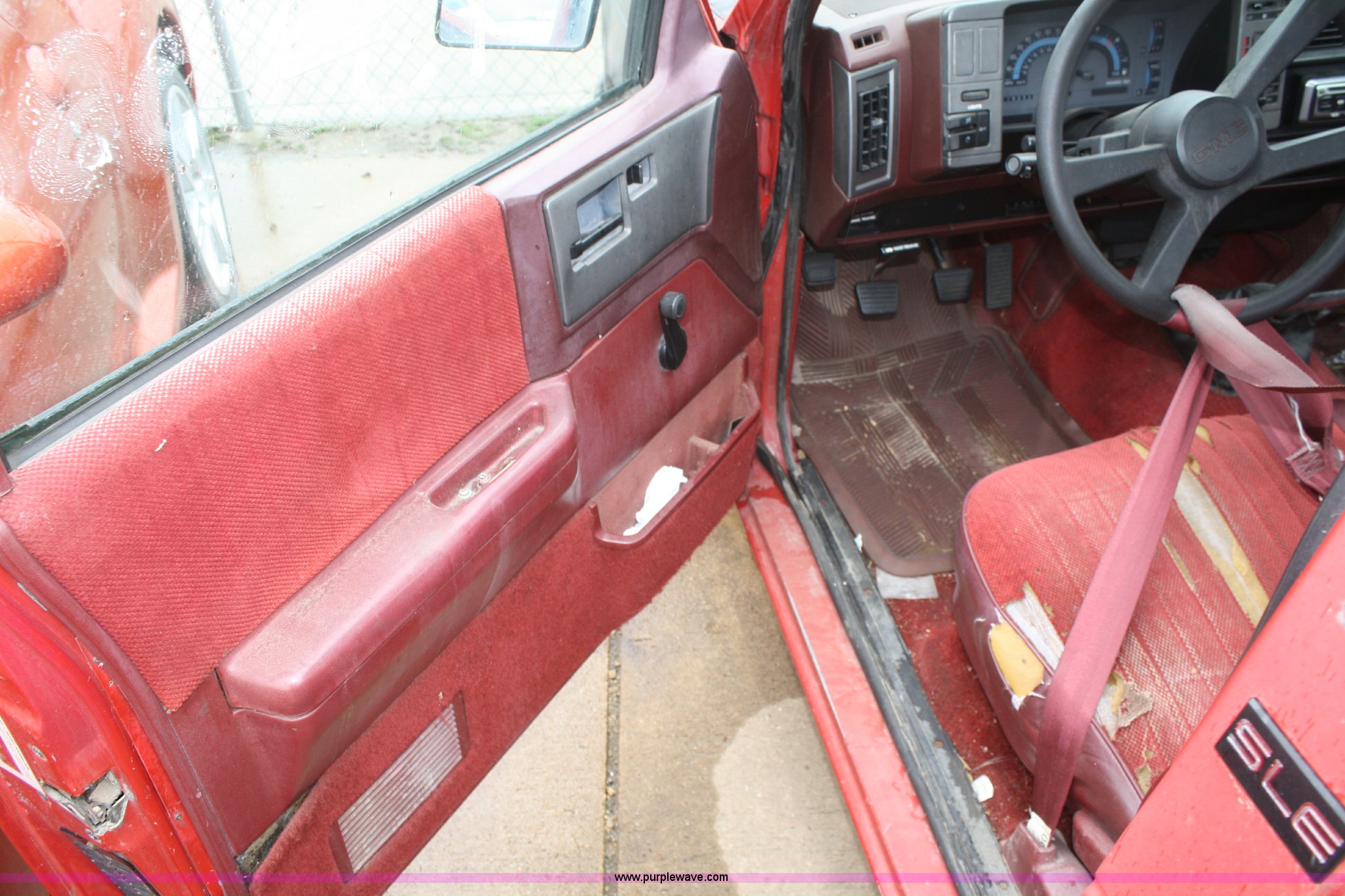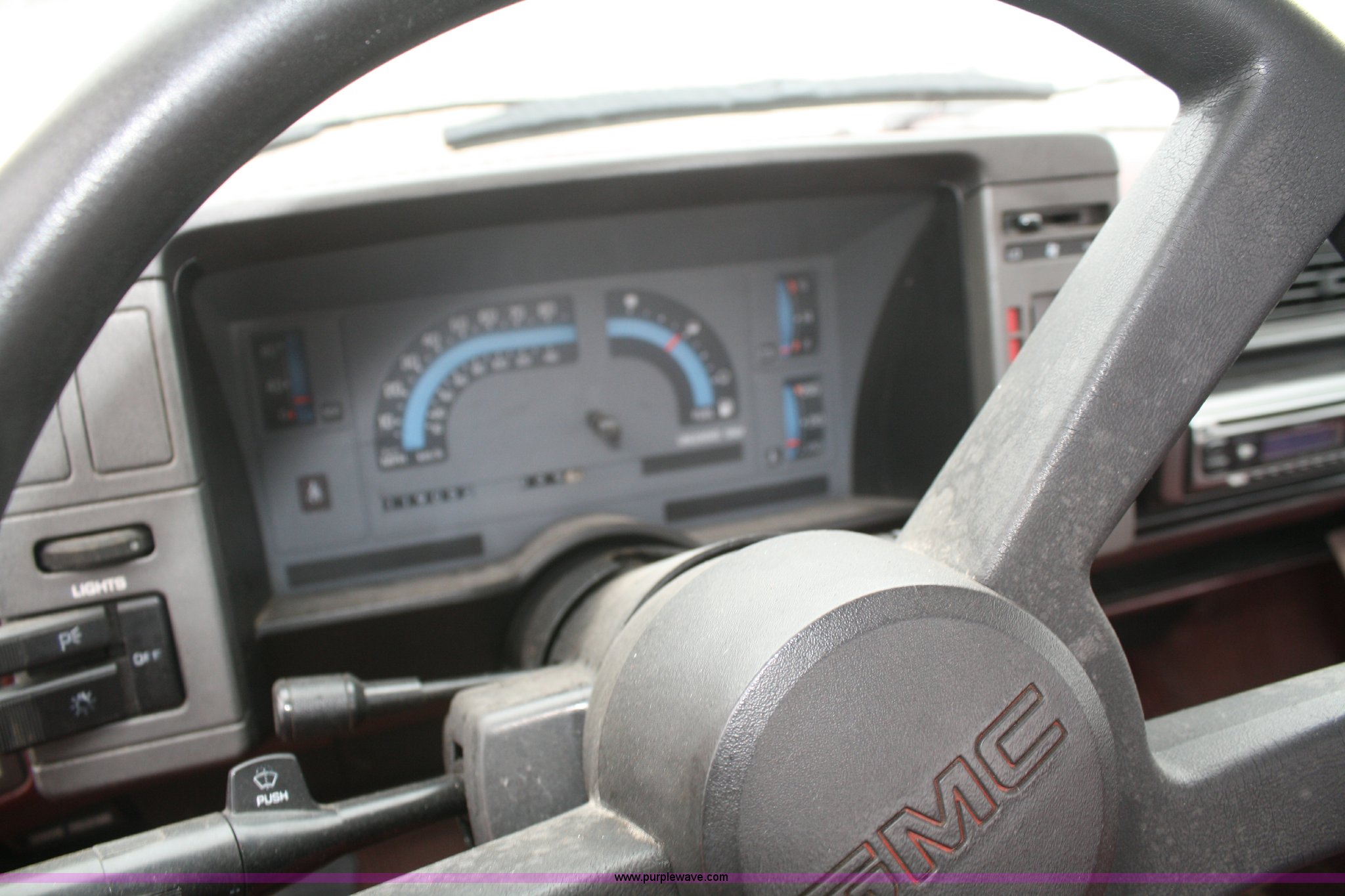 Purple Wave is selling a used Passenger Vehicle in Kansas. This item is a 1991 GMC Sonoma SLE pickup truck with the following: 119,052 miles on odometer, 2.8L V6 FI engine, Five speed manual transmission, AC and heat, Tilt, Cruise, AM/FM/CD, Manual windows and locks, Cloth bench seat, Rear sliding window, Ball hitch, 215/70R15 tires, flat, Interior/exterior cosmetic damage, No key, Dead battery, AV# 0146