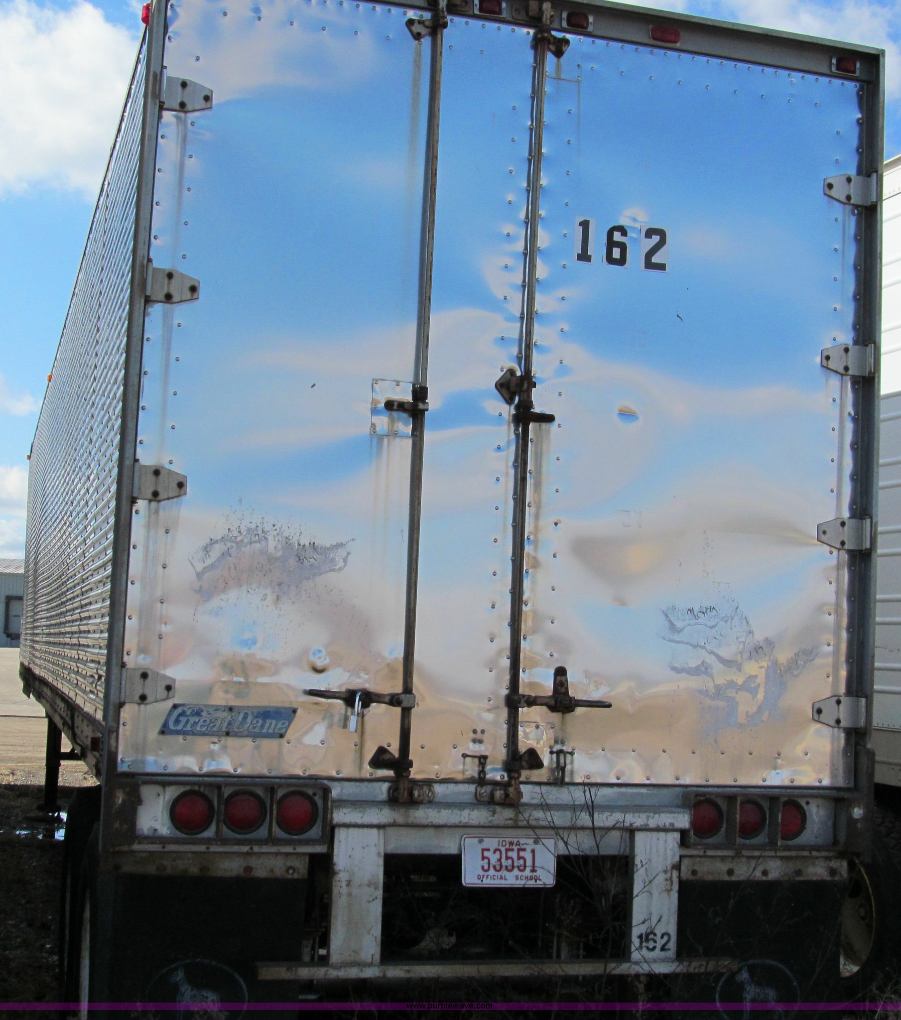 1969 Great Dane 45' van trailer. Steel but wheels, Spring suspension, 22.5 tires, Contents not included. Title distribution may be delayed up to 14 days from verification of funds. 41899. Des Moines Public Schools. 1917 Dean Ave. Des Moines, IA 50316