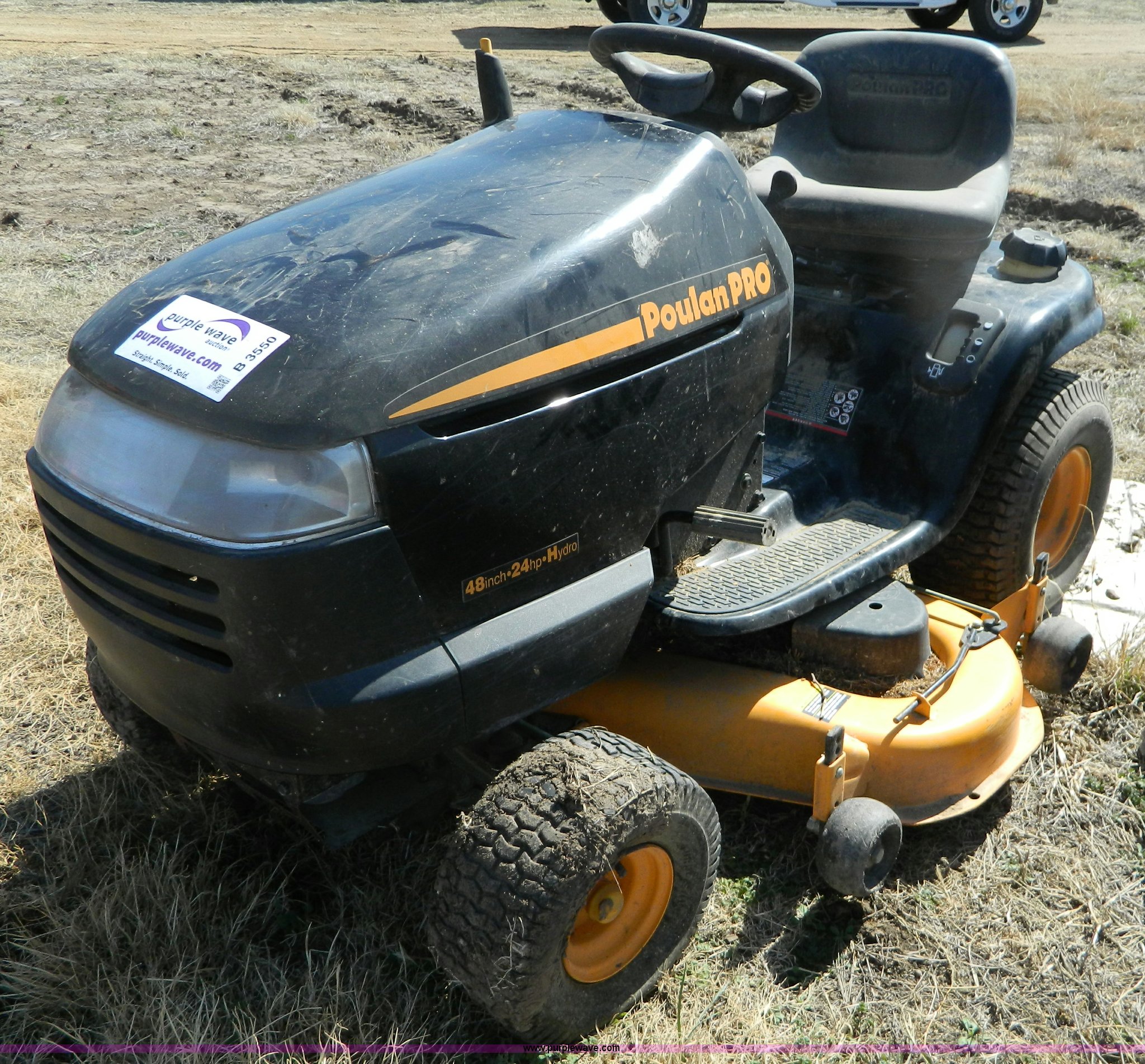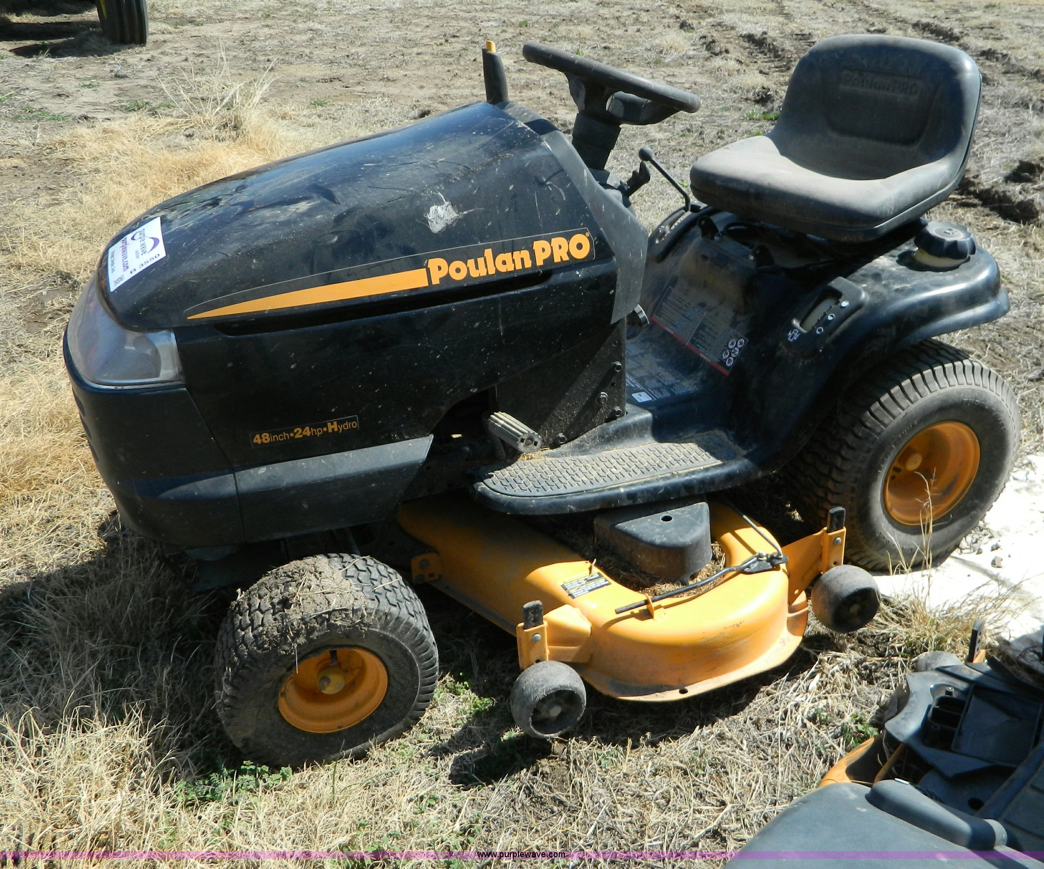 Purple Wave is selling a used Lawn and Garden in Kansas. This item is a Poulan Pro riding mower with the following: 326 hours on meter, 24 hp gas engine, Hydro transmission, 48" deck, Does not run