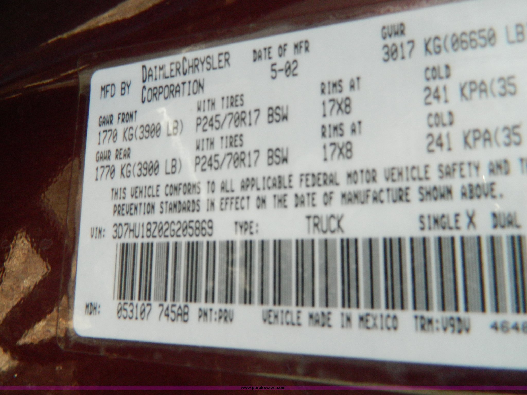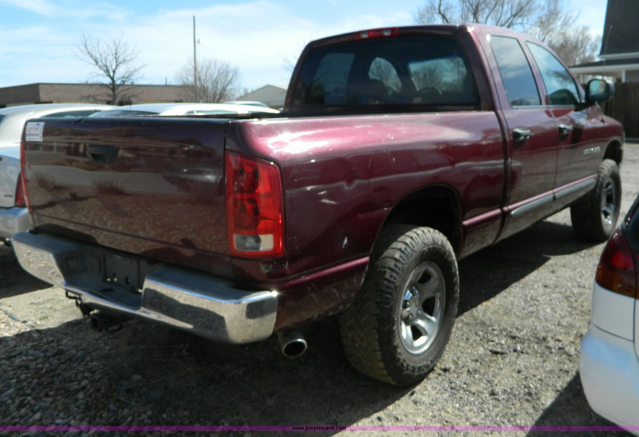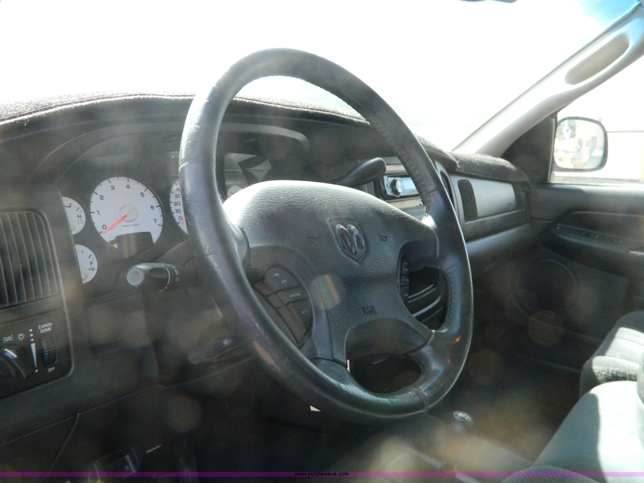 Purple Wave is selling a used 1/2 Ton Pickup or Van in Kansas. This item is a 2002 Dodge Ram 1500 quad cab pickup truck with the following: 129,310 miles on odometer, 5.9L V8 MPI gas engine, Automatic transmission, Four wheel drive, AC and heat, Tilt, Cruise, AM/FM/CD, Power windows, locks, and mirrors, Cloth interior, Brake controller, LT285/70R17 tires, Lamp out light on, Interior/exterior cosmetic damage