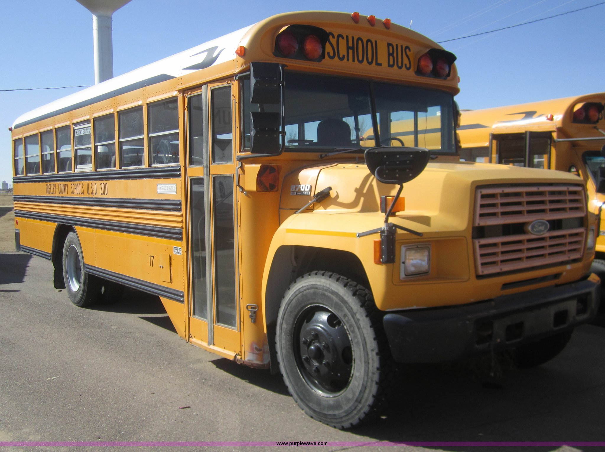 Purple Wave is selling a used Bus in Kansas. This item is a 1994 Ford Bluebird B700 school bus with the following: 194,769 miles on odometer, 42 passenger, Cummins ISB 5.9L diesel engine, Automatic transmission, Heater, AM/FM radio, 10R22.5 tires, Torque converter out, Will need to be hauled, Piston #6 scarred, Bus# 17