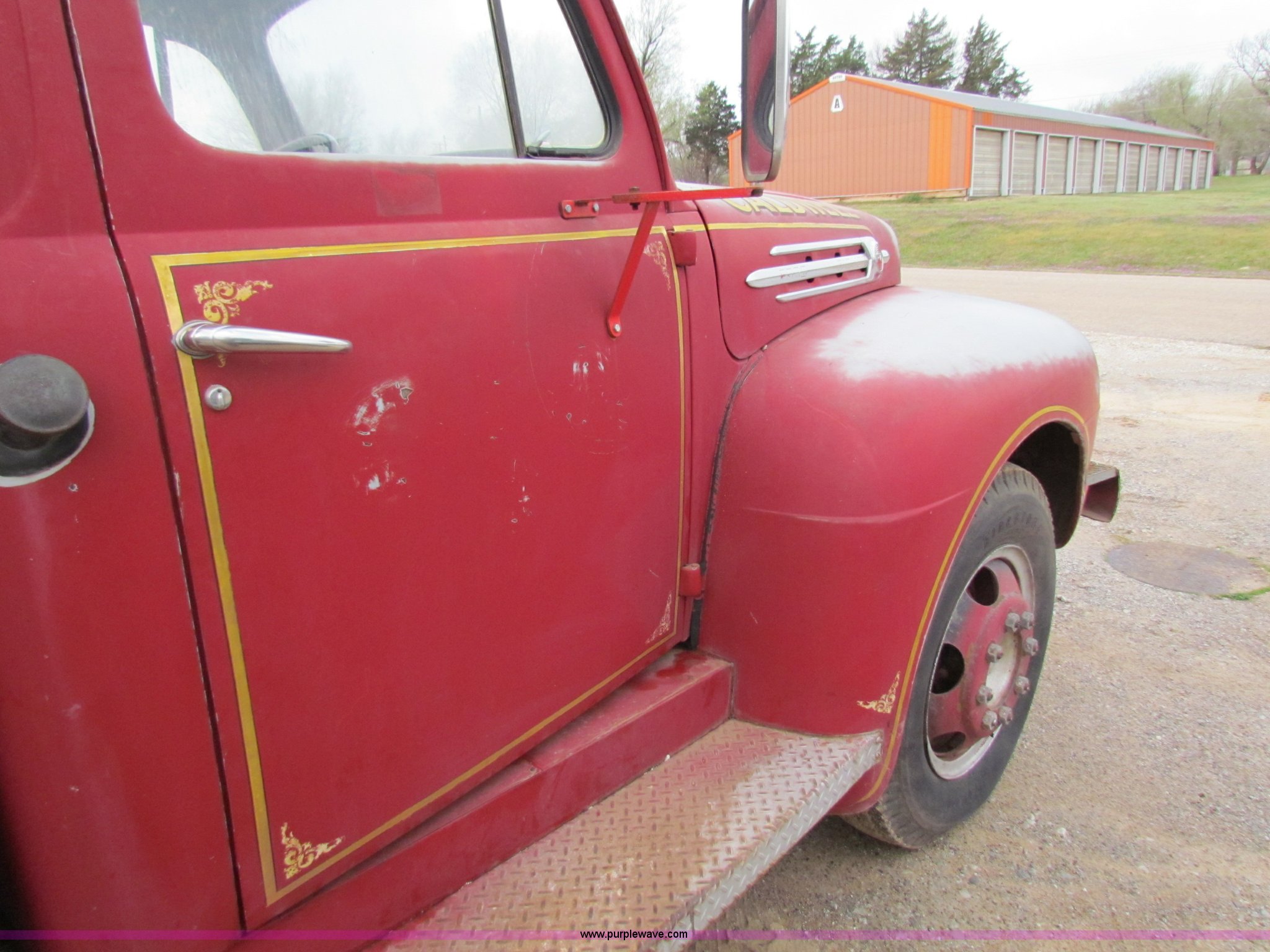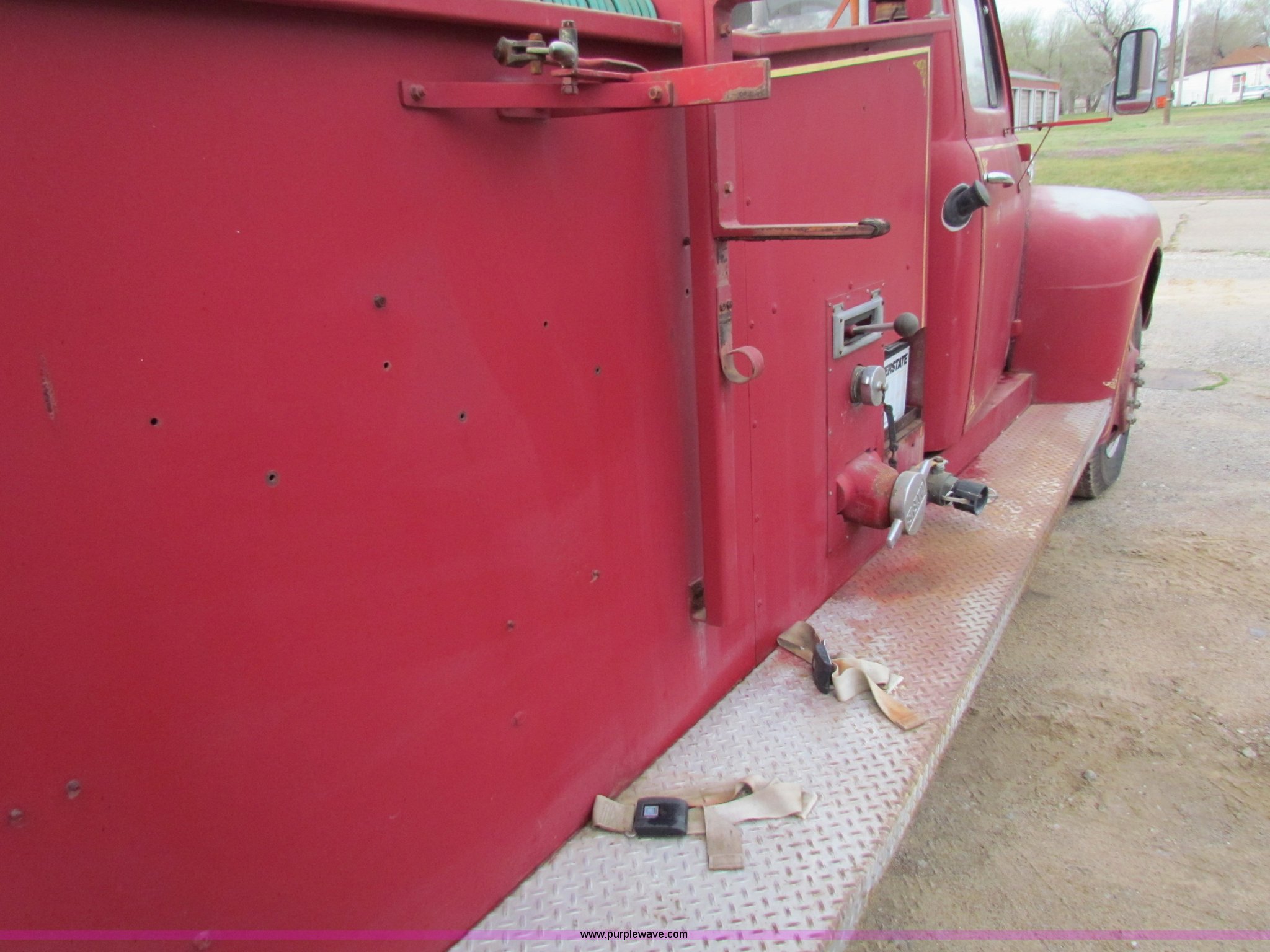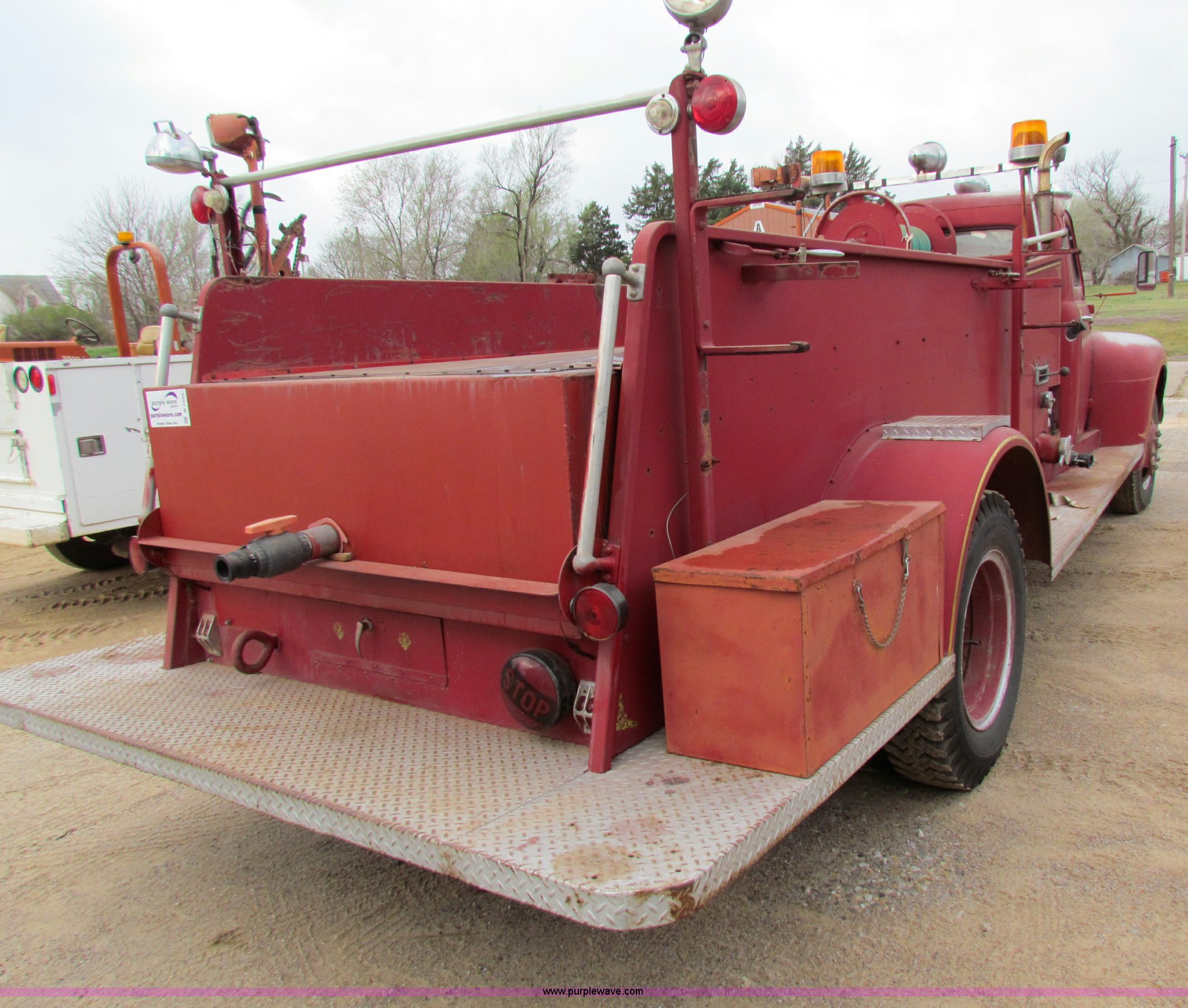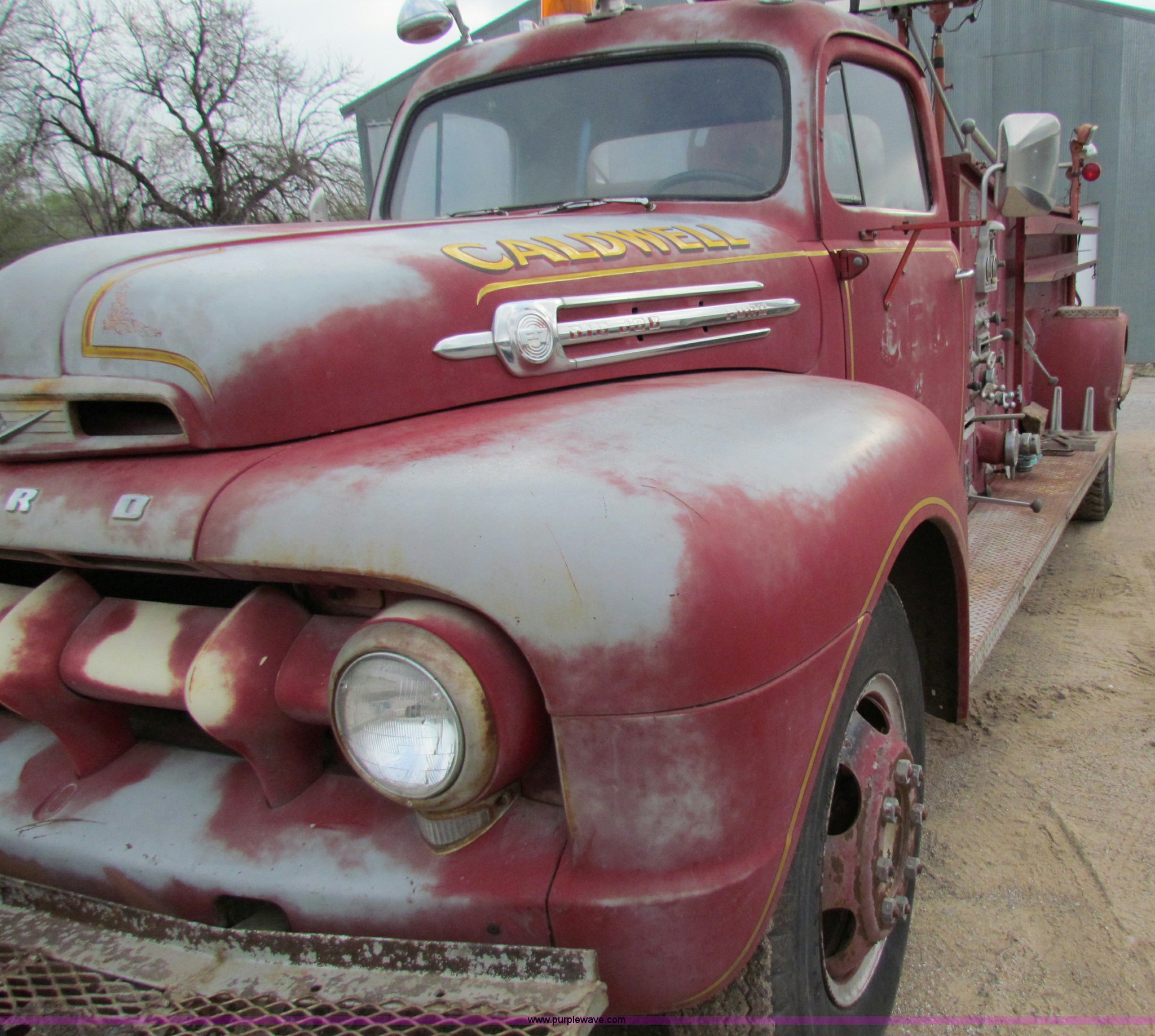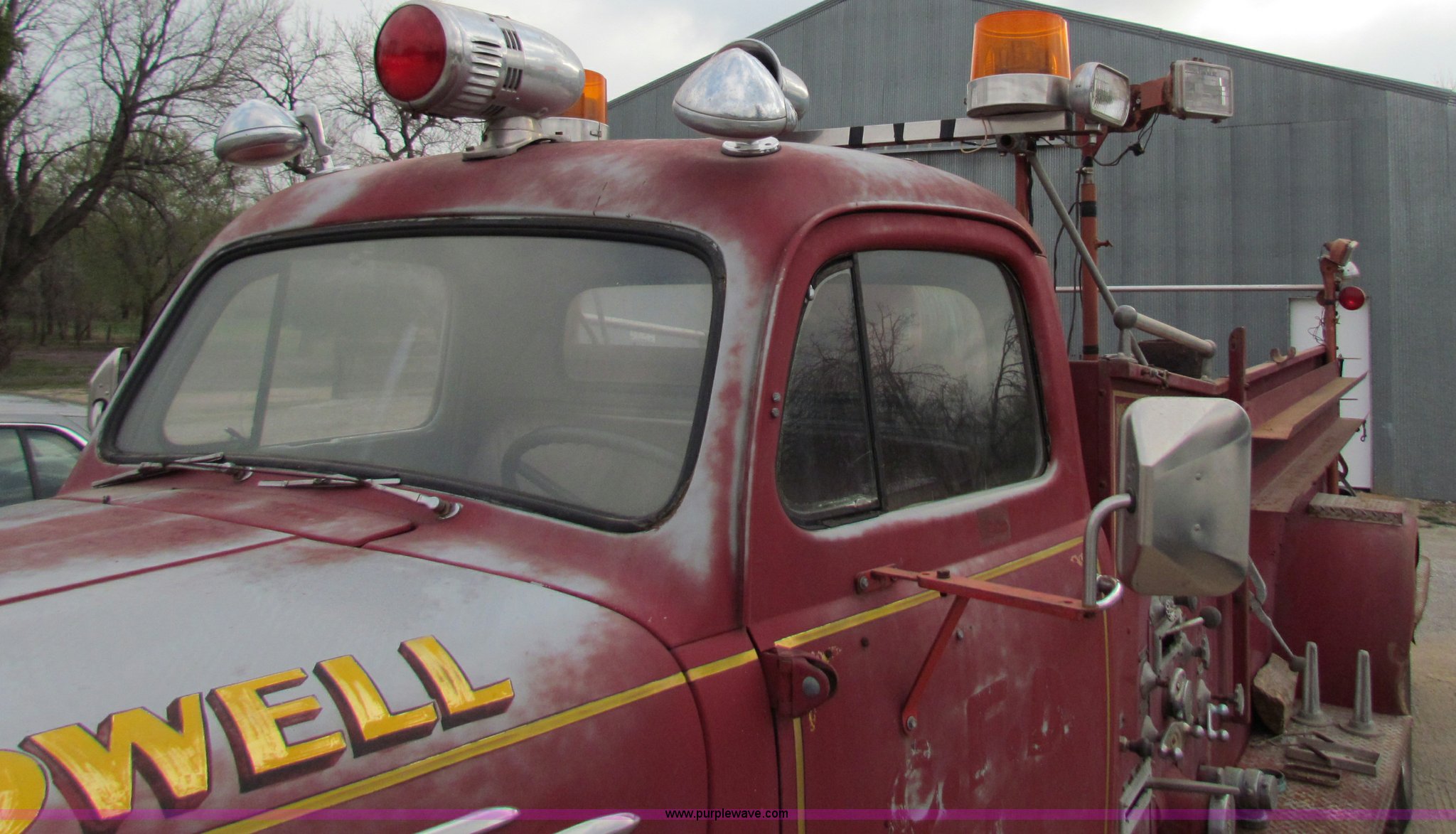 Purple Wave is selling a used Fire Truck or Emergency Vehicle in Kansas. This item is a 1952 Ford F-7 Big Job fire truck with the following: 9,692 miles on odometer, V8 Cargo King gas engine, Four speed manual transmission, 750 gallon tank, Engine driven pump, Front hose reel, 8.25-20 tires, Working siren, Brakes need work