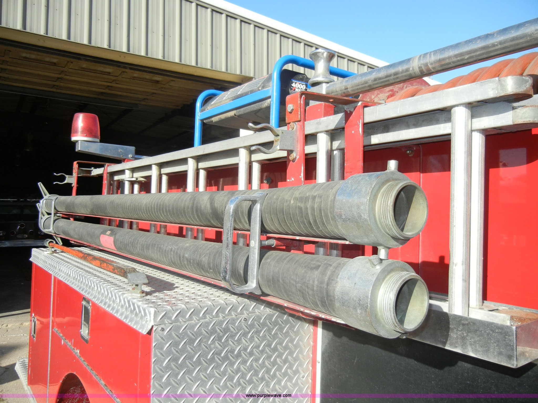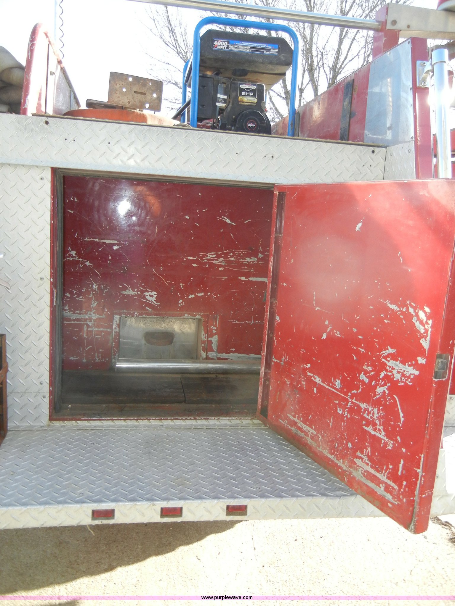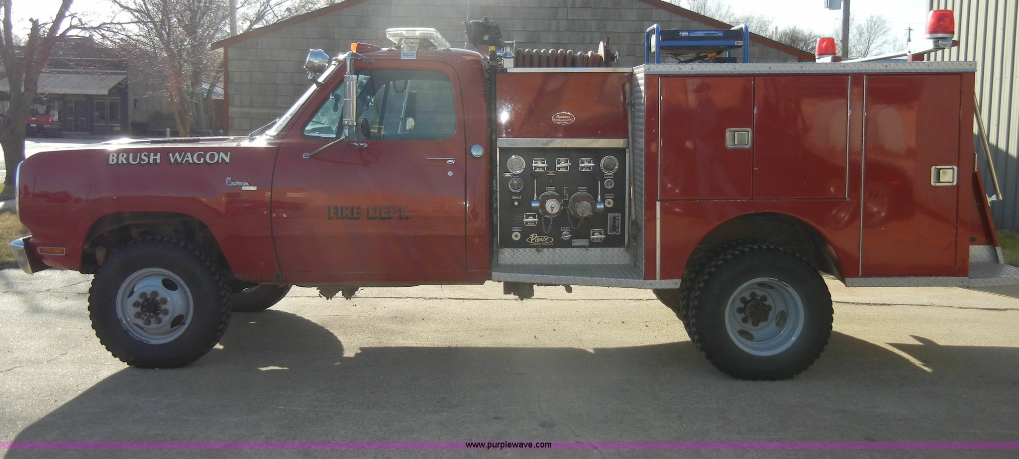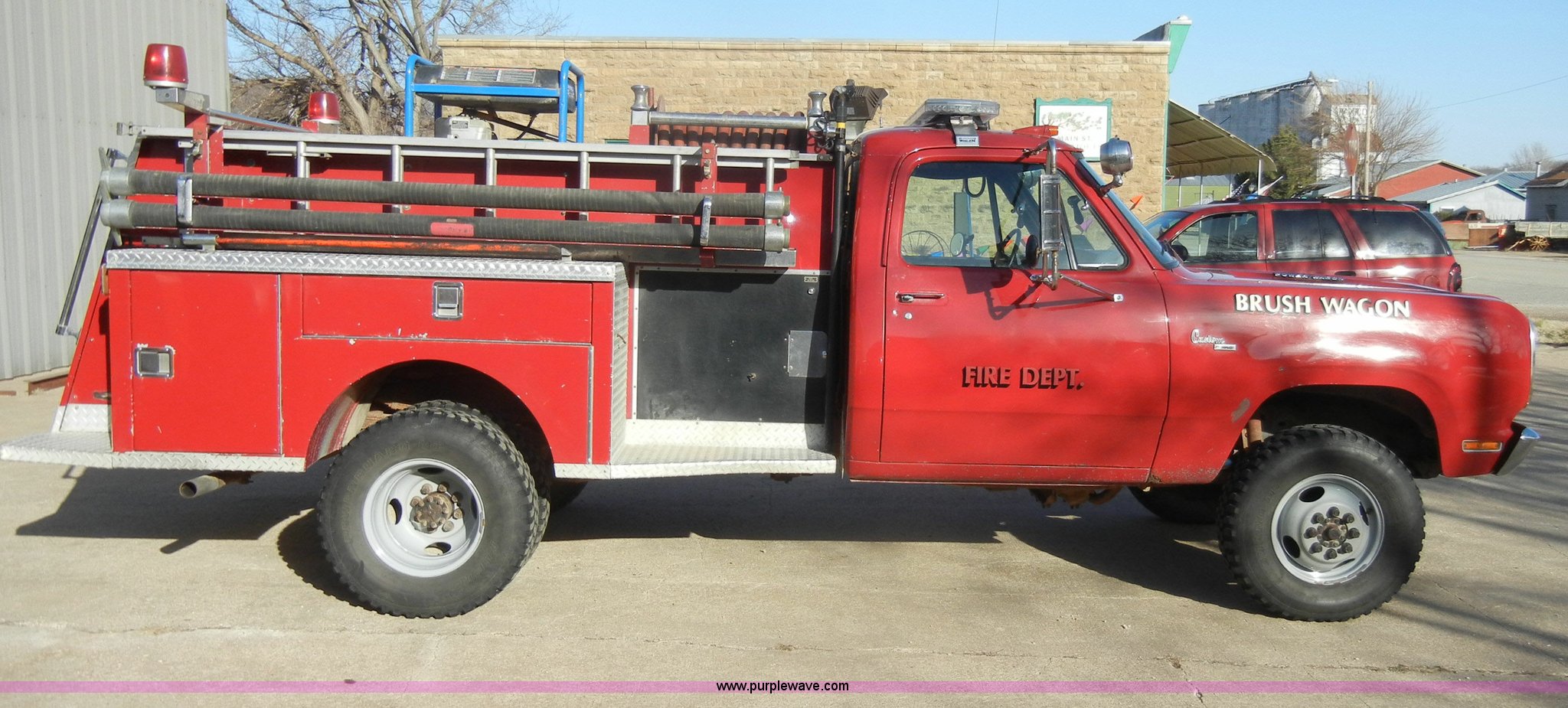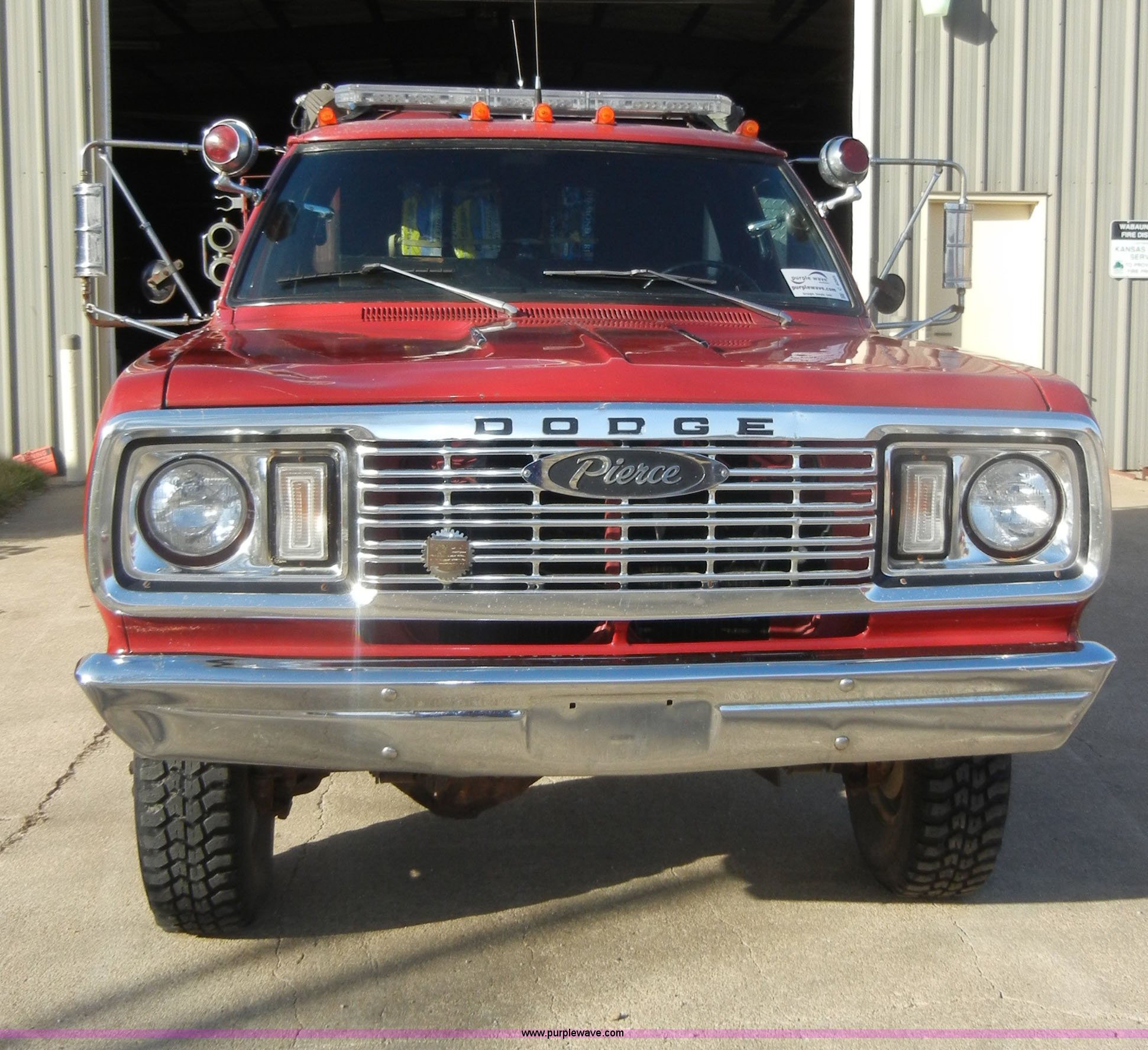 Purple Wave is selling a used Service Truck in Kansas. This item is a 1977 Dodge Pierce Custom 400 Power Wagon firetruck with the following: 35,887 miles on odometer, Odometer inoperable, Mileage will vary, 360 V8 gas engine, Four speed manual transmission, Four wheel drive, Heater, Manual windows and locks, Vinyl seat with cover, Aluminum utility/fire bed, 4,000 watt generator, 100' hose with reel, 300 gpm Waterous PTO pump, 300 gallon fiberglass tank, Model CPK-2, Serial 49343, (2) 2.5" x 8'L hard suction hoses, 8' extension ladder, Light bar, (2) 500 watt scene lights, 235/85R16 tires, Items not included, Siren, radio units, contents in utility boxes, fire hoses, ax, and fire extinguishers, Interior/exterior cosmetic damage, Dents and scratches, Paint peeling, Body rust