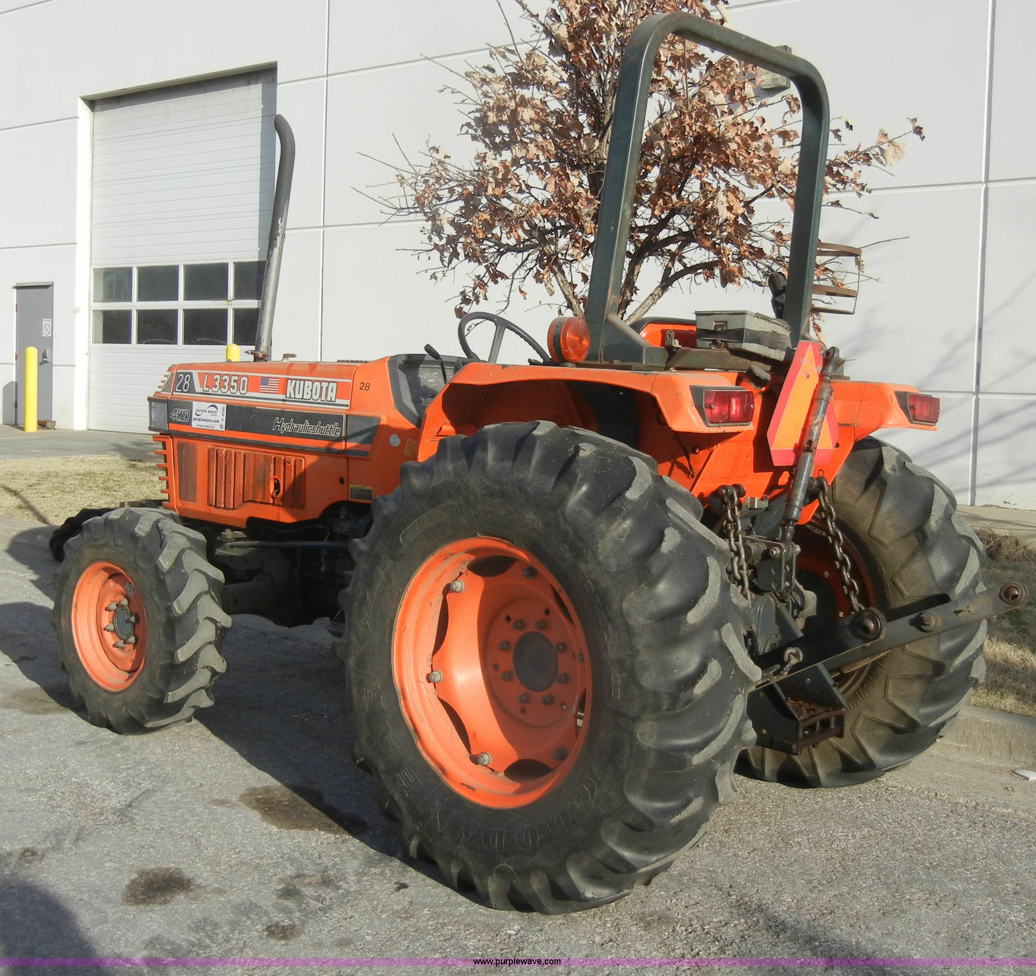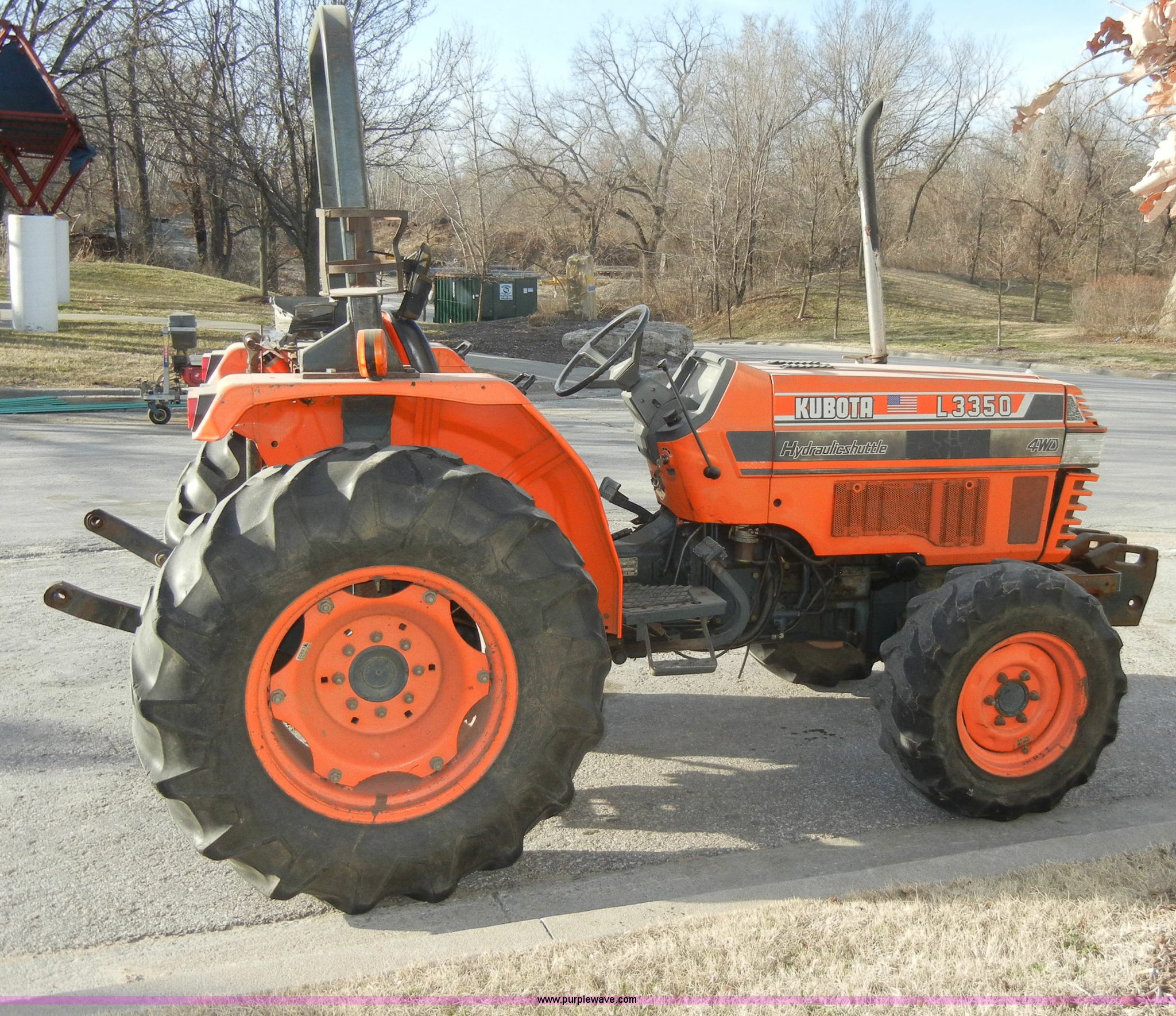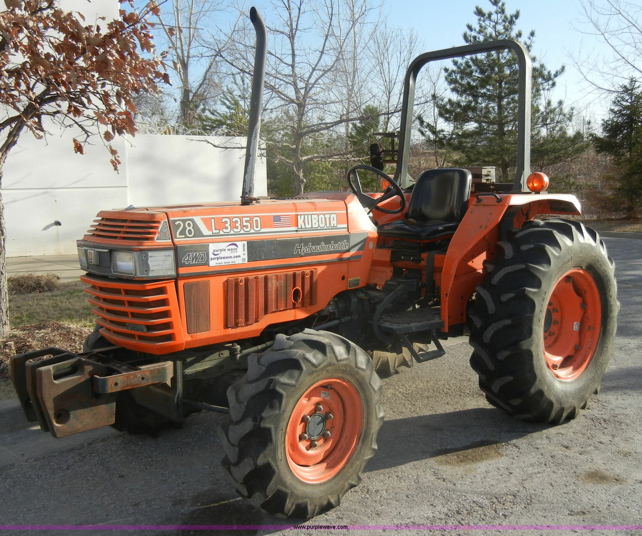 Purple Wave is selling a used Tractor in Kansas. This item is a 1986 Kubota L3350 MFWD tractor with the following: 1,550 hours on meter, 33 HP diesel engine, Hydraulic shuttle, 16F-8R gears, Open cab, Three point, Draw bar, 540 PTO, Front weights, 9.5-16 front tires, 14.9-24 rear tires, Rear spare tire, Leaks fuel, Serial L3350DT-50079