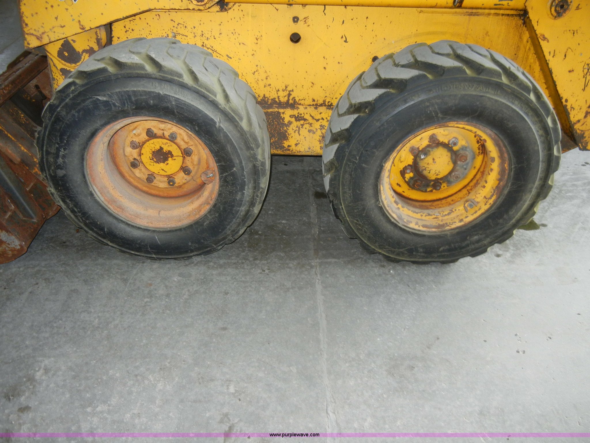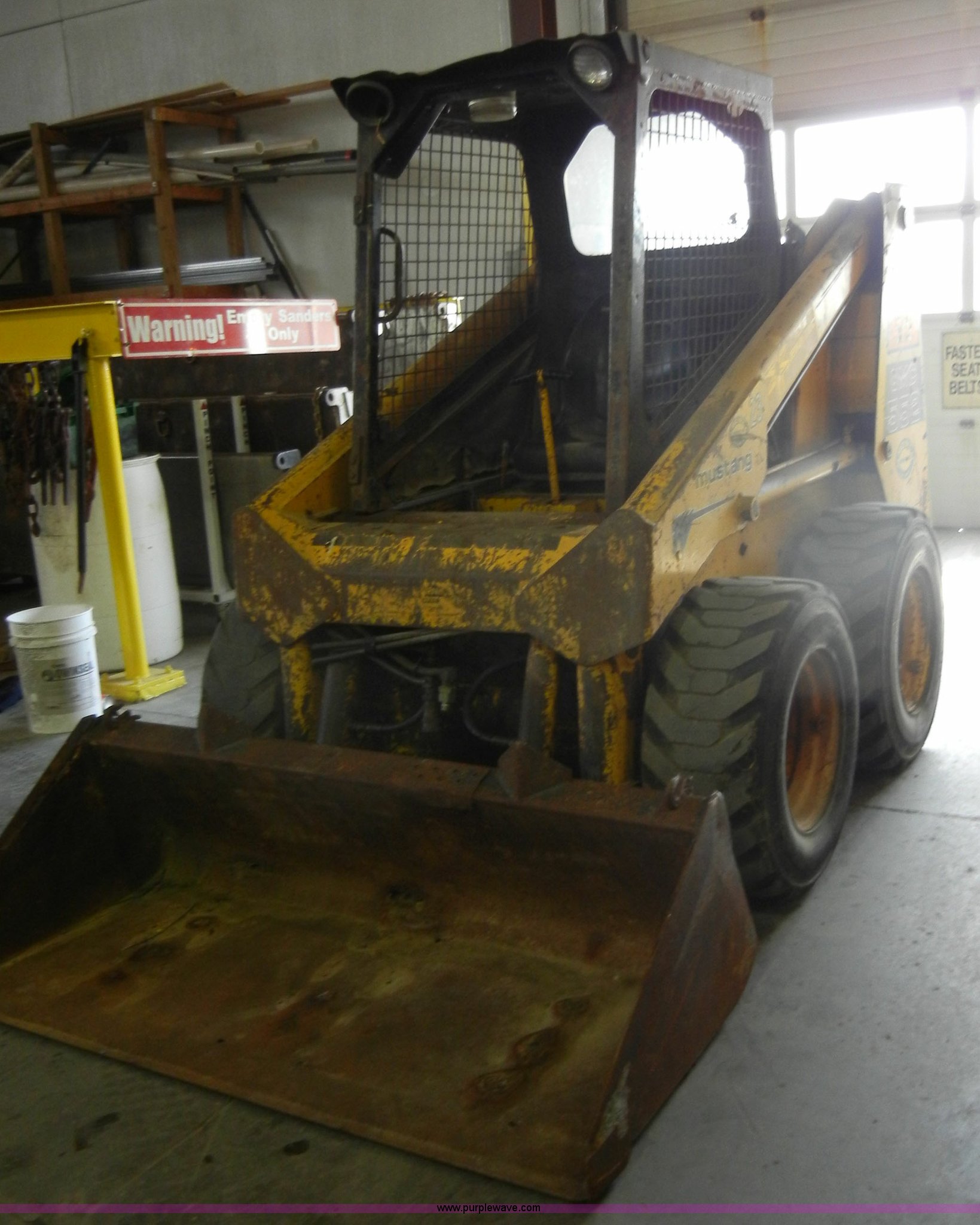 Purple Wave is selling a used Skid Steer Loader in Kansas. This item is a 1986 Mustang OMC552 skid steer with the following: 1,762 hours on meter, 57 HP diesel engine, Foot pedals and single joystick, 67" bucket, Cosmetic damage, Hydraulics, 12-16.5 tires, Spare tire, GVWR 7,000 lbs, Controls are weak, Parking brake inoperable