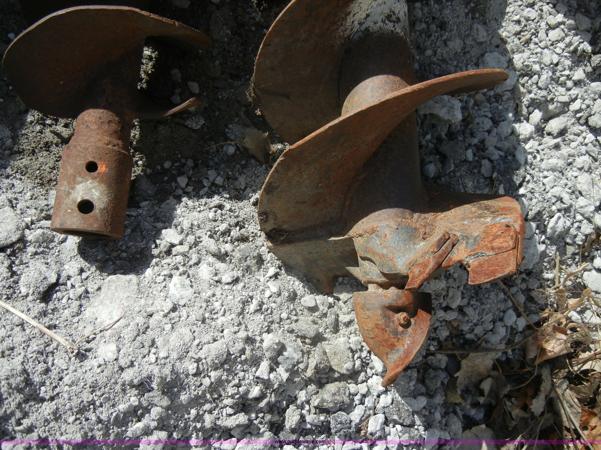 McMillen skid steer auger. (3) round head auger bits 4' x 18" diameter, 42" x 8.5" diameter, 44" x 11.5" diameter, Hydraulics, Pin attach, Attaches to item C4096. 6901 Knox. Merriam, KS 66203