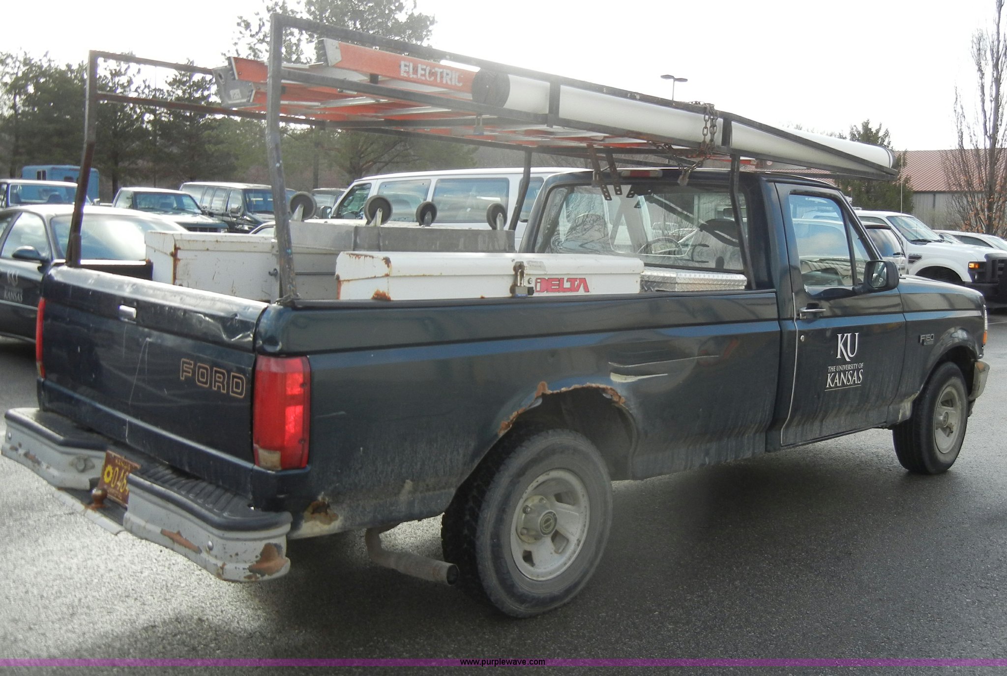 Purple Wave is selling a used Passenger Vehicle in Kansas. This item is a 1995 Ford F150 XL pickup truck with the following: 58,751 miles on odometer, Mileage may vary, 4.9L I6 EFI engine, Automatic transmission, AC and heat, AC does not work, AM/FM, Manual windows and locks, Cloth bench seat, (3) truck bed toolboxes, Headache/ladder rack, Ball hitch, 235/75R15 tires, Contents not included, Interior/exterior cosmetic damage, Dents and scratches, Body rust